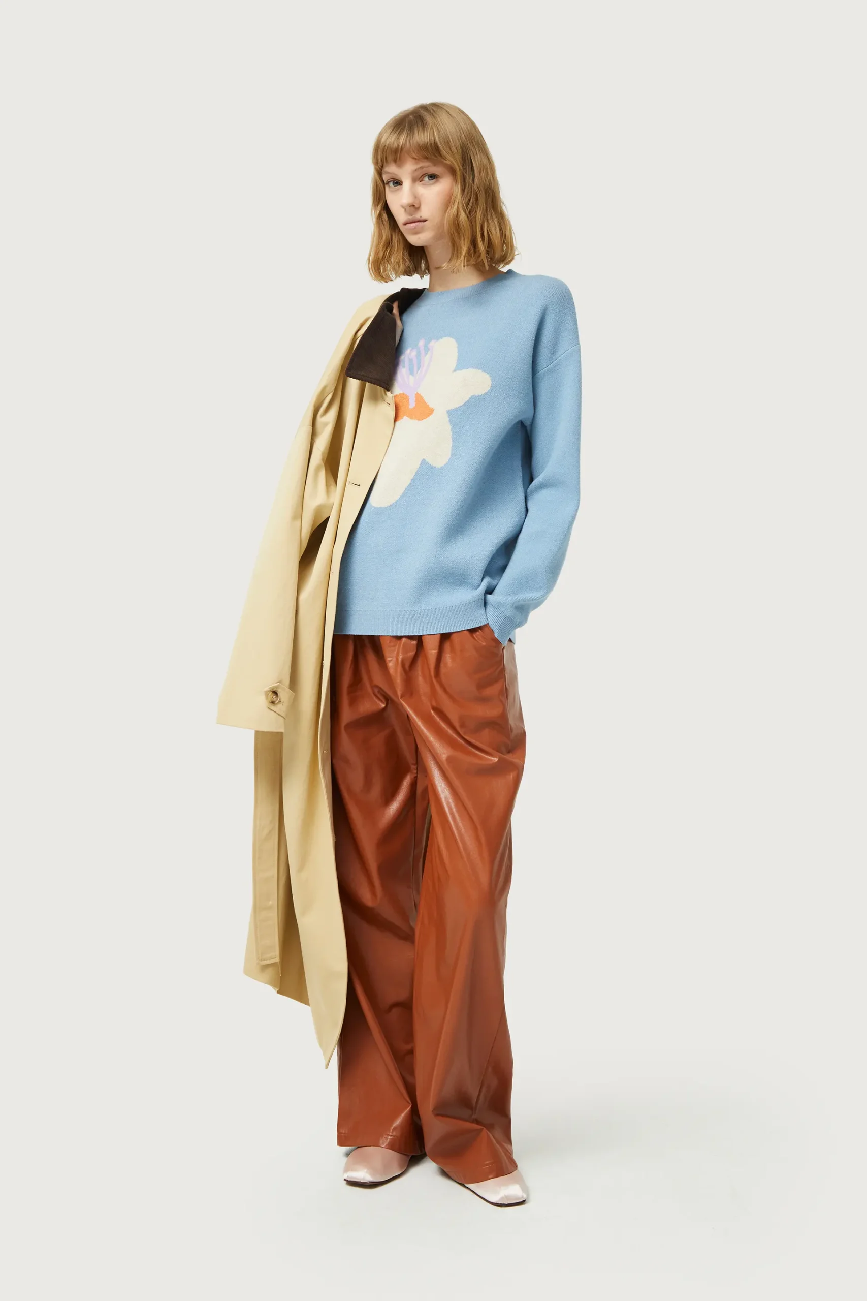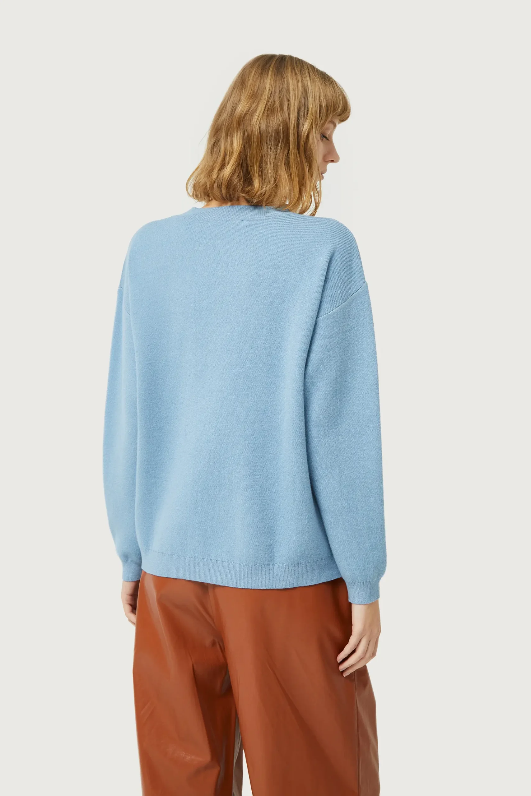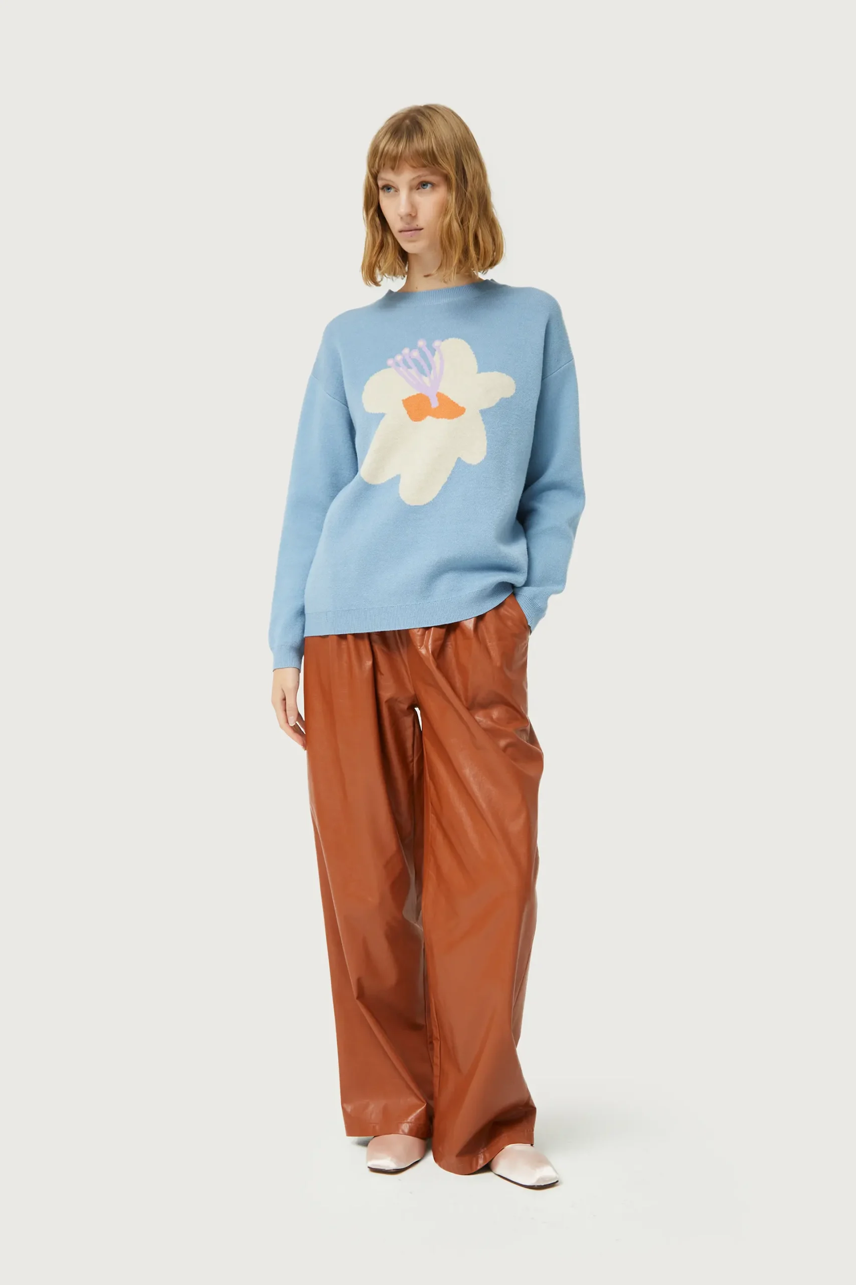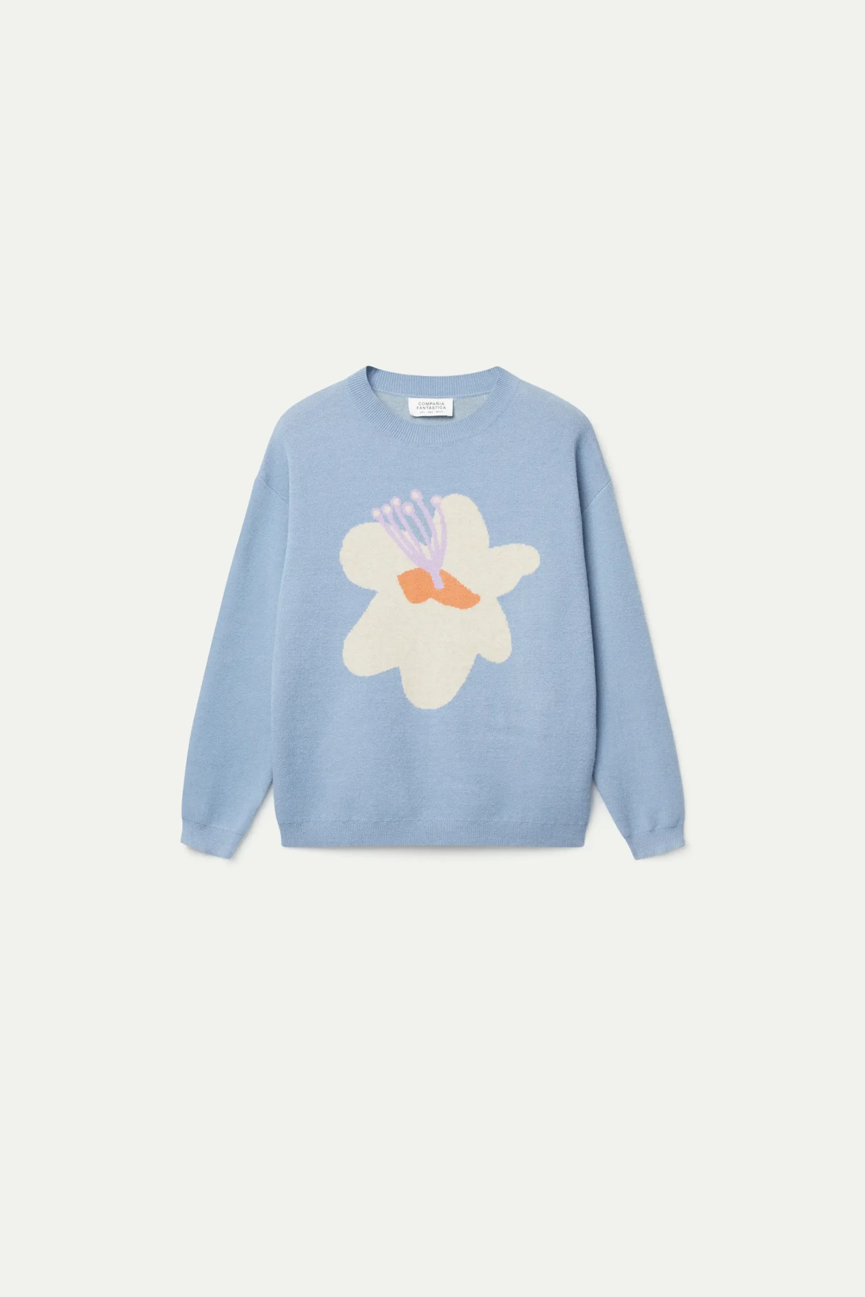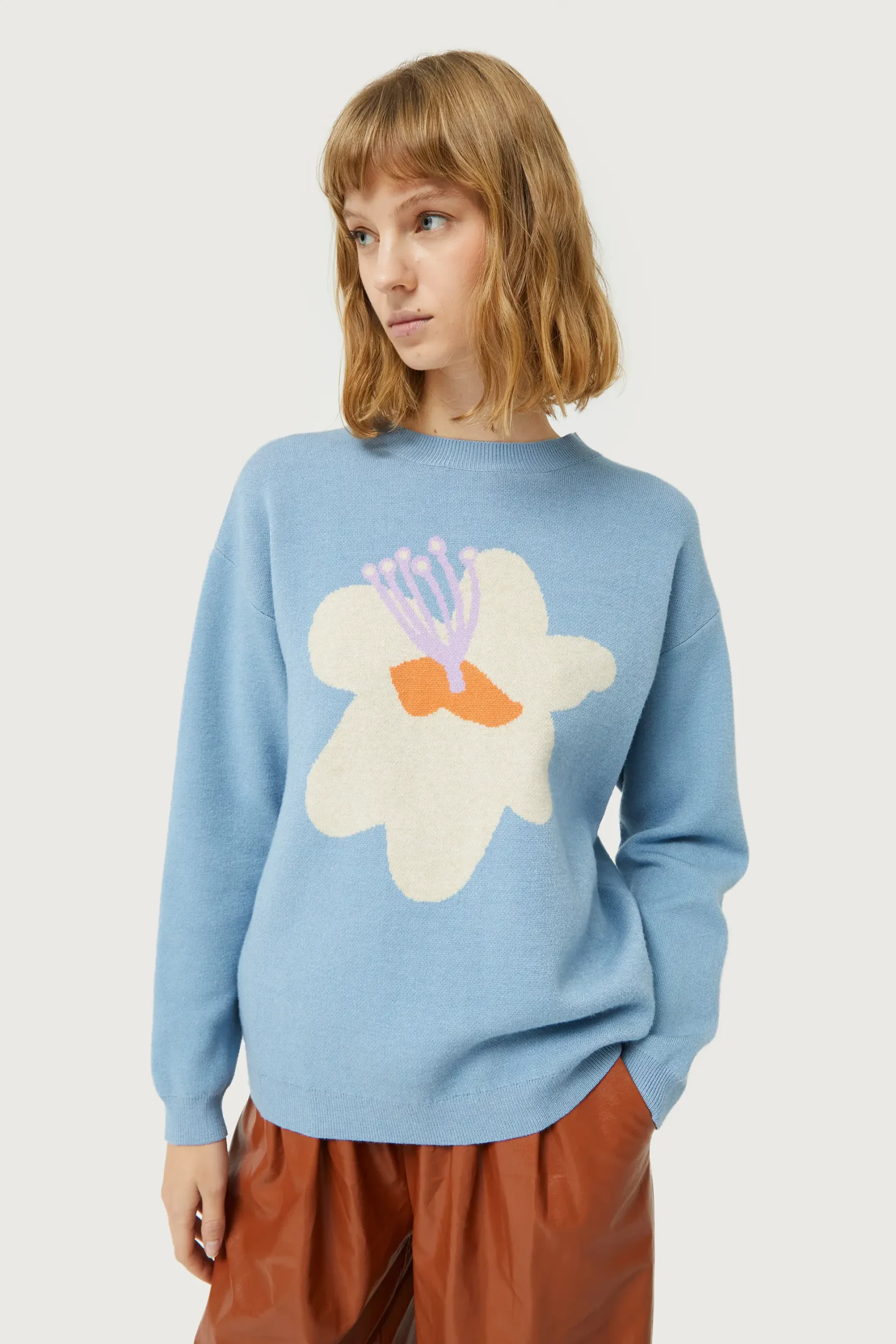 Jersey de punto jacquard de color azul con estampado gráfico de flor blanca y amarilla. Con cuello redondo y manga larga. Detalle de acabados en canalé. La modelo mide 177 cm y lleva la talla S.