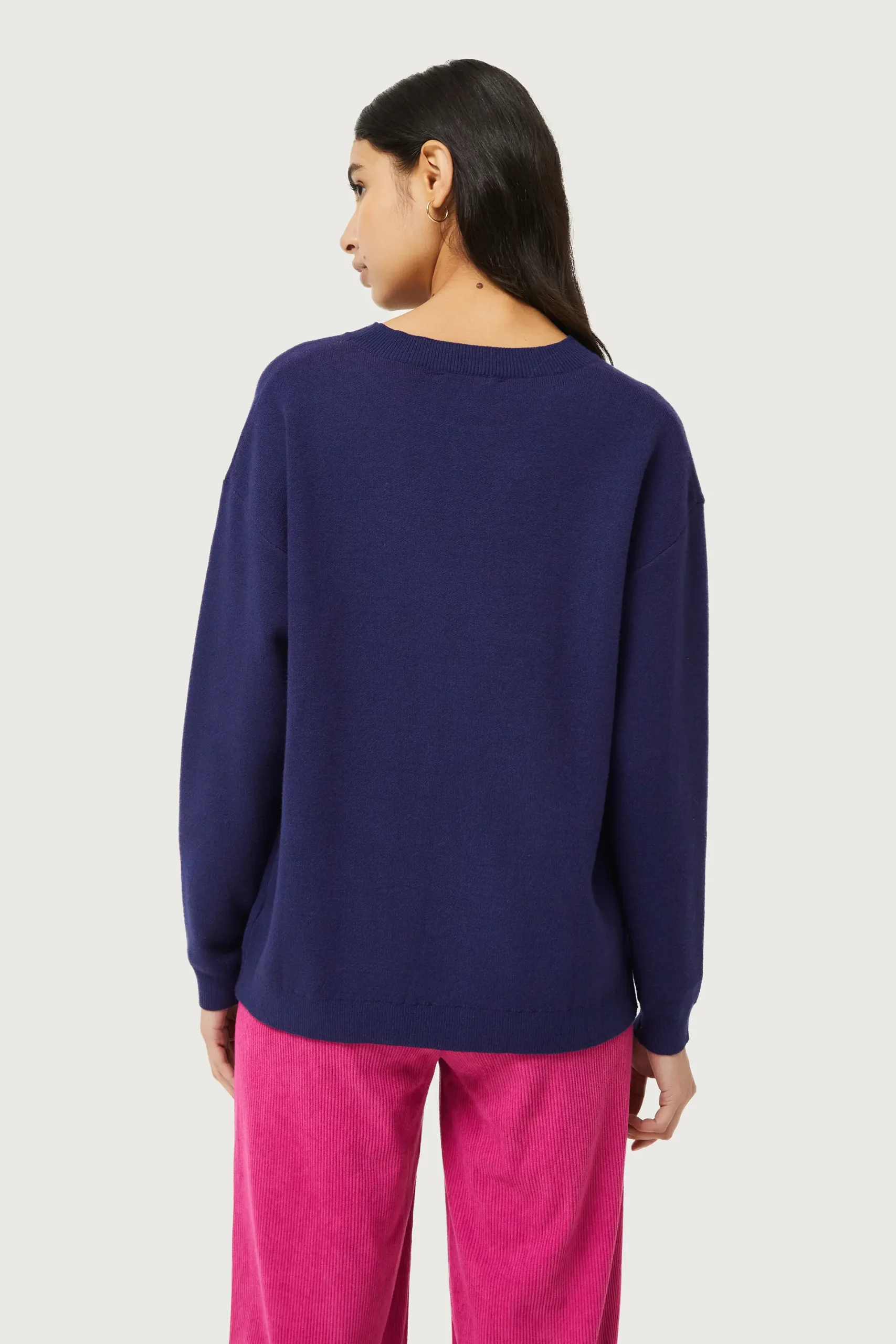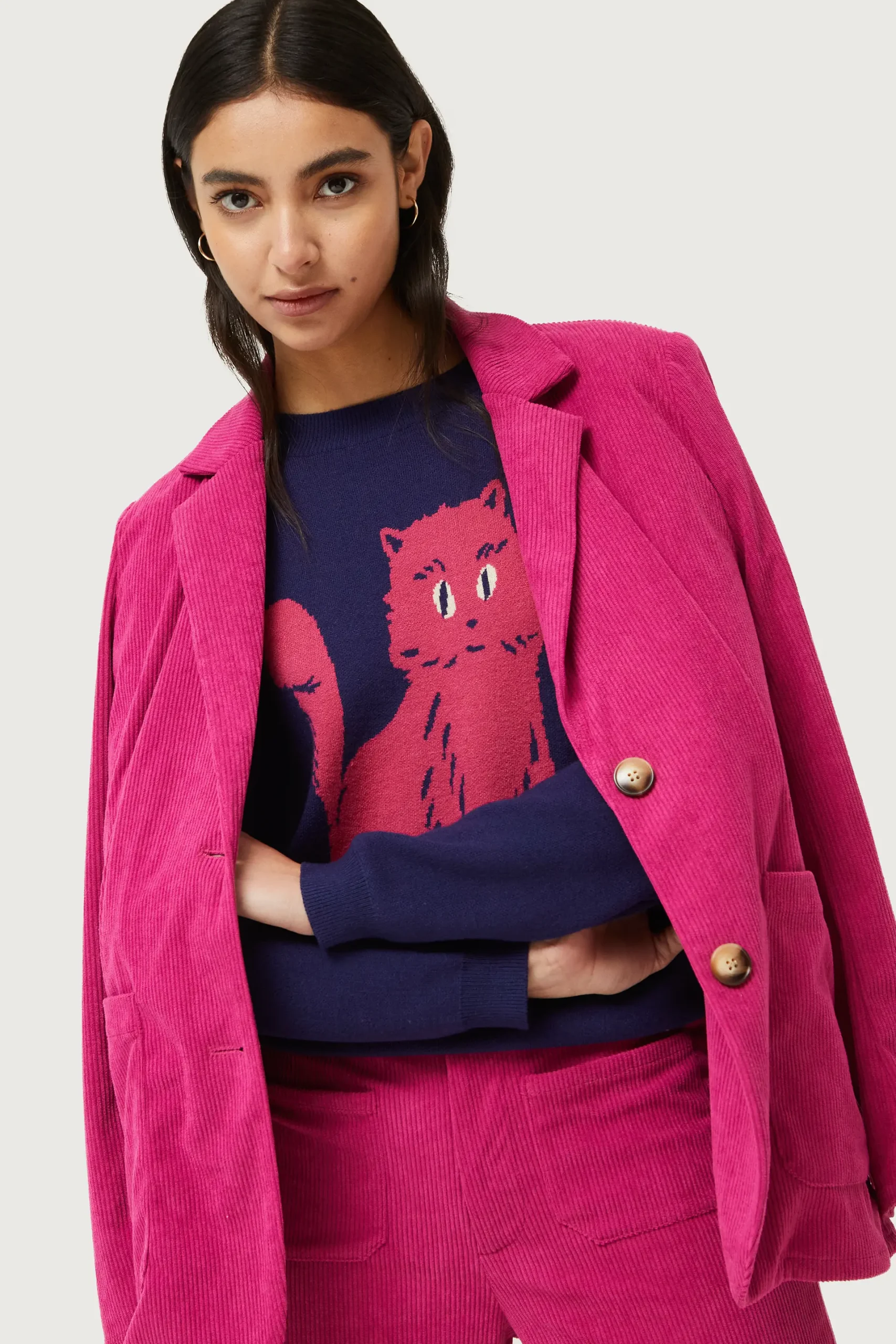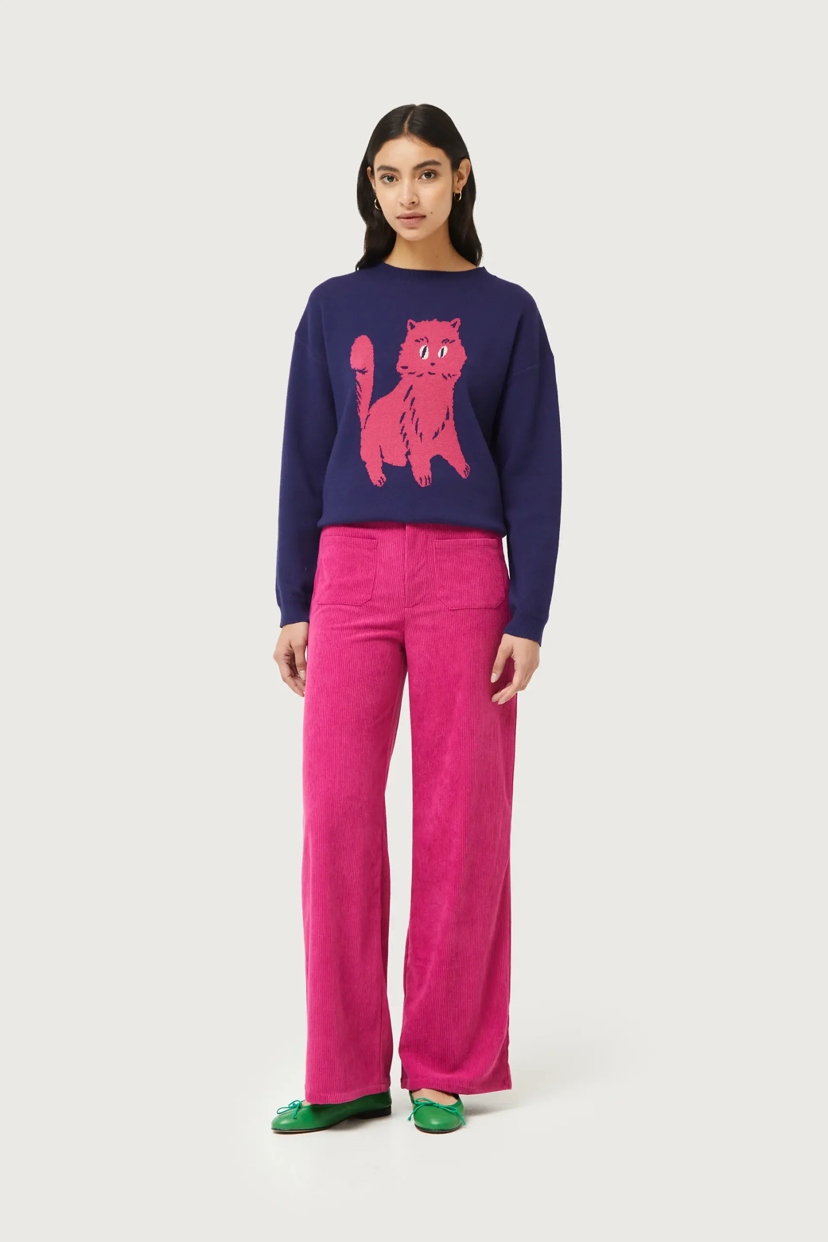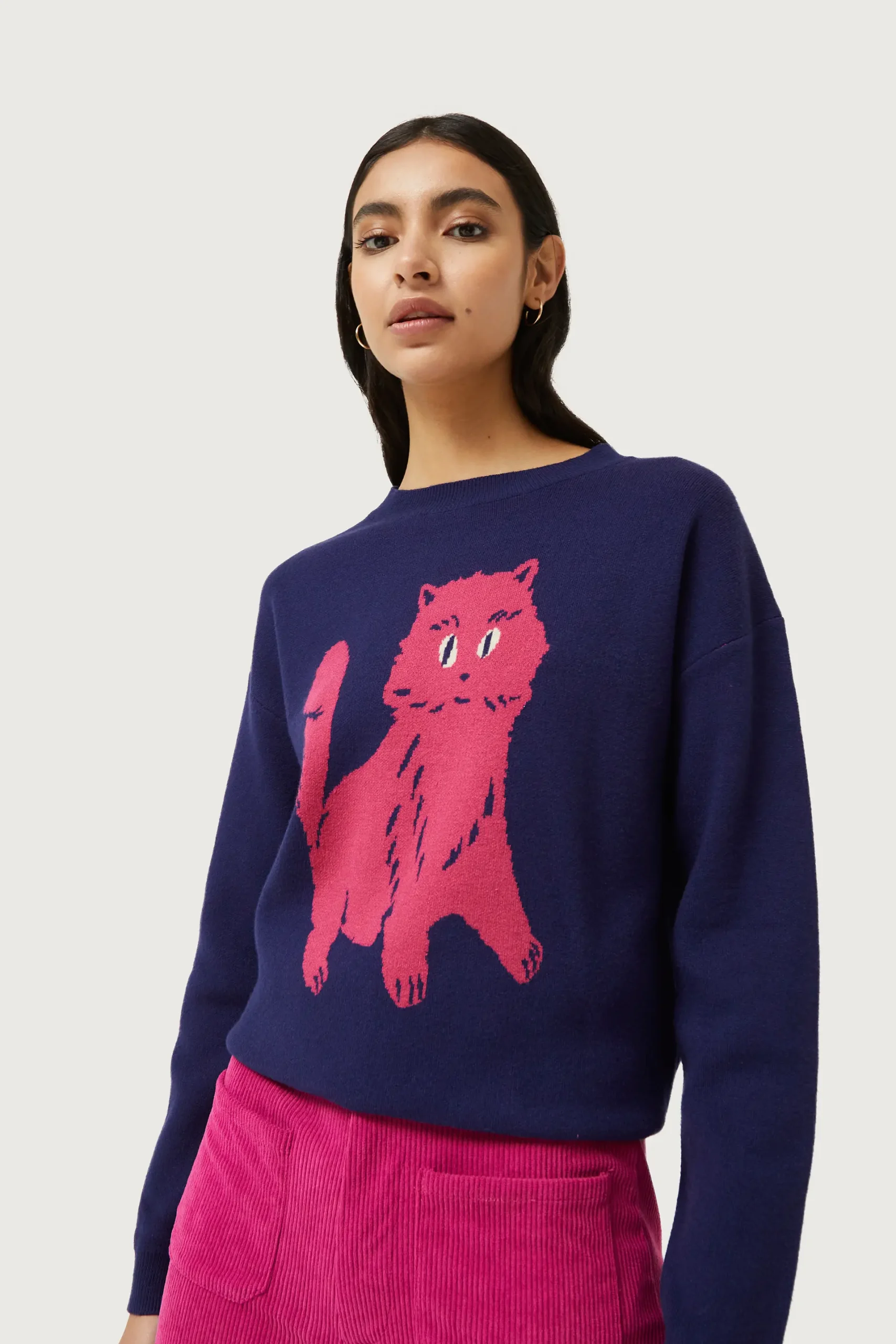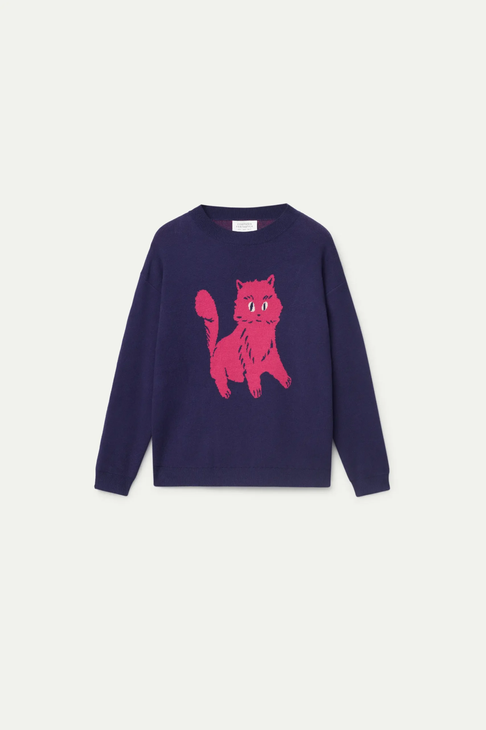 Jersey de punto jacquard de color azul marino con estampado gráfico de gato rosa. Con cuello redondo y manga larga. Detalle de acabados en canalé. La modelo mide 176 cm y lleva la talla S.