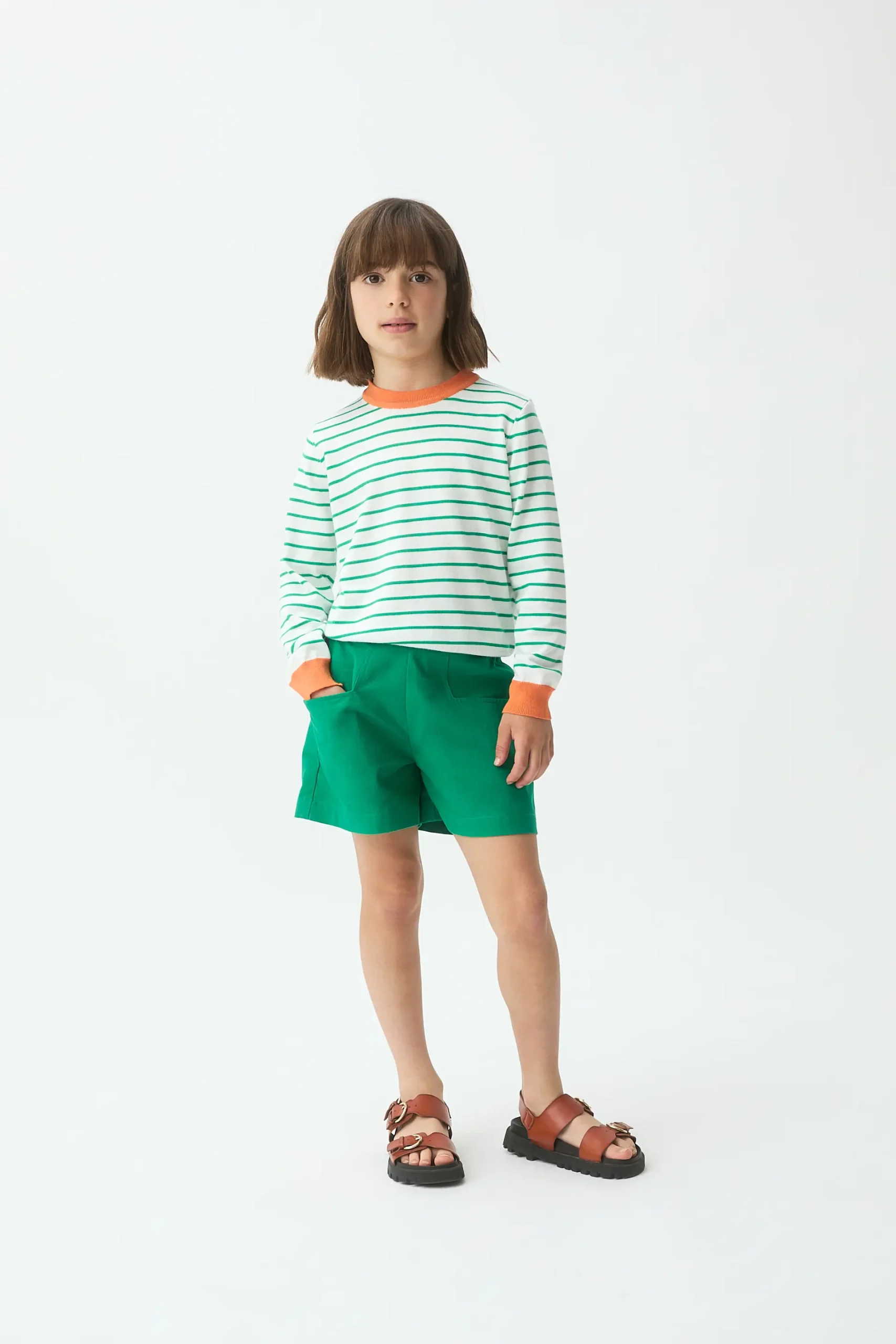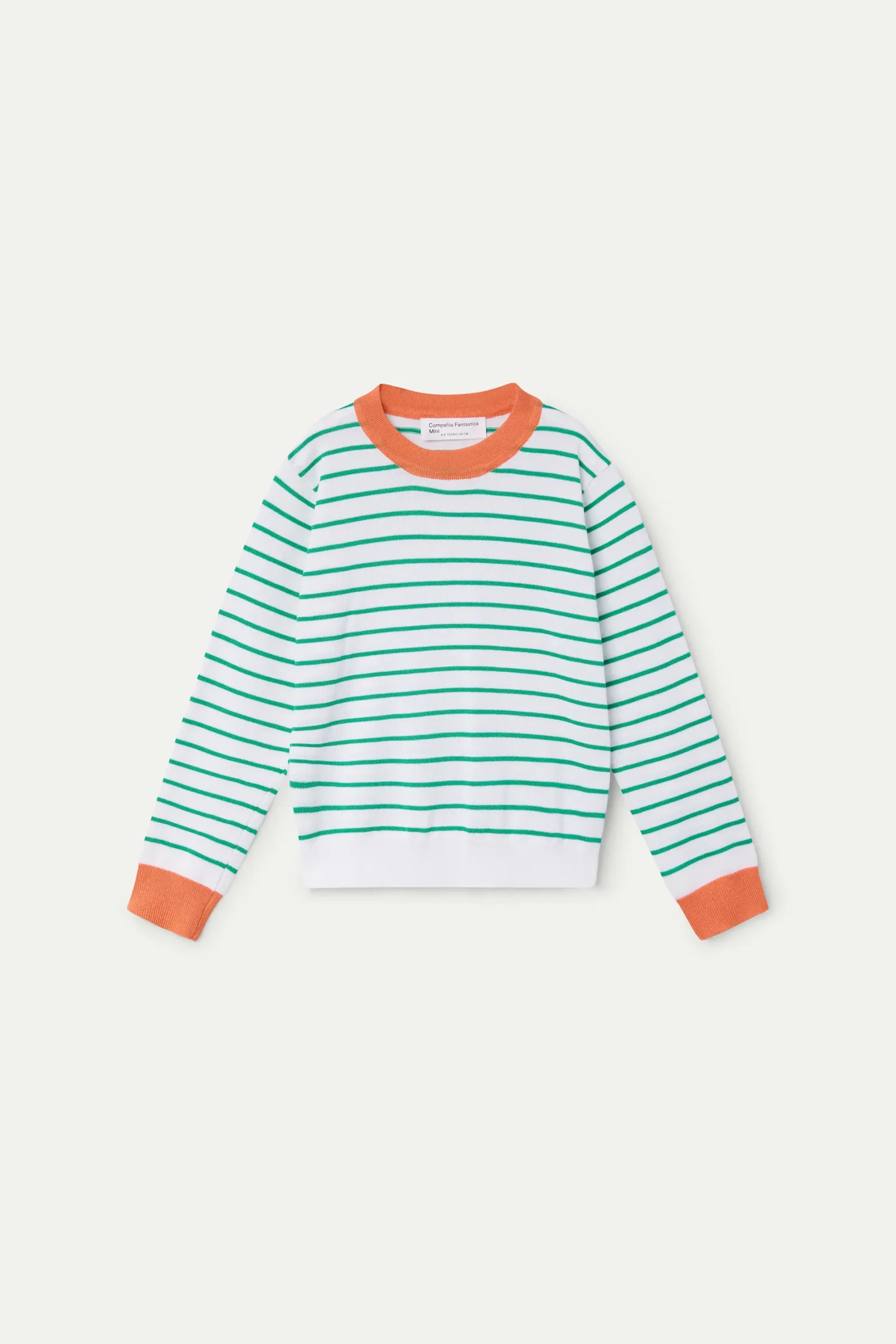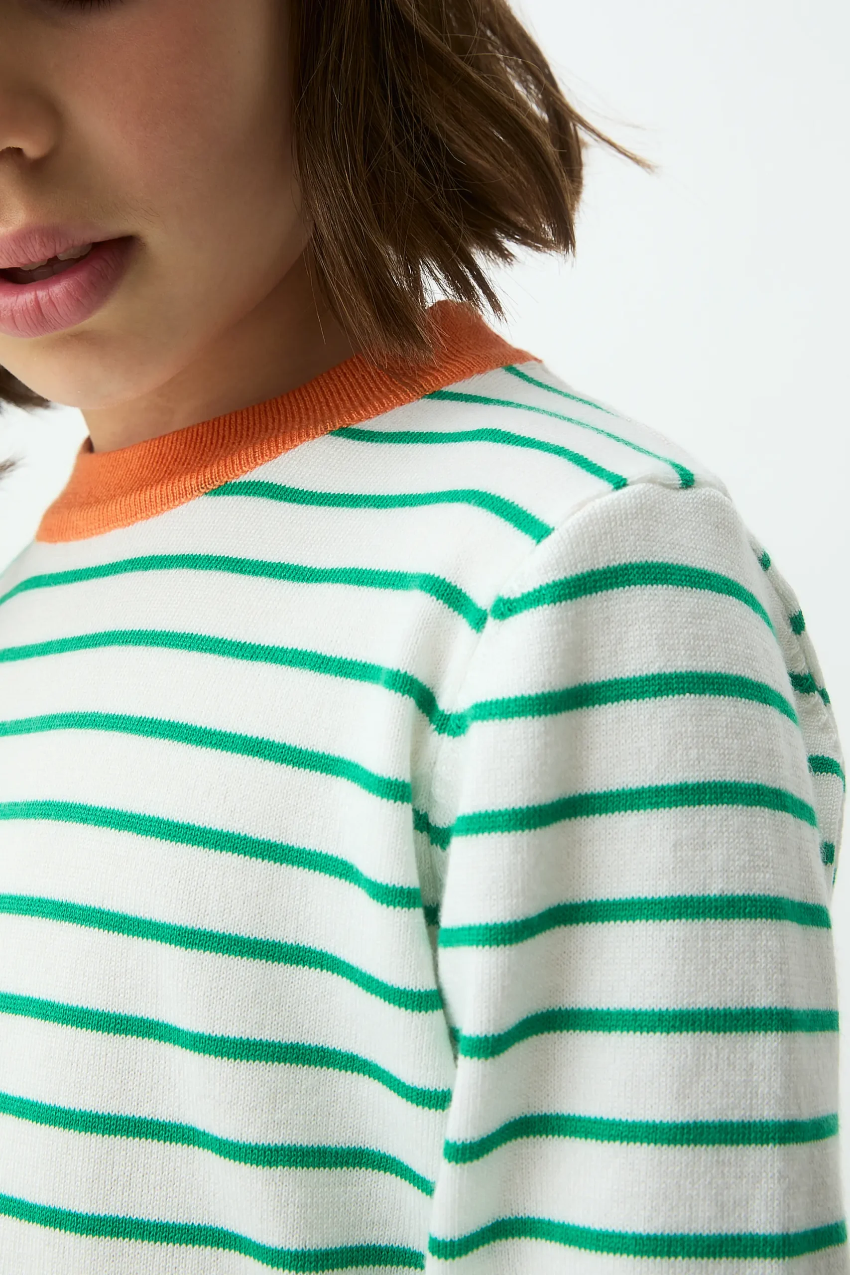 Jersey de niña con tejido punto con estampado de rayas blancas y verdes. Cuello redondo y manga larga terminada en puño de color naranja. Detalles en rib. La modelo mide 127 cm y lleva la talla 8-9 años.