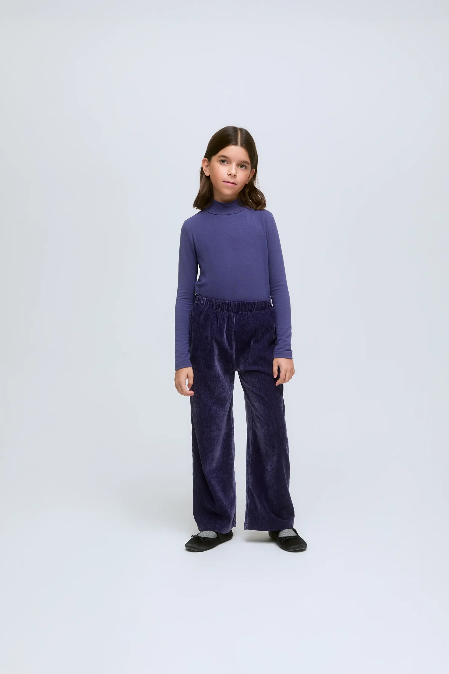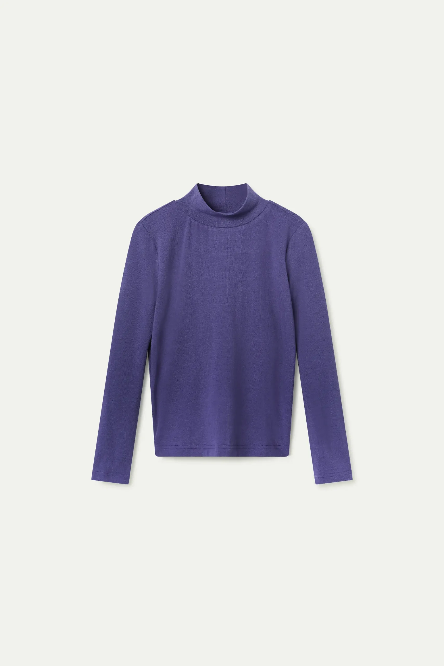 Jersey de niña de punto fino en color morado con cuello alto y manga larga.