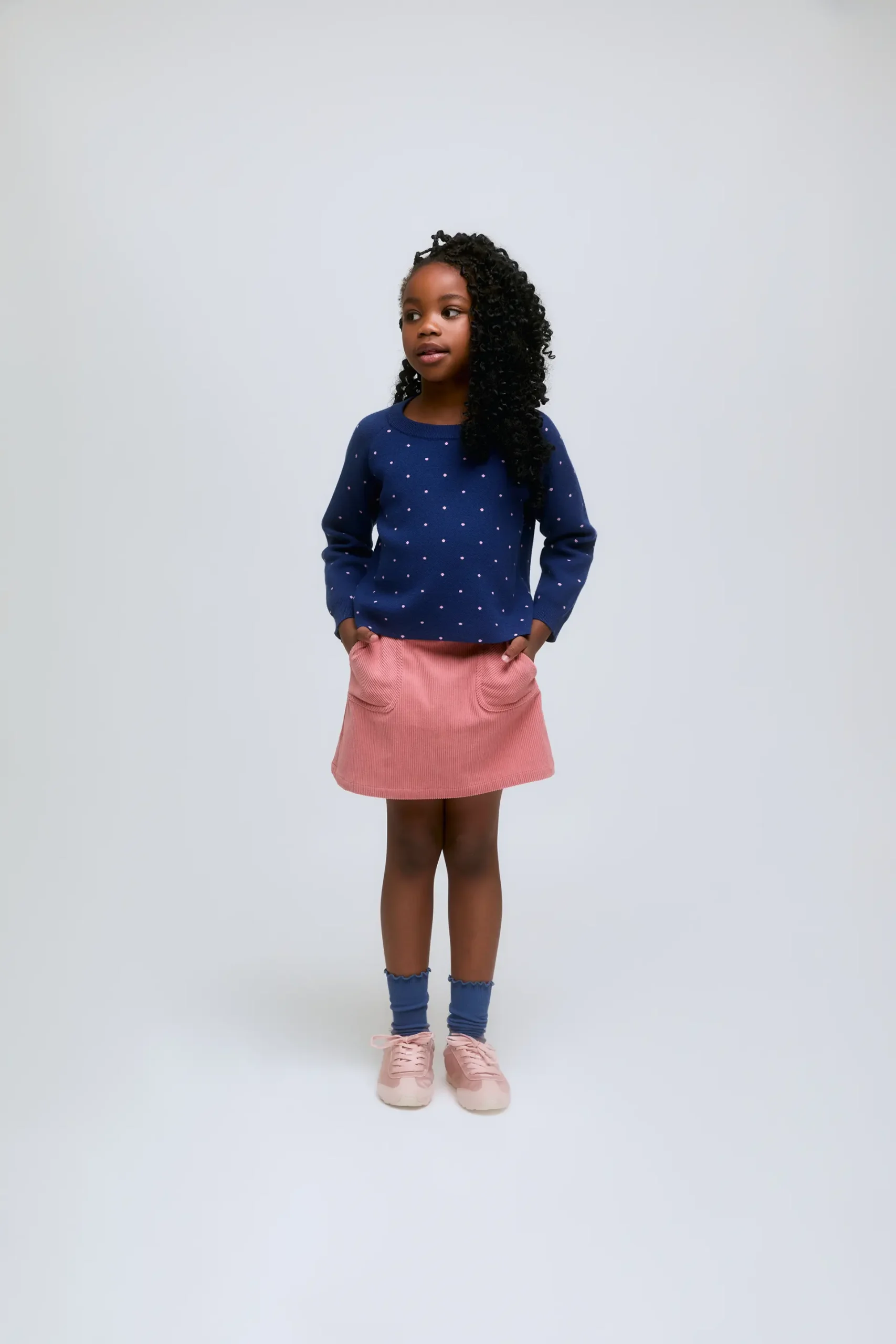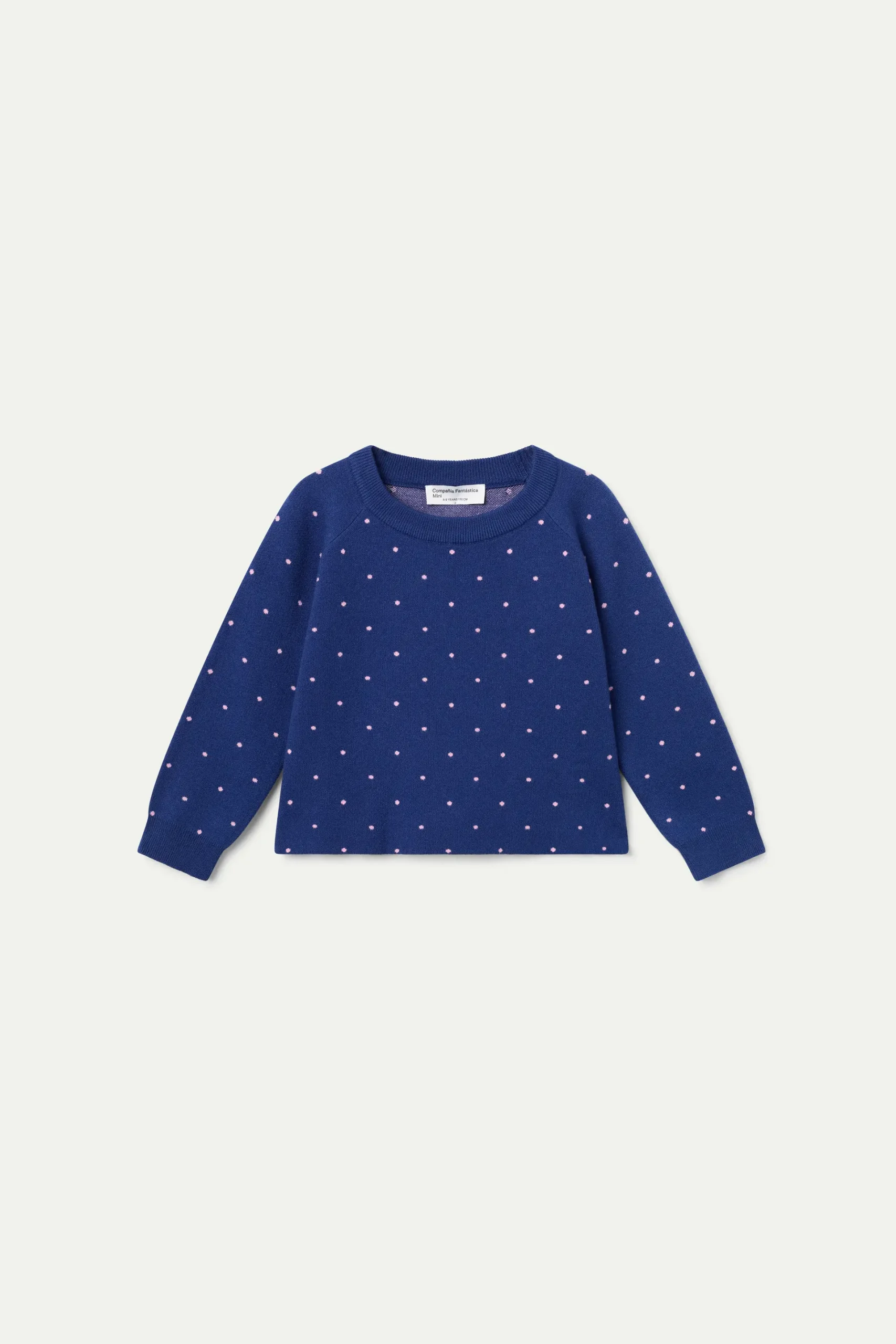 Jersey de niña de punto azul marino con lunares rosas. Con cuello redondo y manga larga.