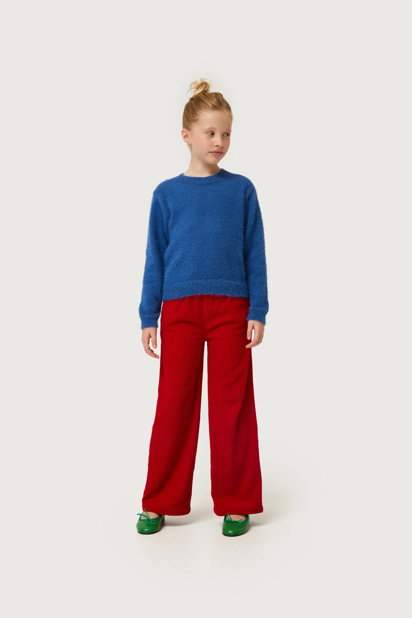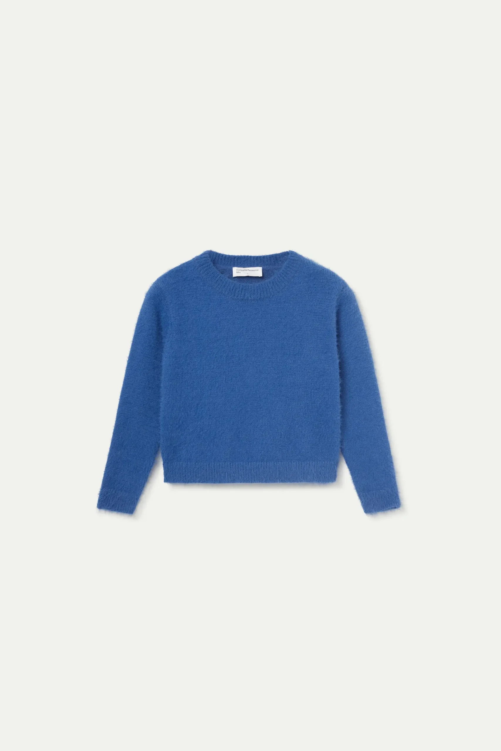 Jersey de niña en punto efecto pelo de color azul. Con cuello redondo y manga larga. Detalle de puños elásticos. La modelo mide 130 cm y lleva la talla 8.