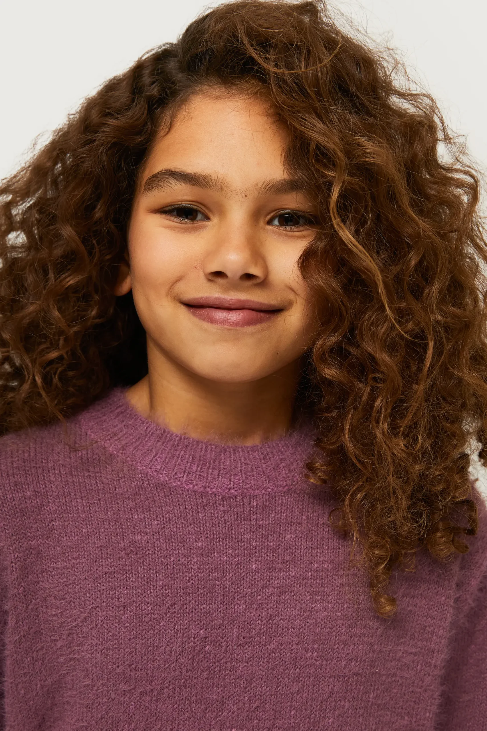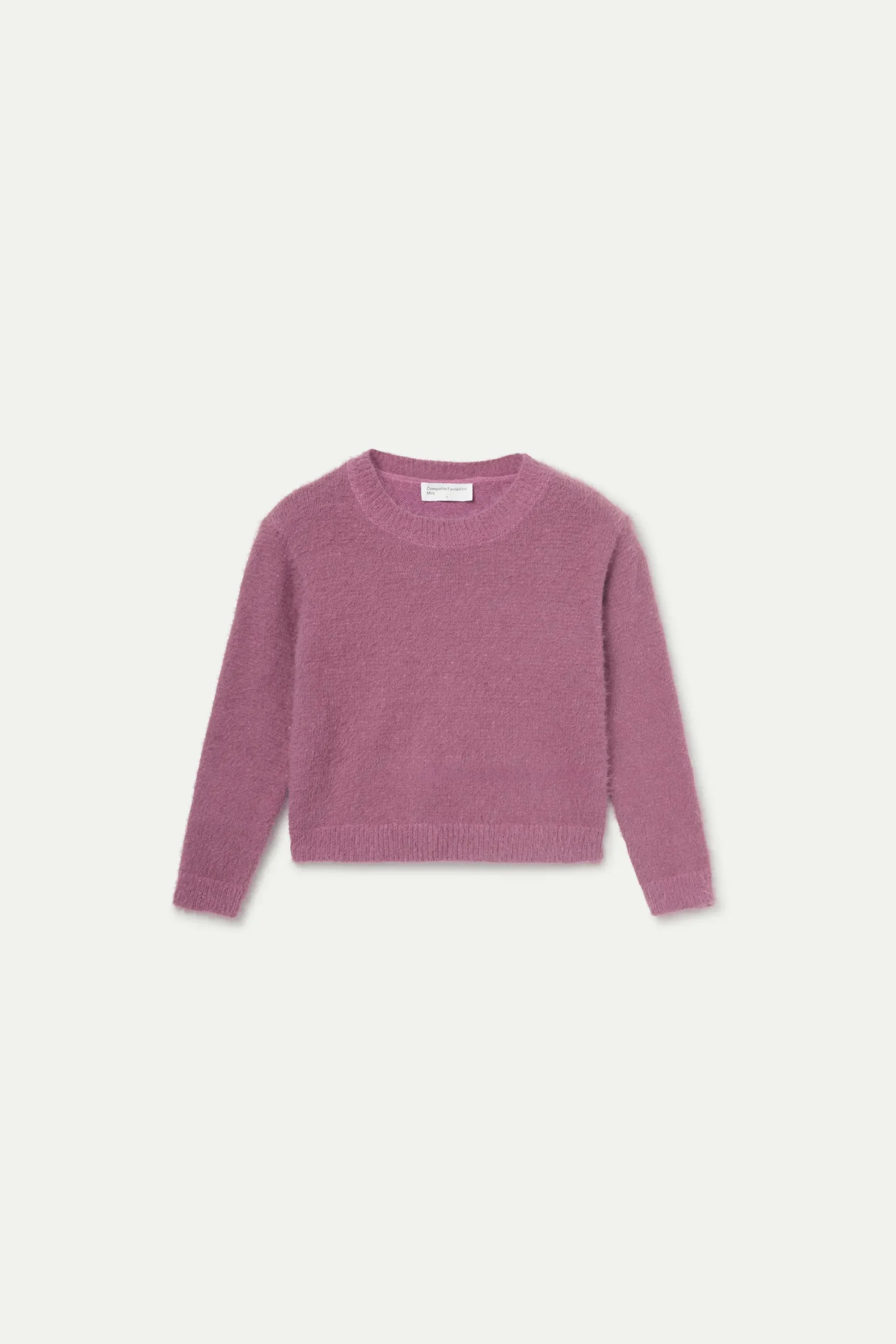 Jersey de niña en punto efecto pelo de color rosa. Con cuello redondo y manga larga. Detalle de puños elásticos. La modelo mide 140 cm y lleva la talla 8.