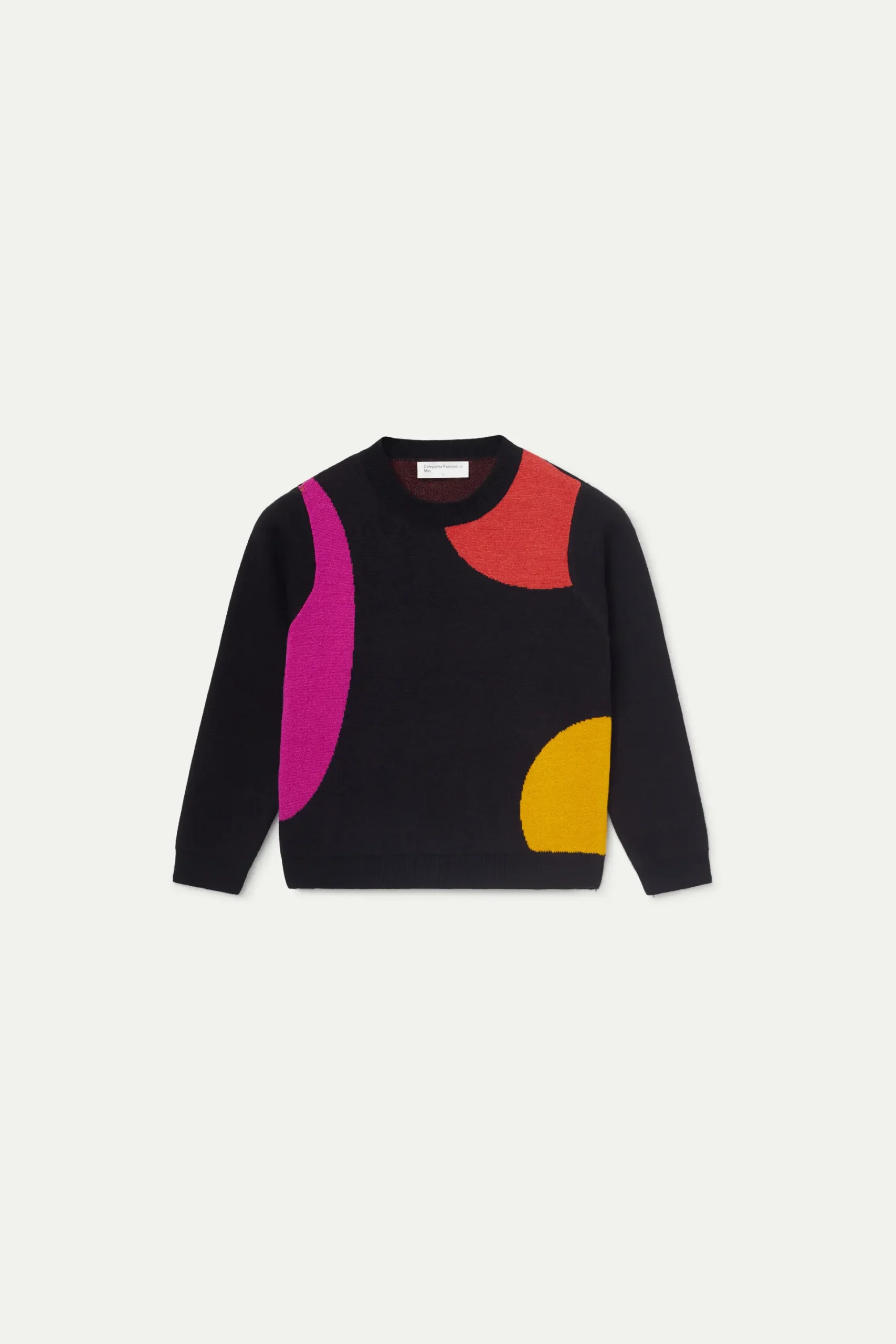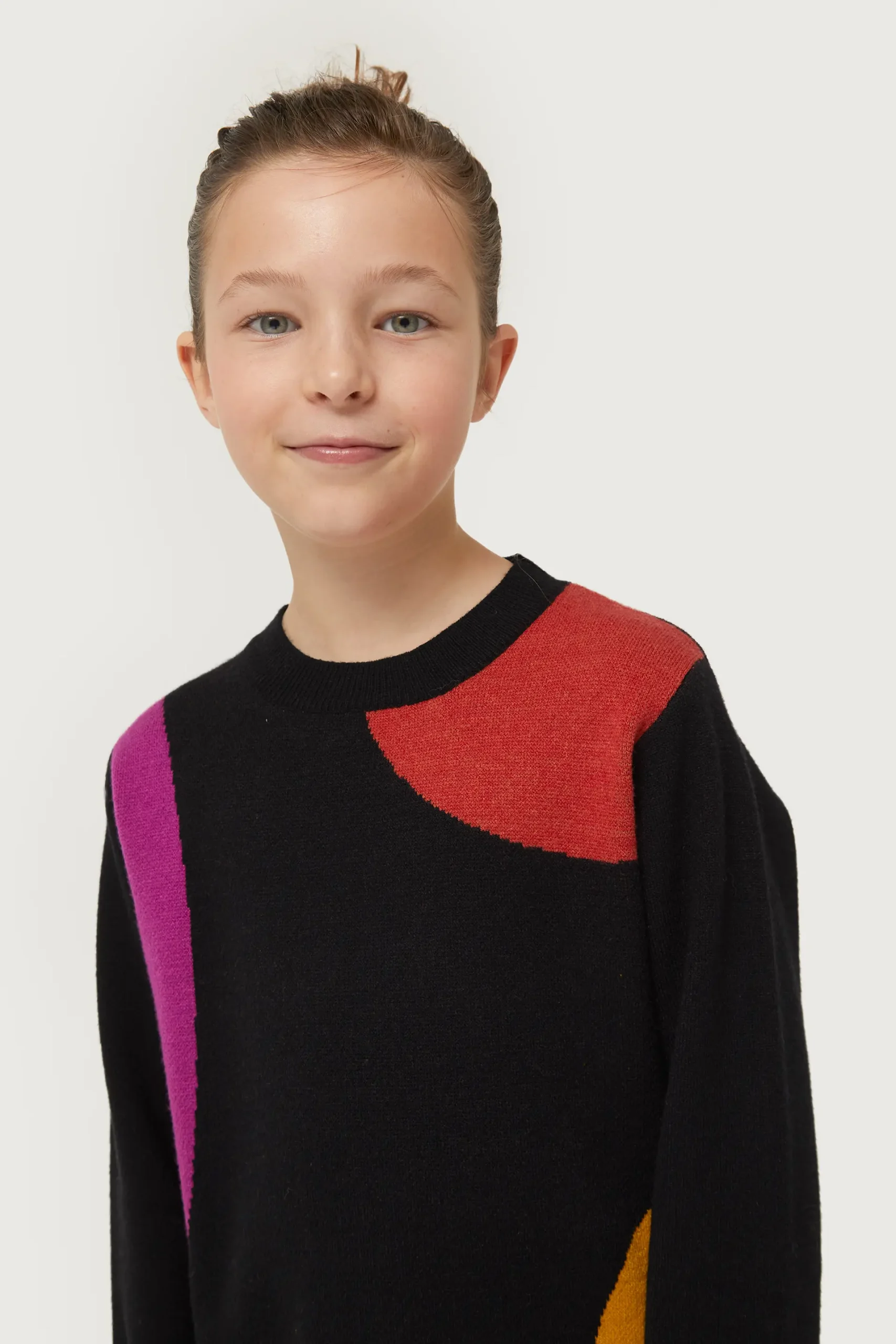 Jersey de niña en punto jacquard de color negro con estampado de círculos multicolor. Con cuello redondo y manga larga. La modelo mide 130 cm y lleva la talla 8.