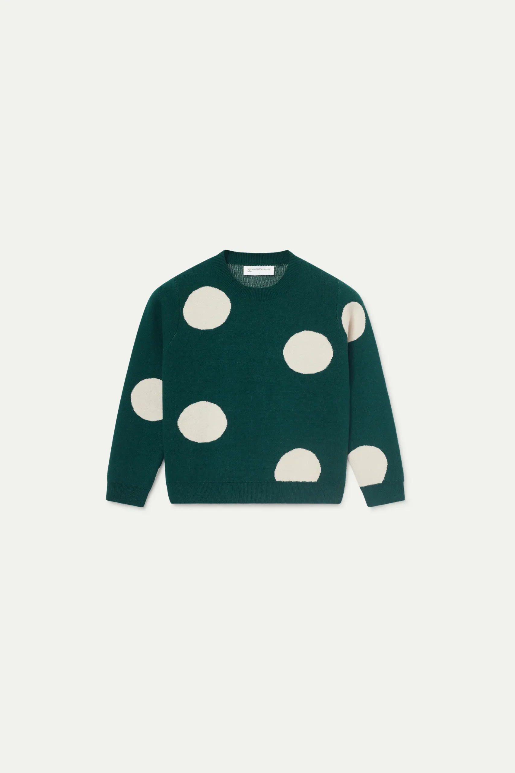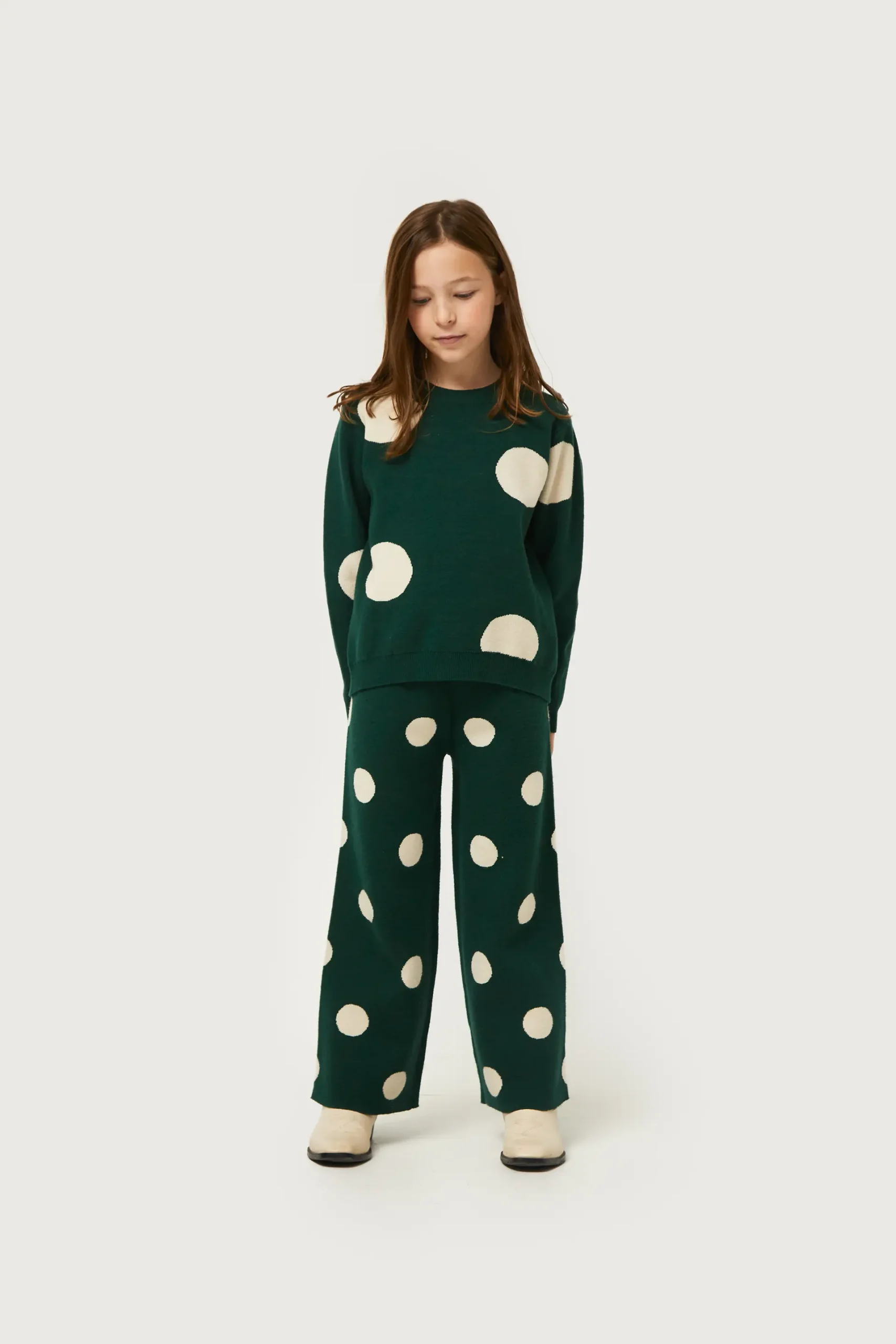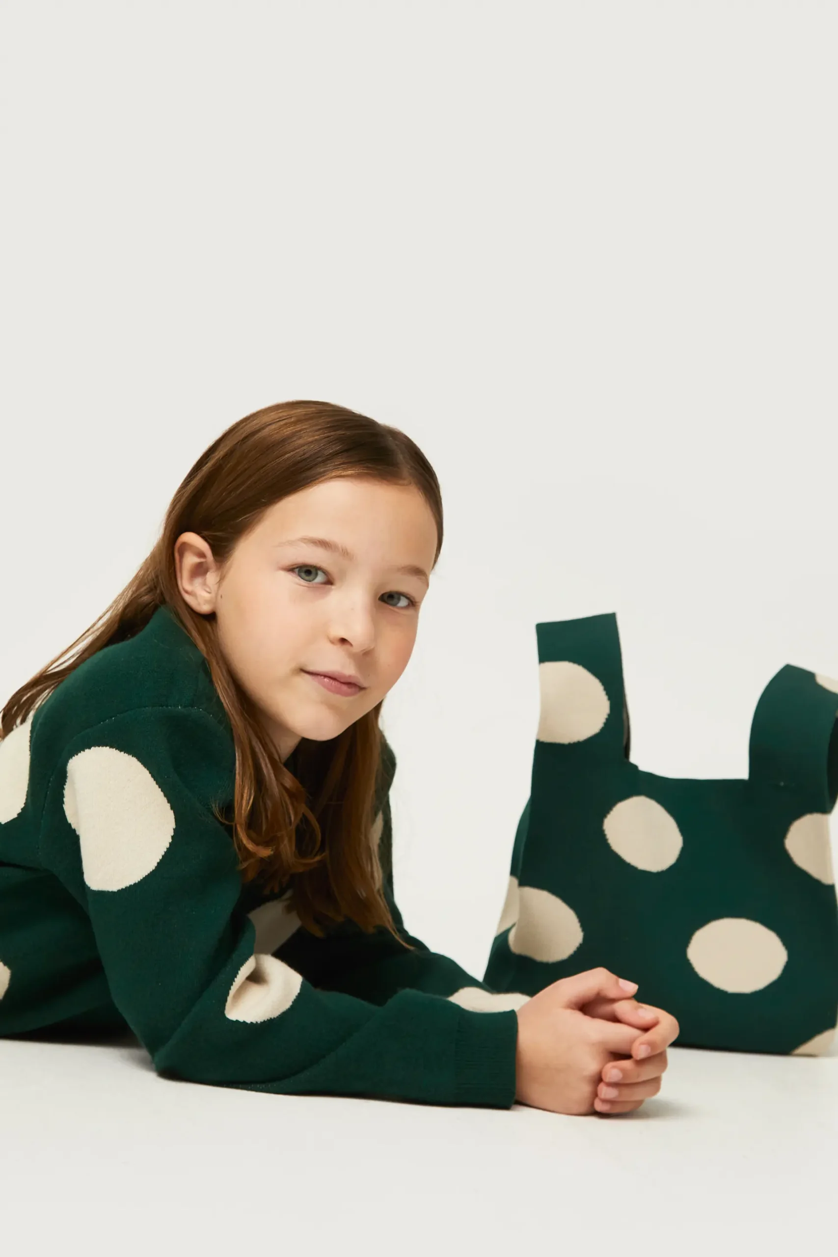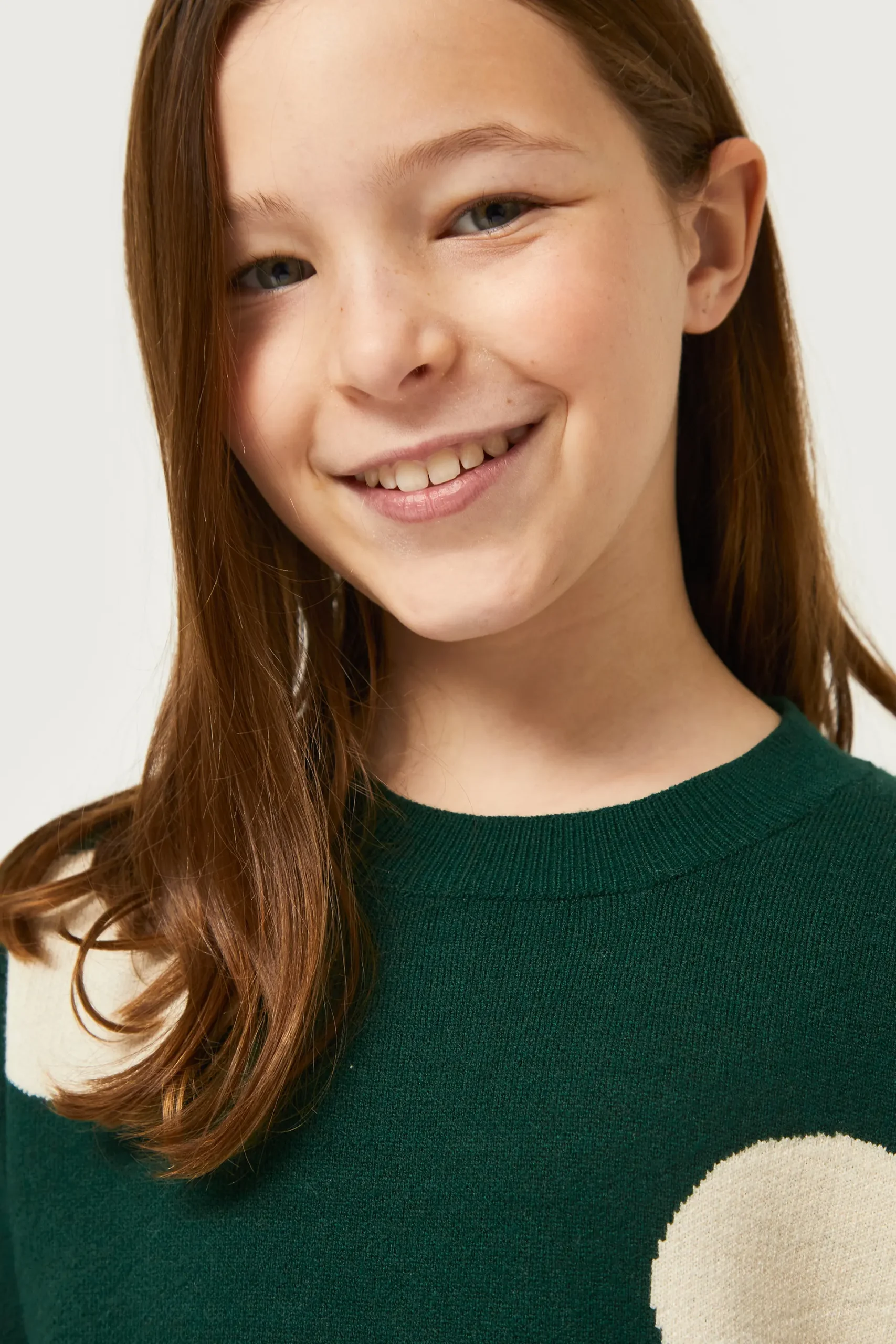 Jersey de niña en punto jacquard de color verde con estampado de lunares blancos. Con cuello redondo y manga larga. La modelo mide 134 cm y lleva la talla 8.