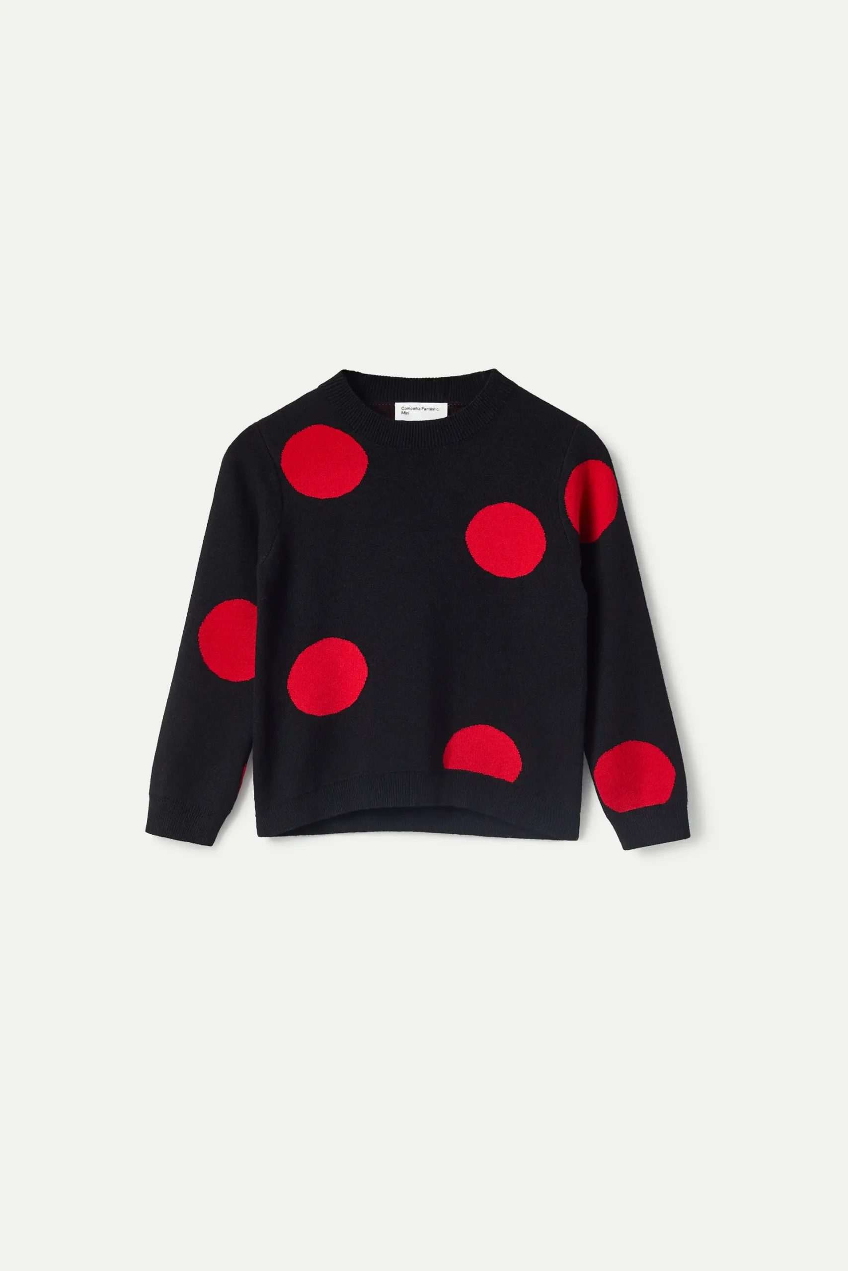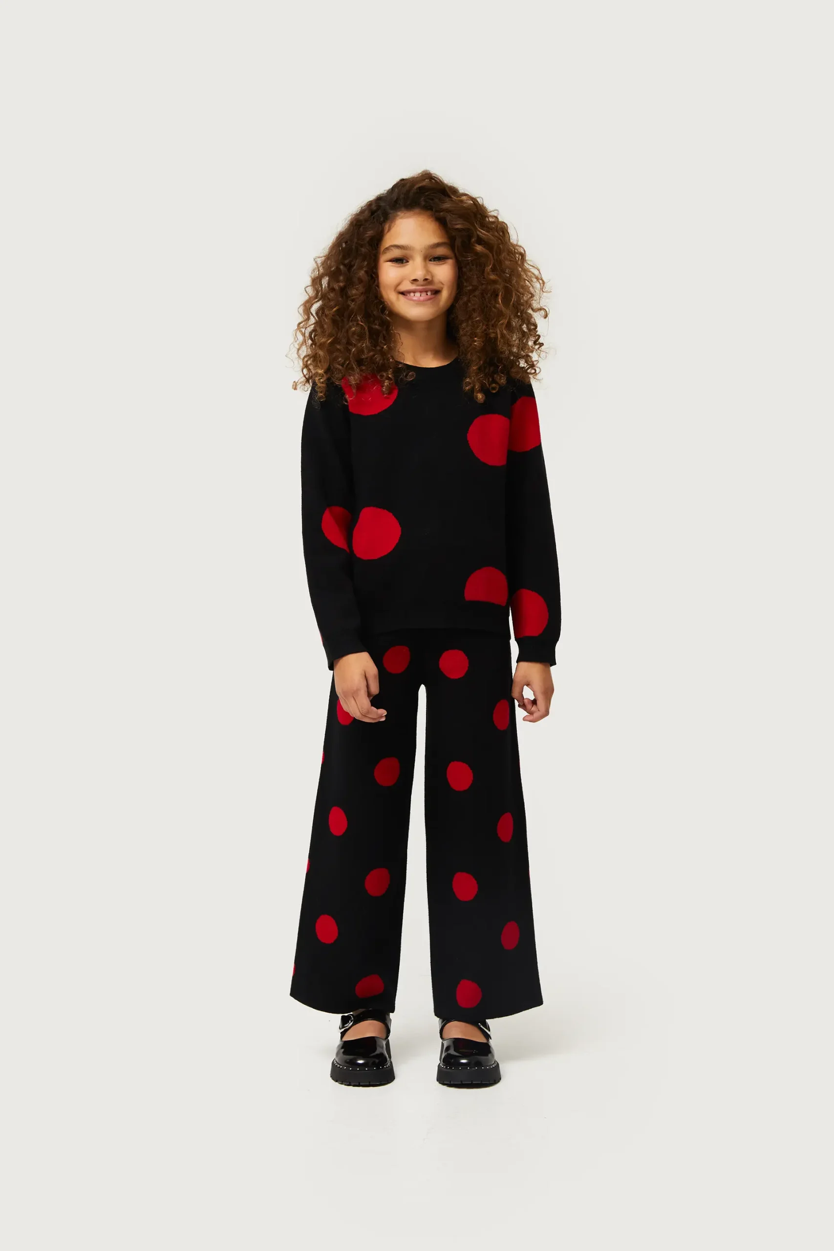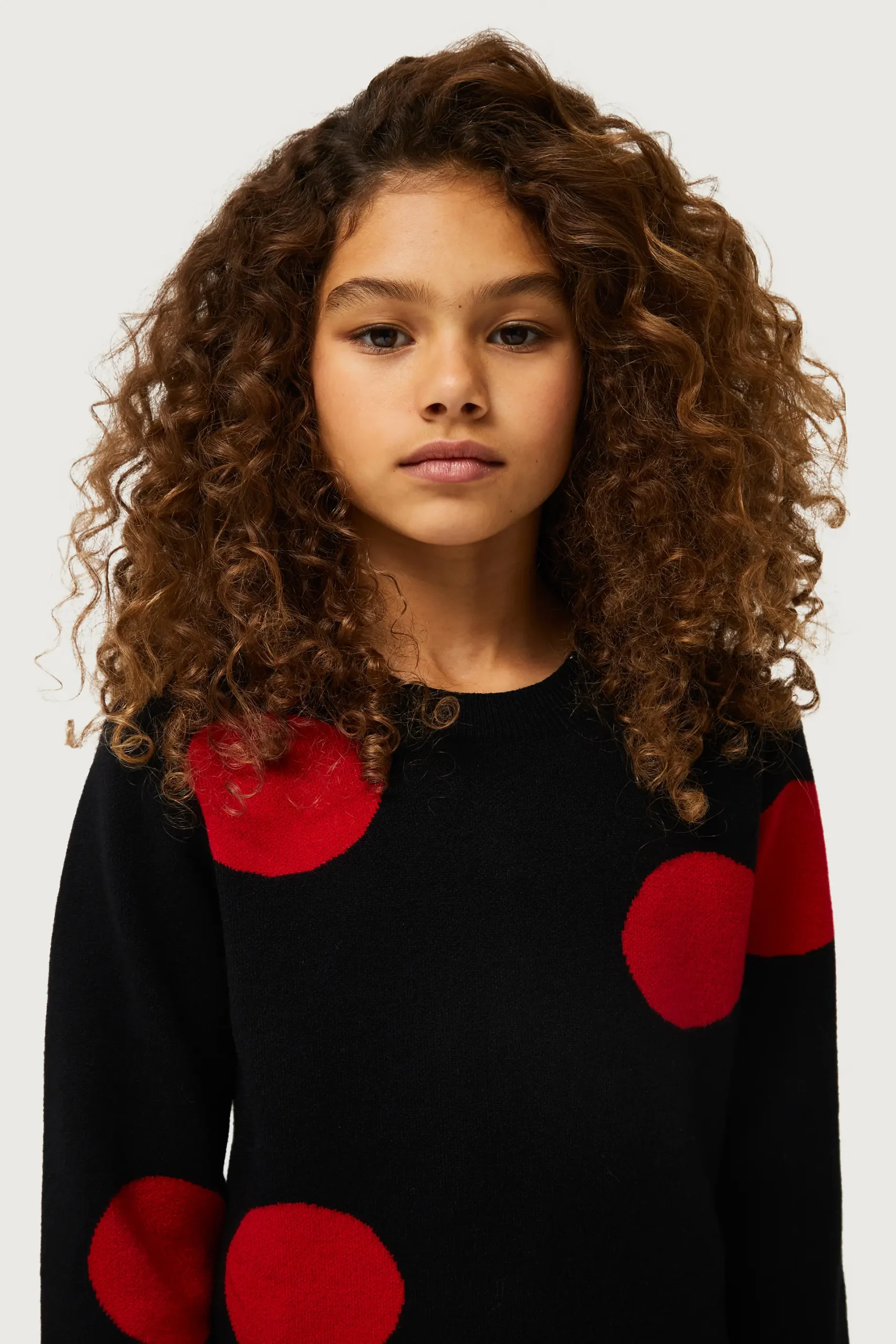 Jersey de niña en punto jacquard de color negro con estampado de lunares rojos. Con cuello redondo y manga larga. La modelo mide 134 cm y lleva la talla 8.