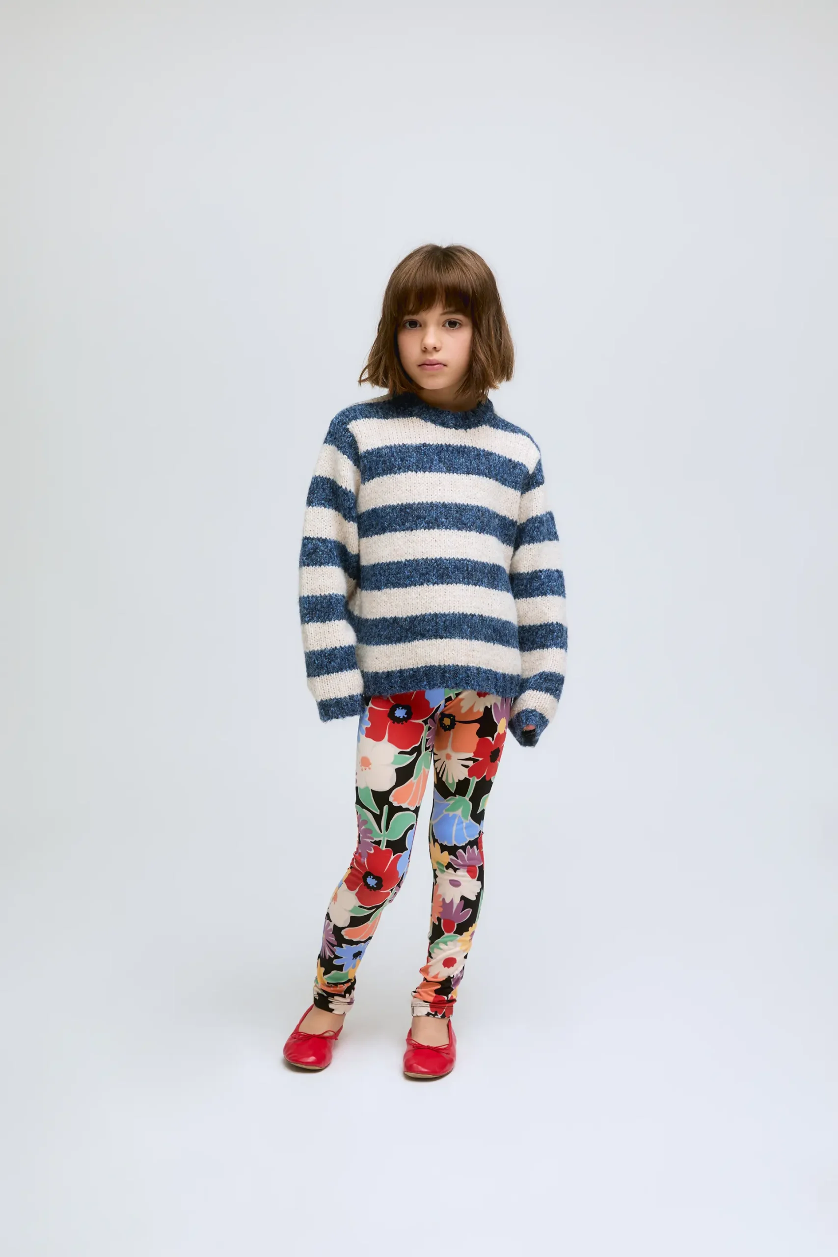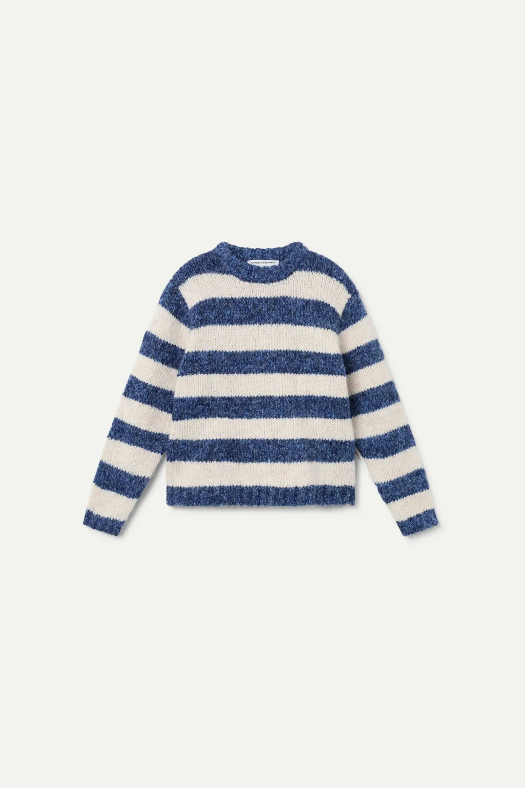 Jersey de niña de punto ancho rayas blancas y azules. Con cuello redondo y manga larga.