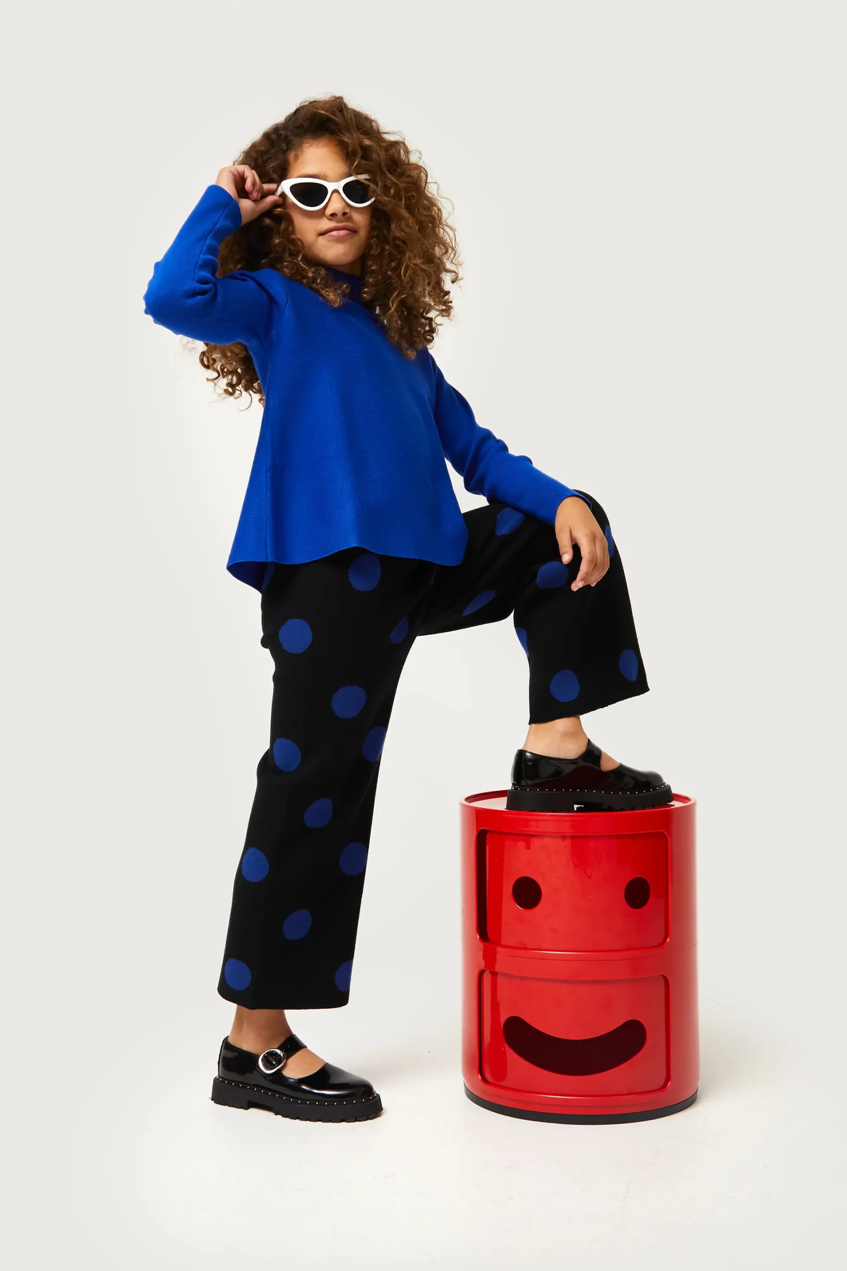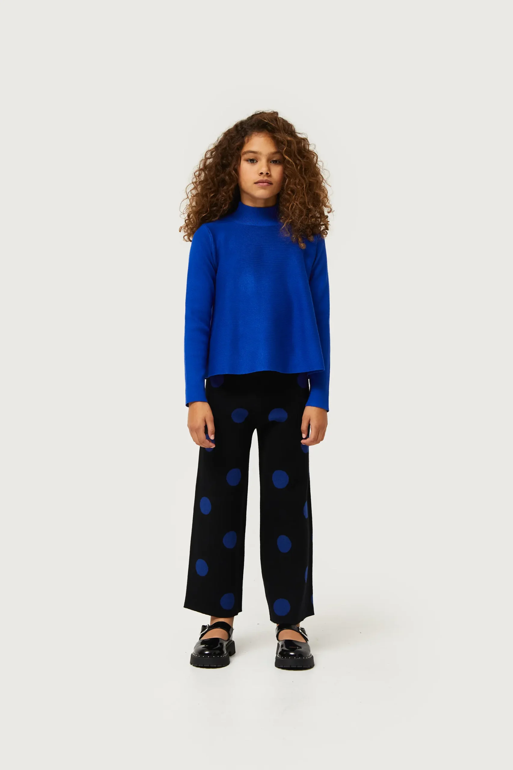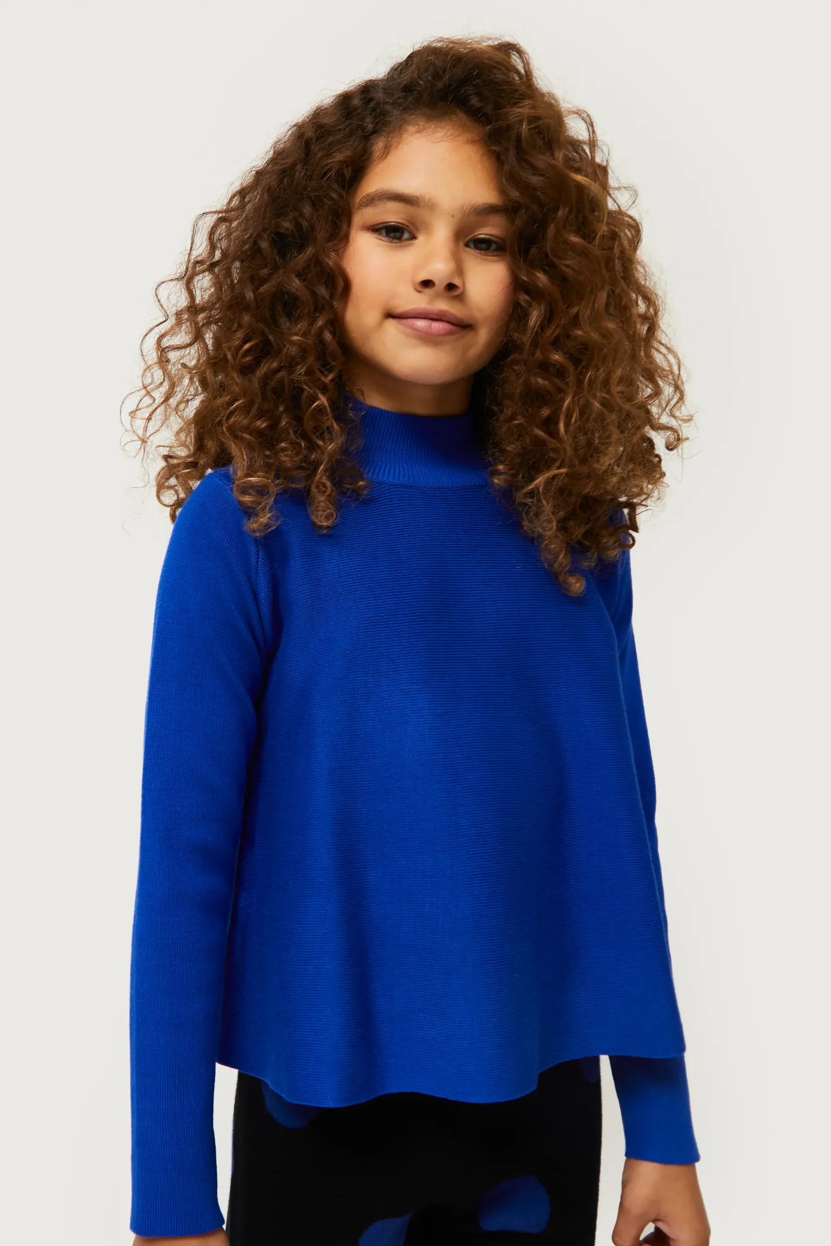 Jersey de niña en punto de color azul. Con cuello perkins y manga larga. Modelo de corte evasé. La modelo mide 130 cm y lleva la talla 8.