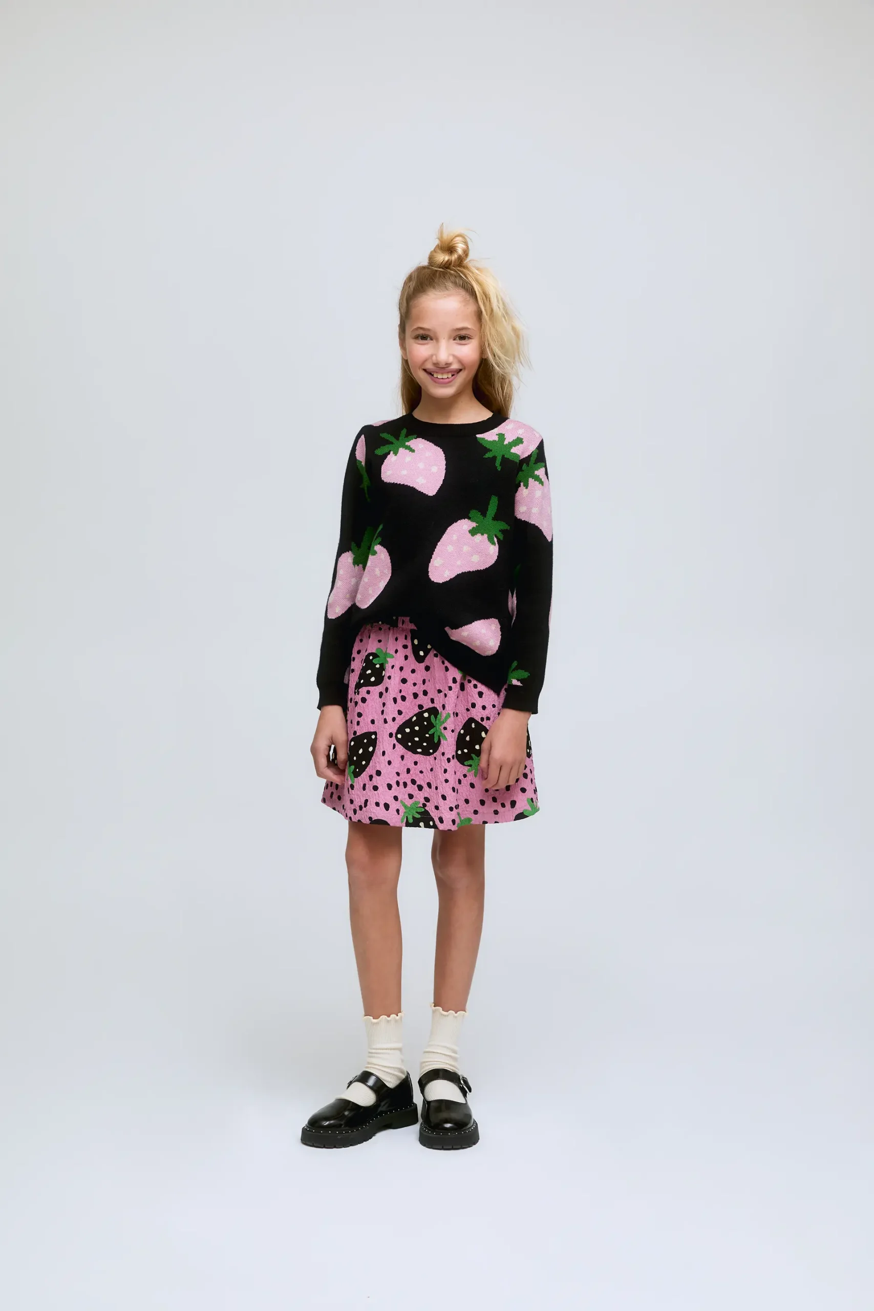 Jersey de niña de punto estampado Morango con fresas. Con cuello redondo y manga larga. Detalle de acabados en canalé.