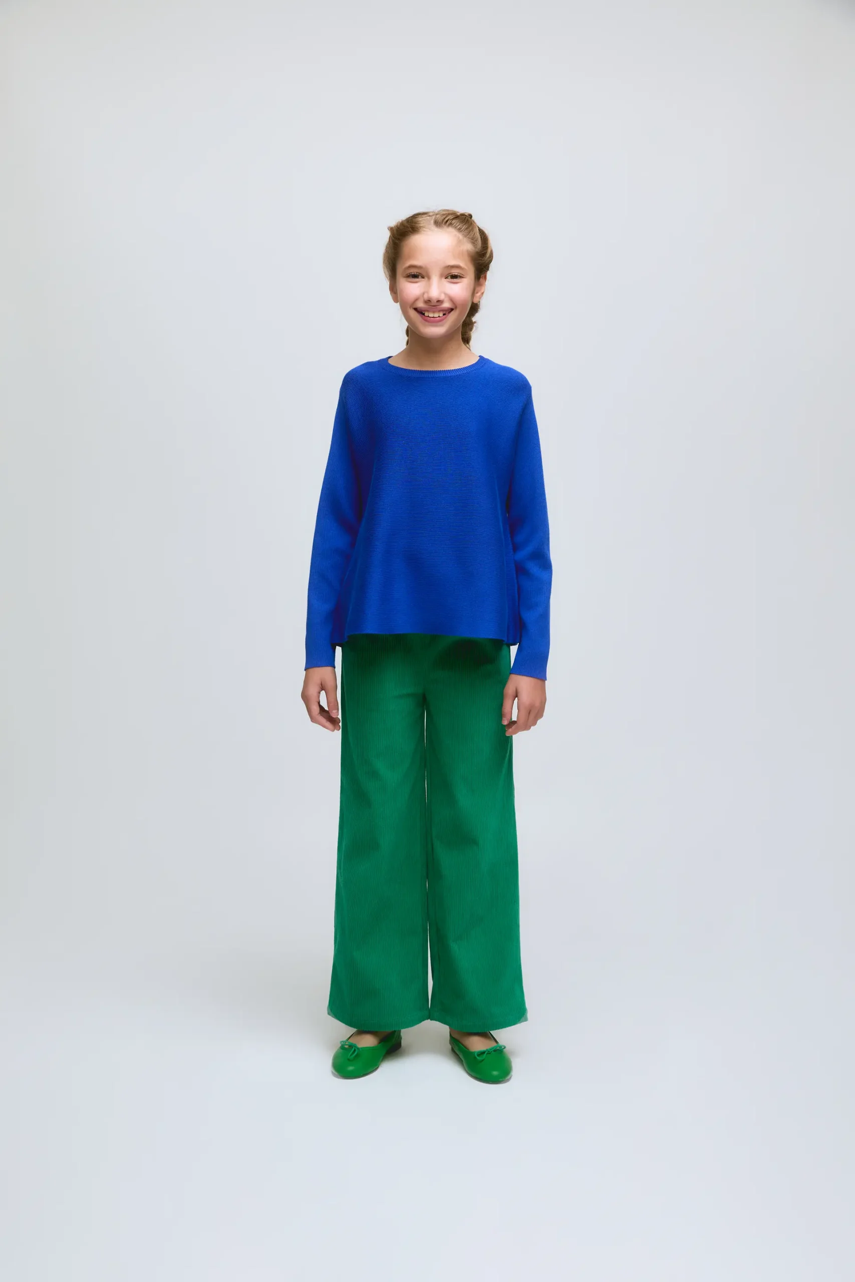 Jersey de punto fino de niña de color azul. Con cuello redondo y manga larga. Modelo de corte evasé.