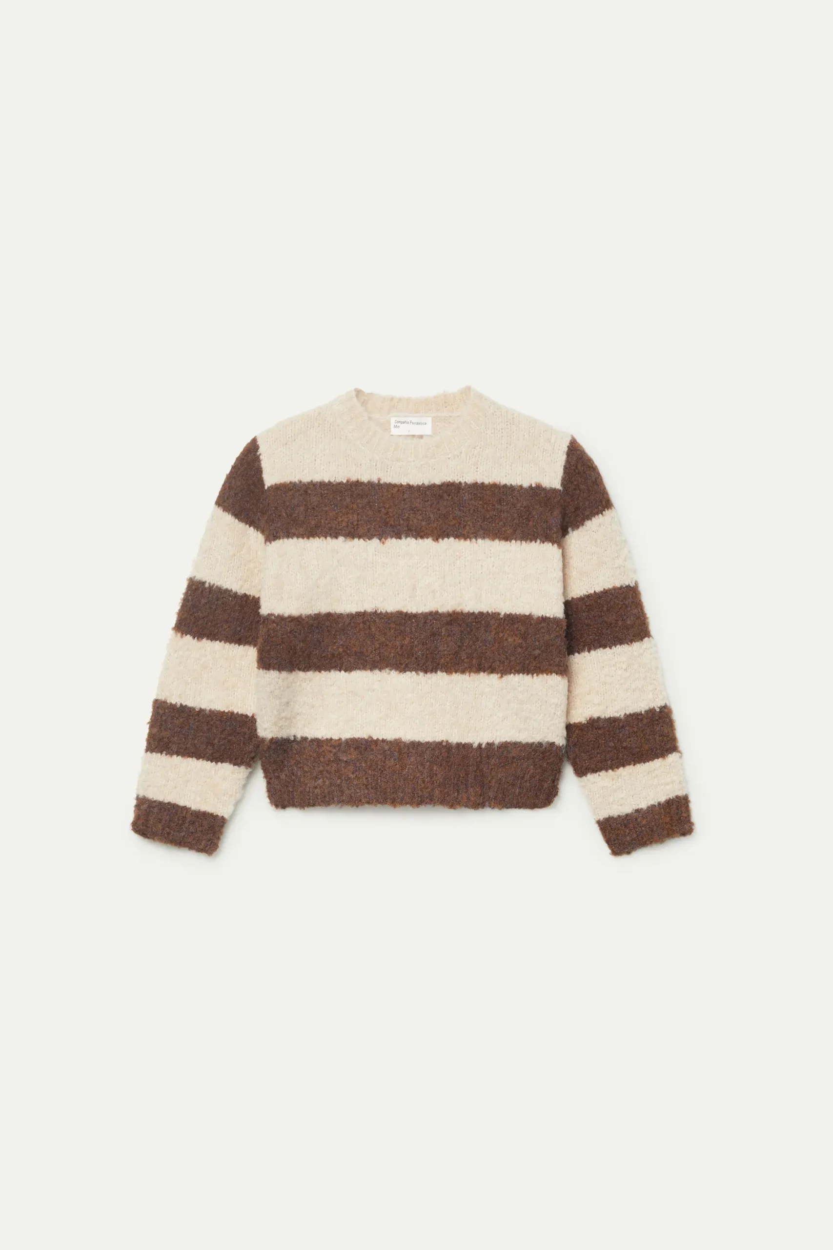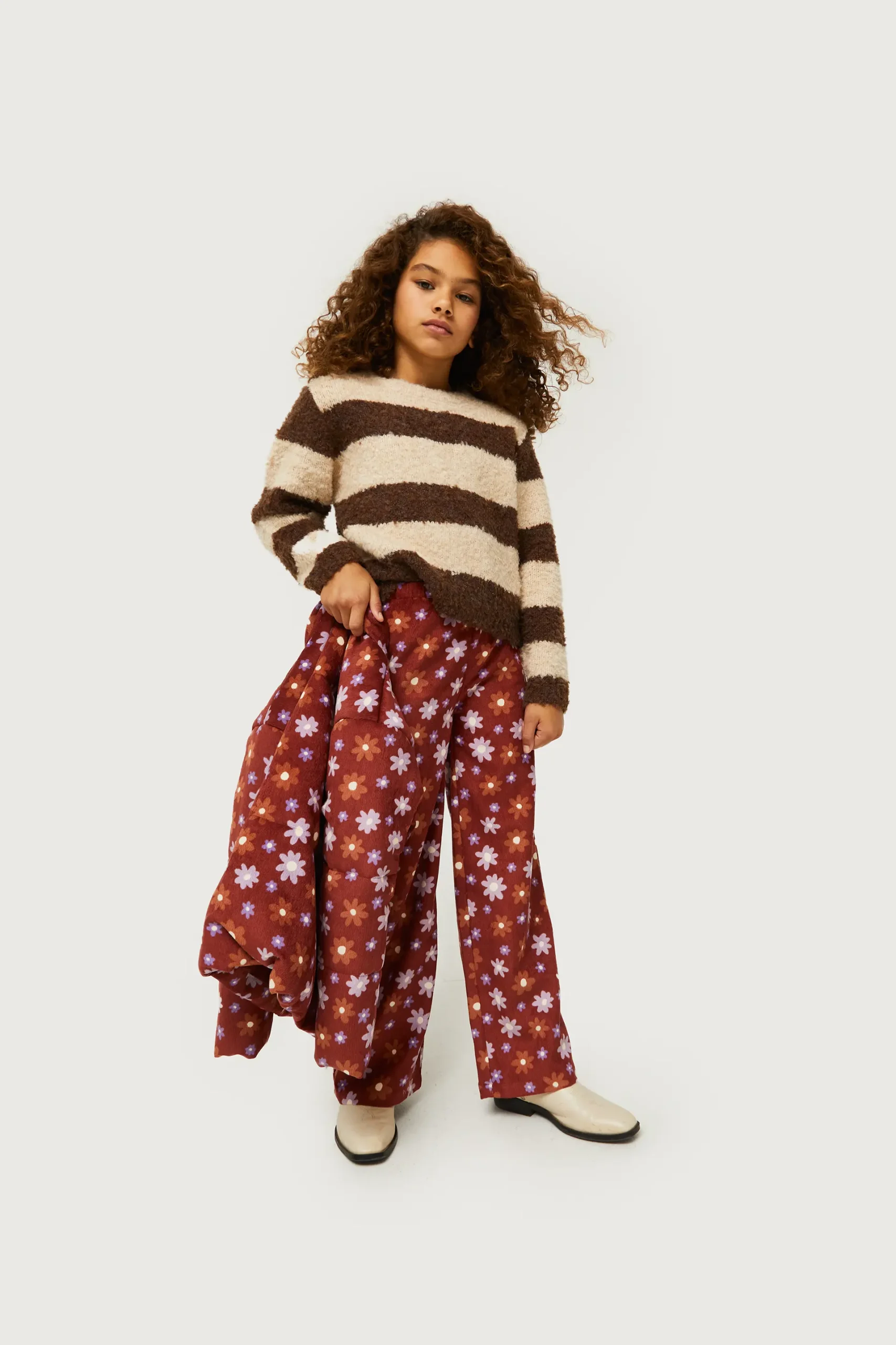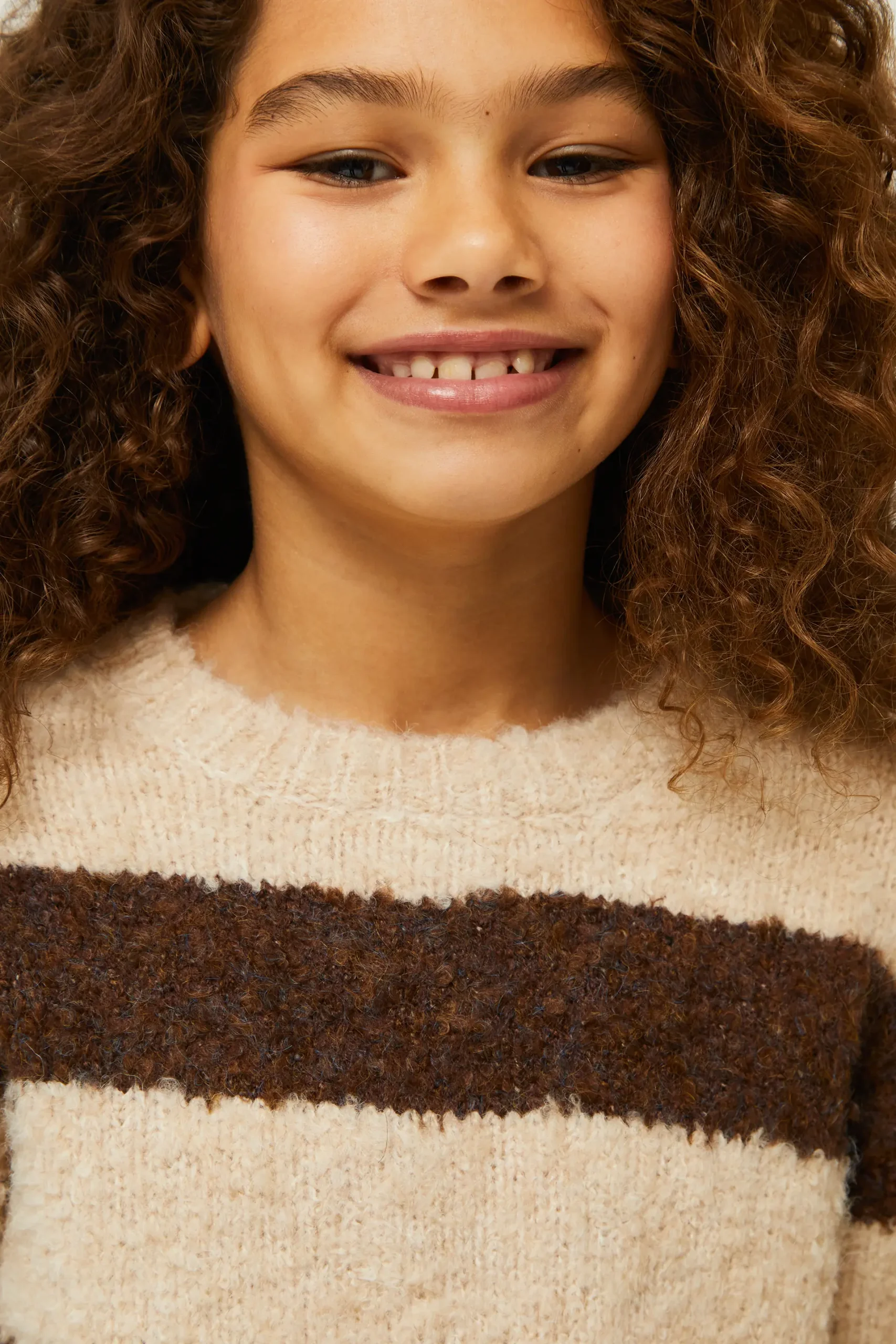 Jersey de niña con estampado de rayas marrones y beige. Con cuello redondo y manga larga. La modelo mide 134 cm y lleva la talla 8.
