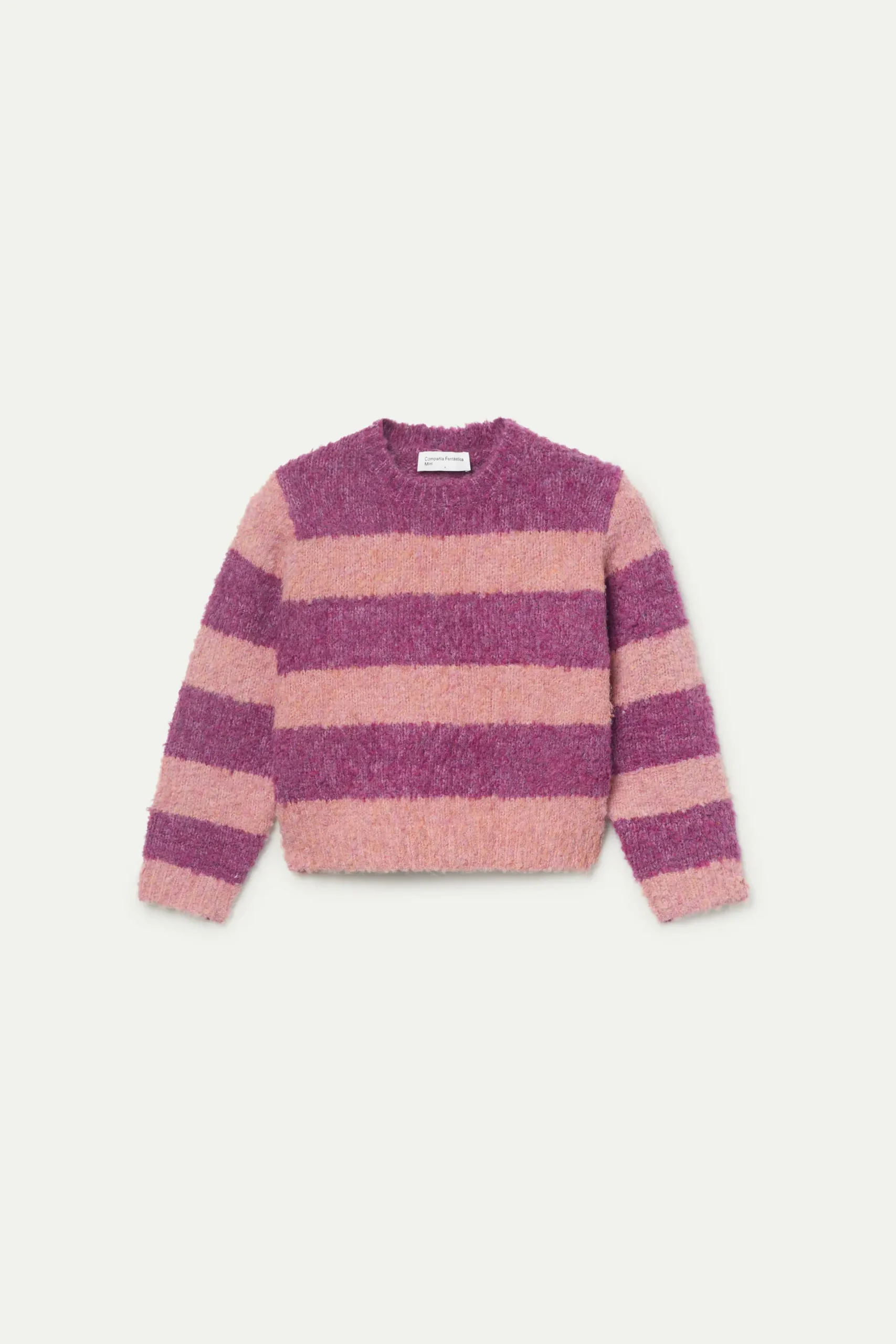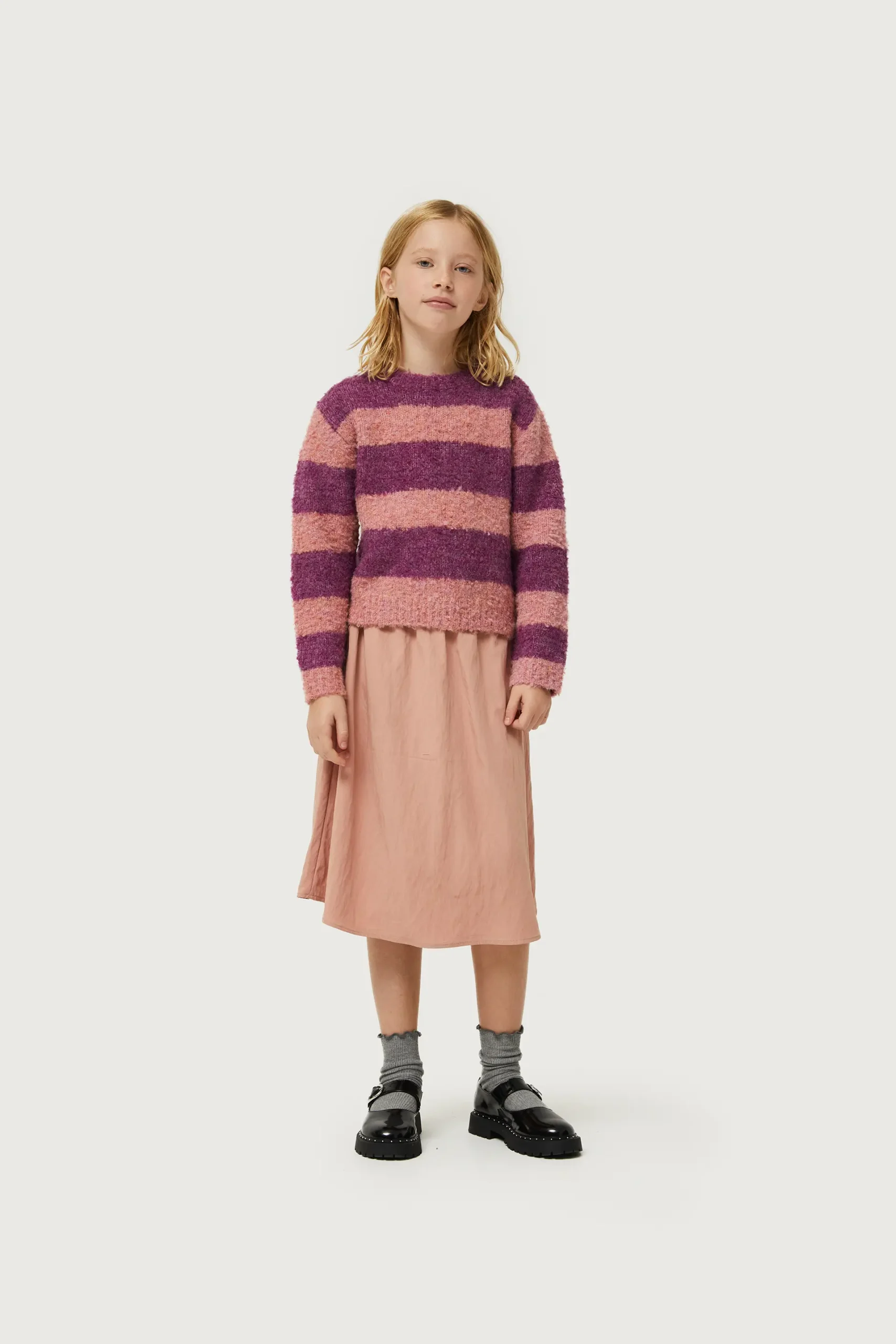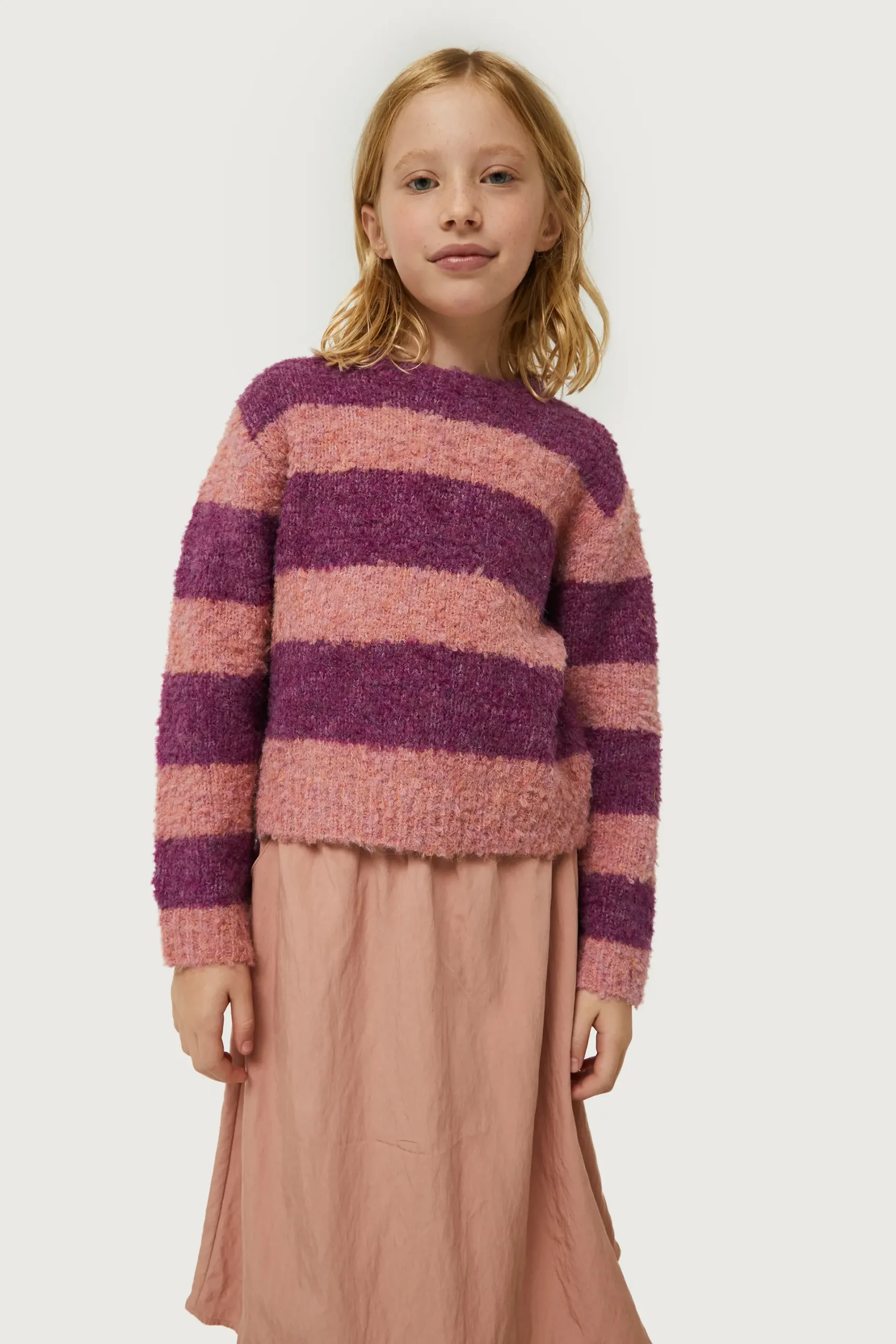 Jersey de niña con estampado de rayas moradas y rosas. Con cuello redondo y manga larga. La modelo mide 137 cm y lleva la talla 8.