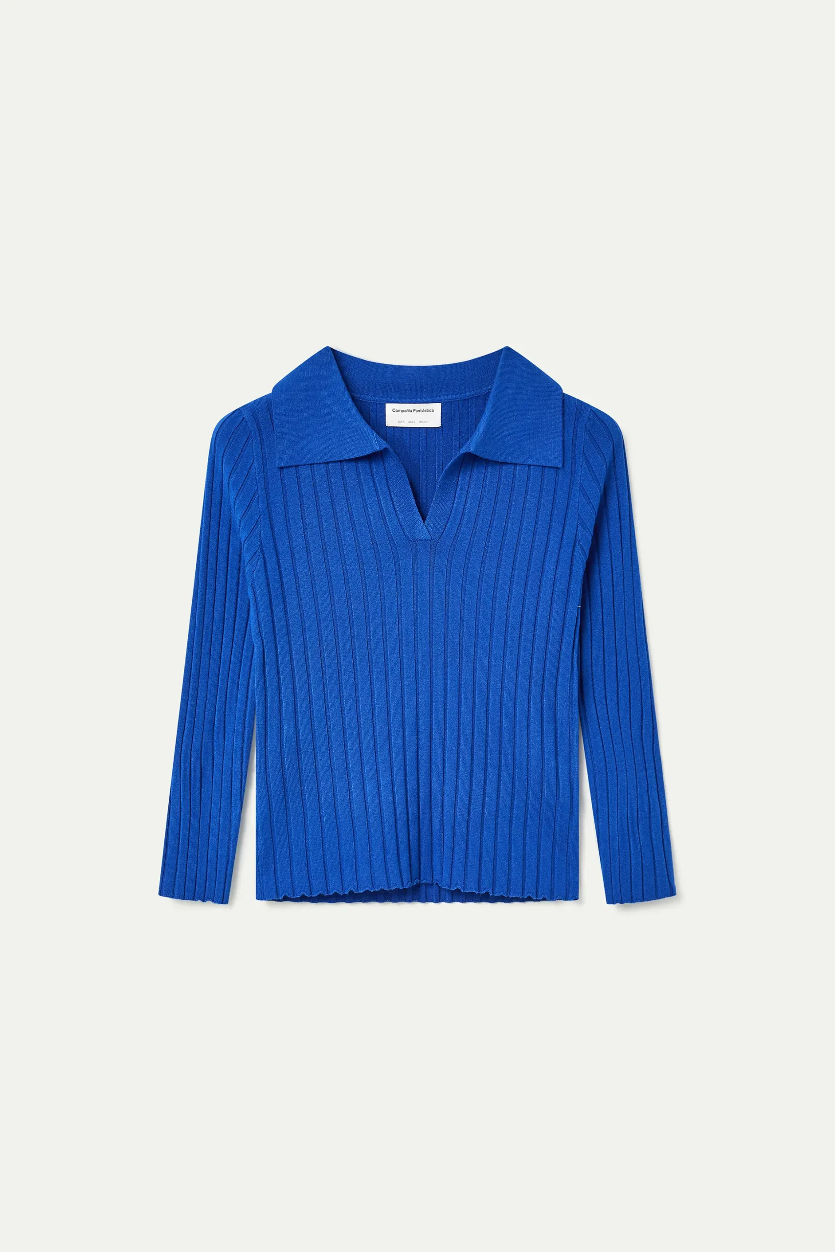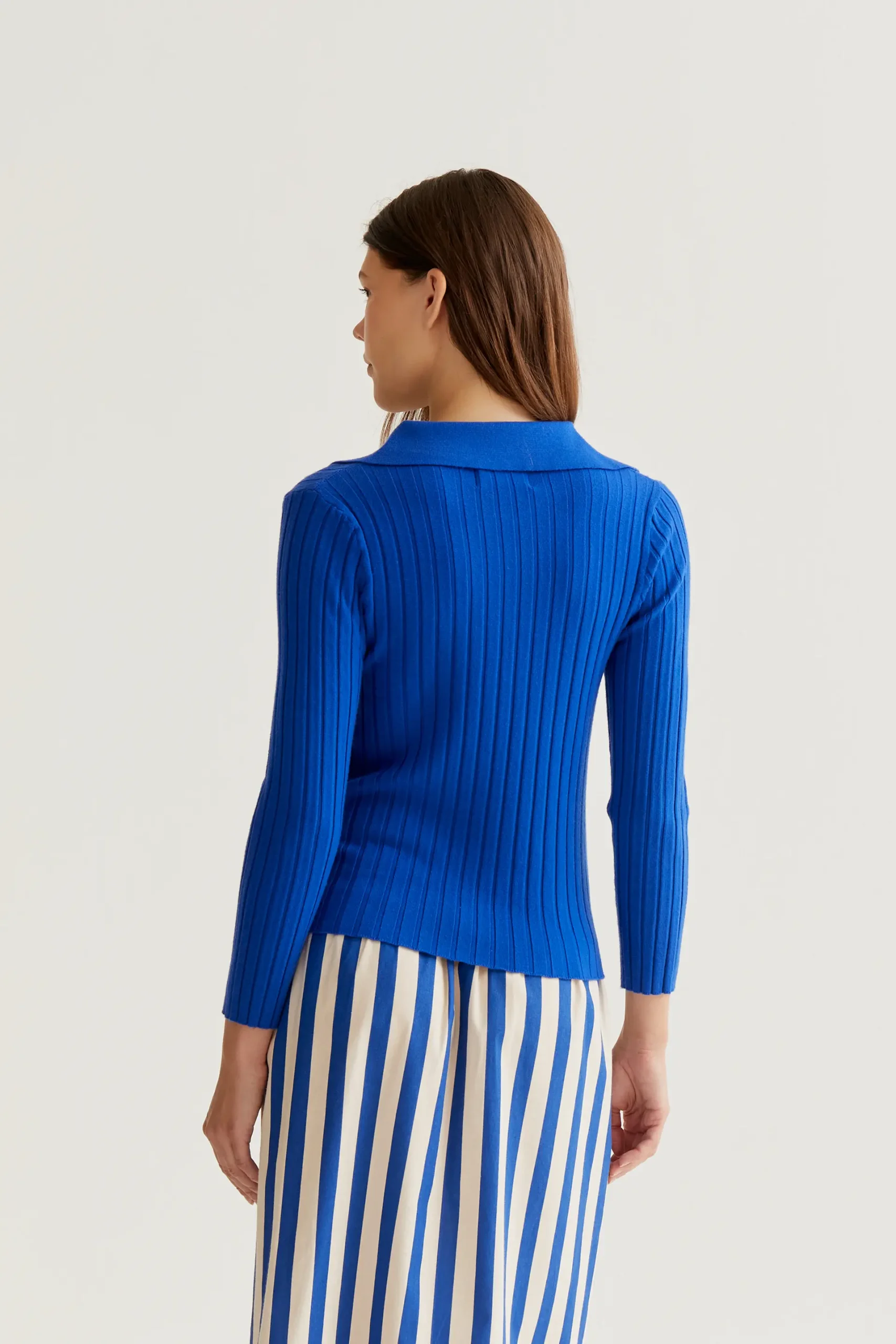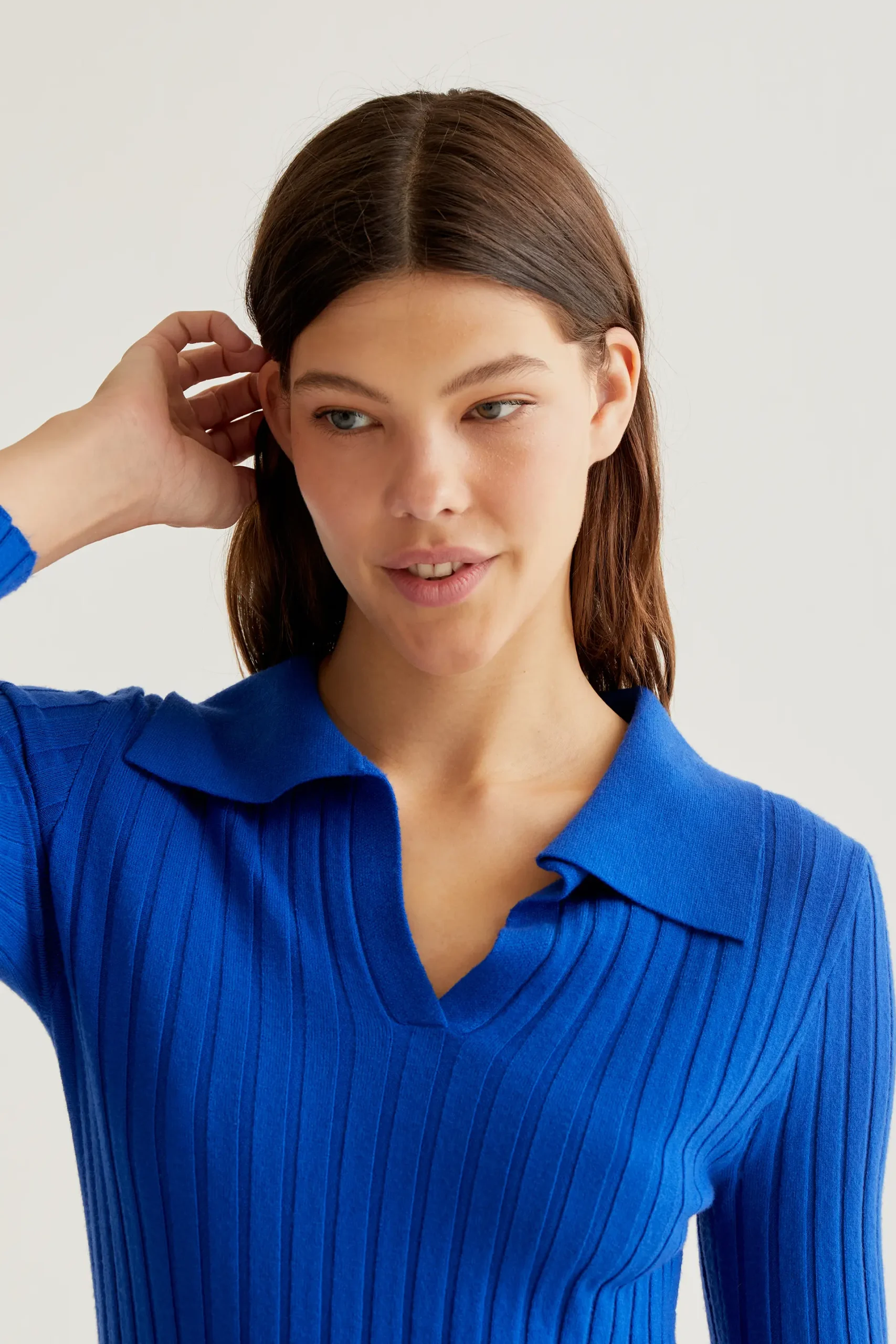 Jersey con tejido de punto de color azul. Cuello solapa y escote pico. Hombro ligeramente caído con manga larga. Detalles de relieve en forma rayas verticales. Acabados en rib. La modelo mide 177 cm y lleva la talla S.