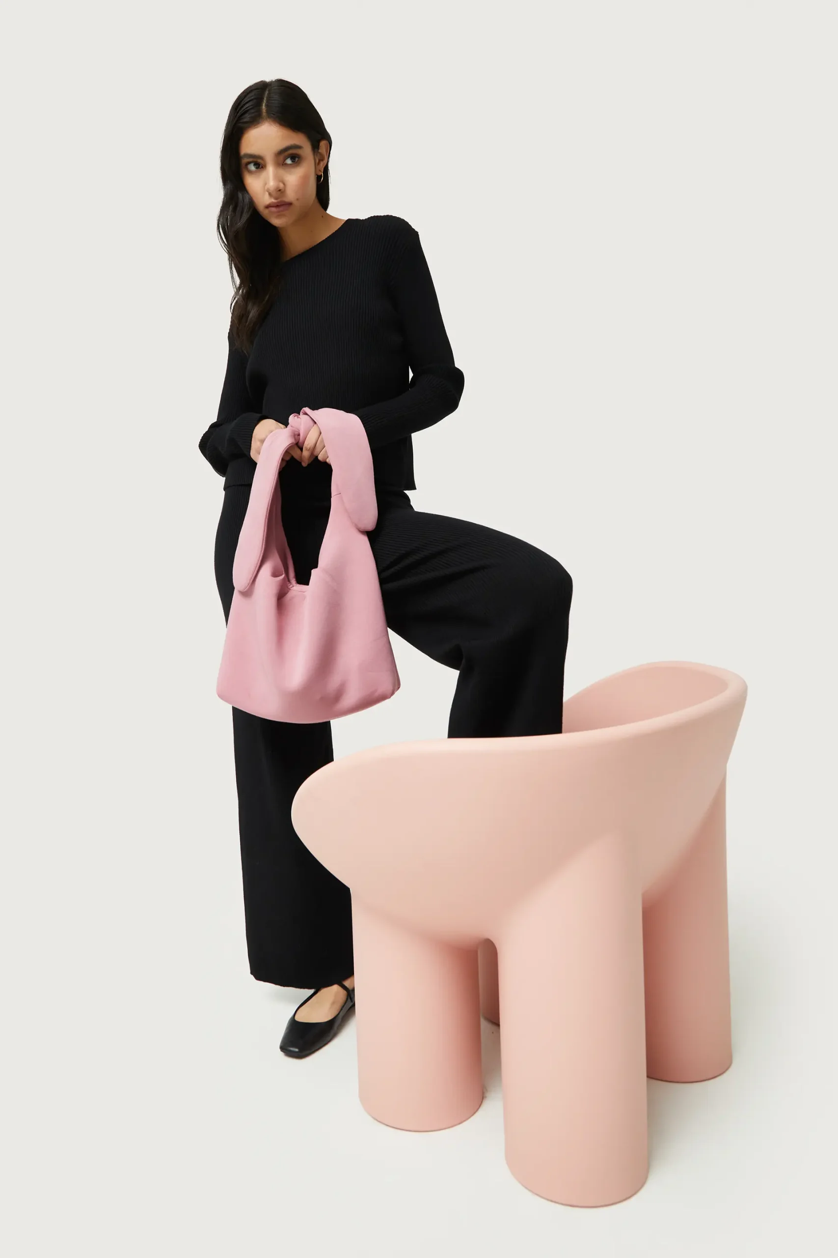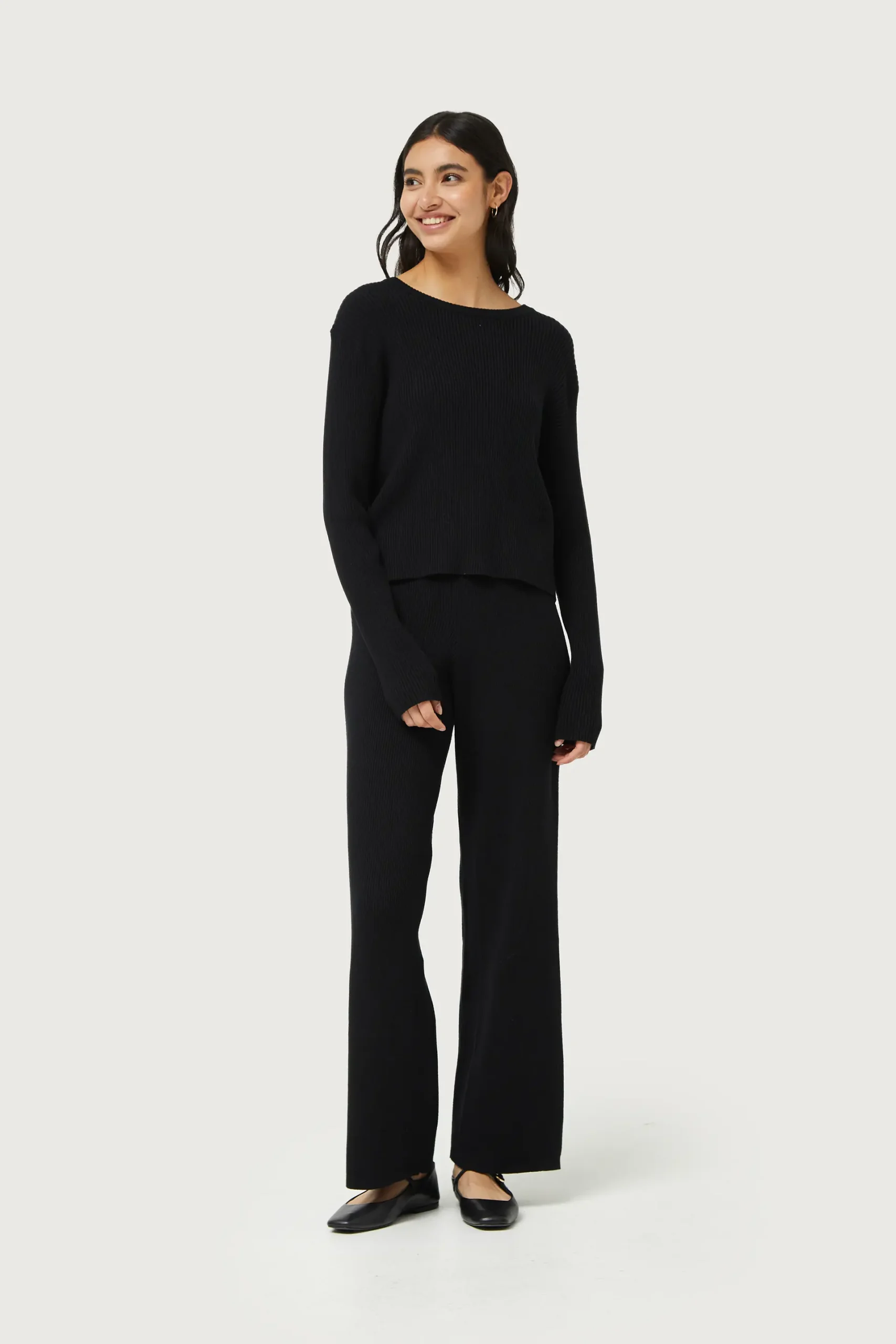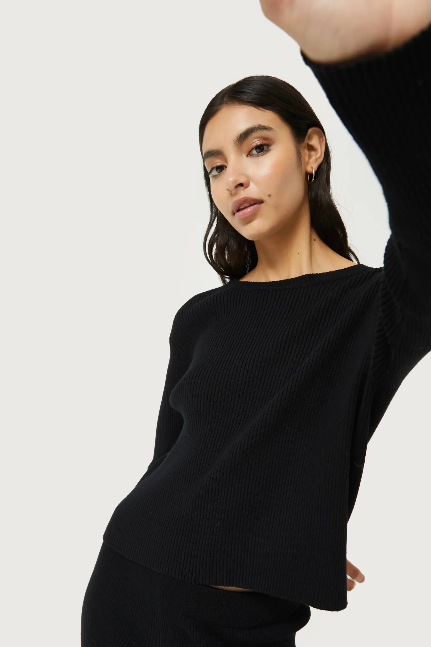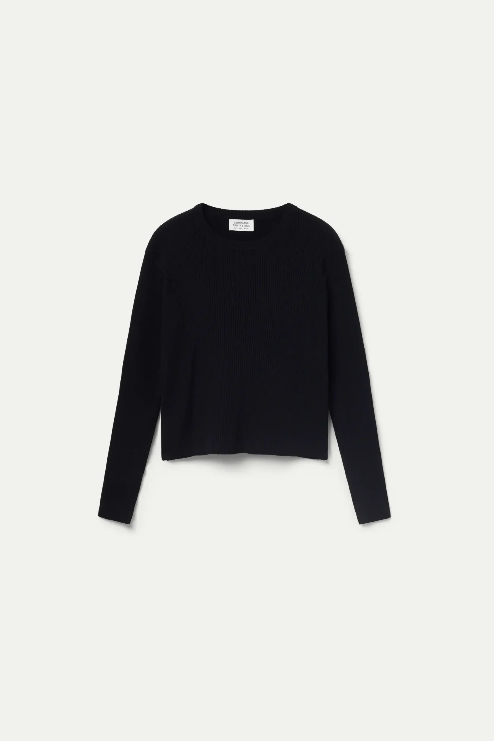 Jersey de punto en canalé de color negro. Con cuello redondo y manga larga. La modelo mide 176 cm y lleva la talla S.