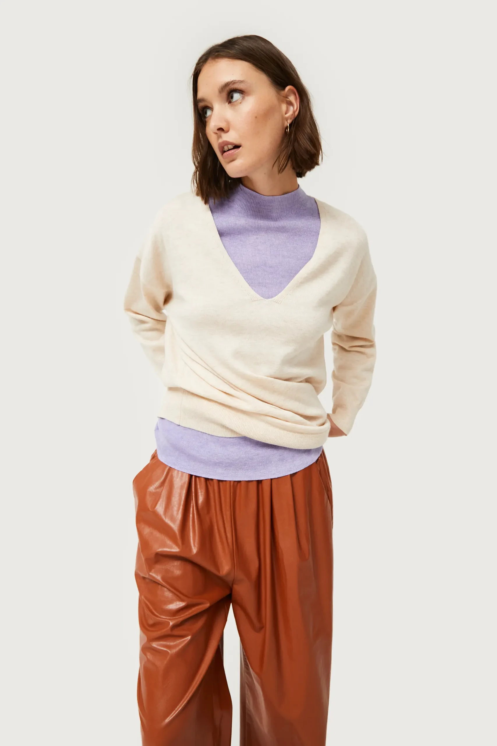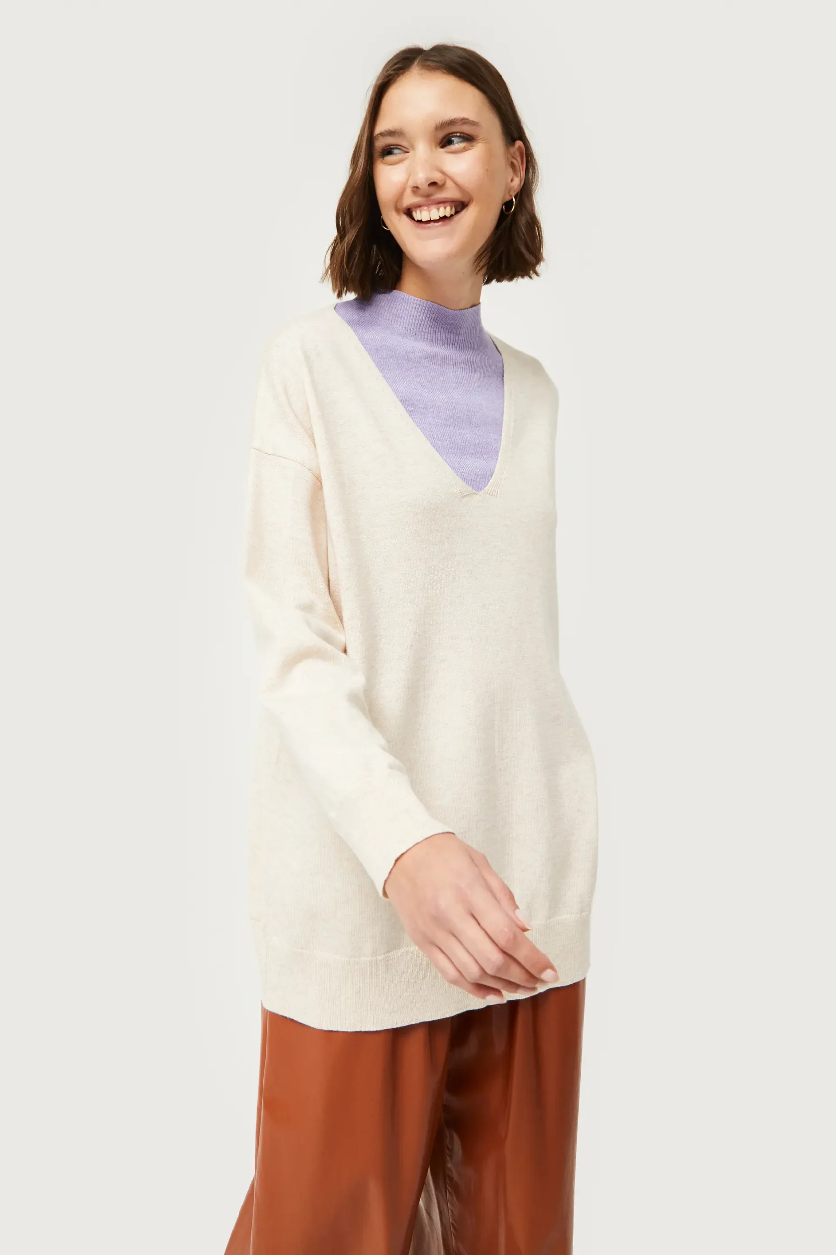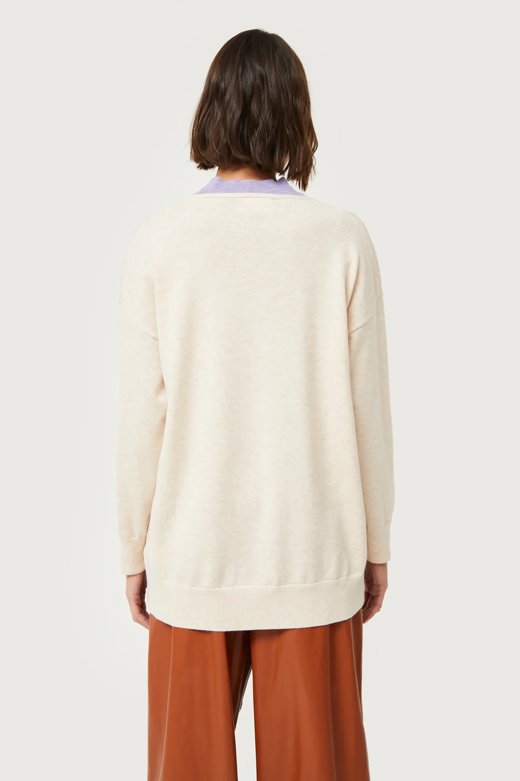 Jersey de punto de color blanco roto. Con cuello pico y manga larga con hombro ligeramente caído. La modelo mide 176 cm y lleva la talla S.