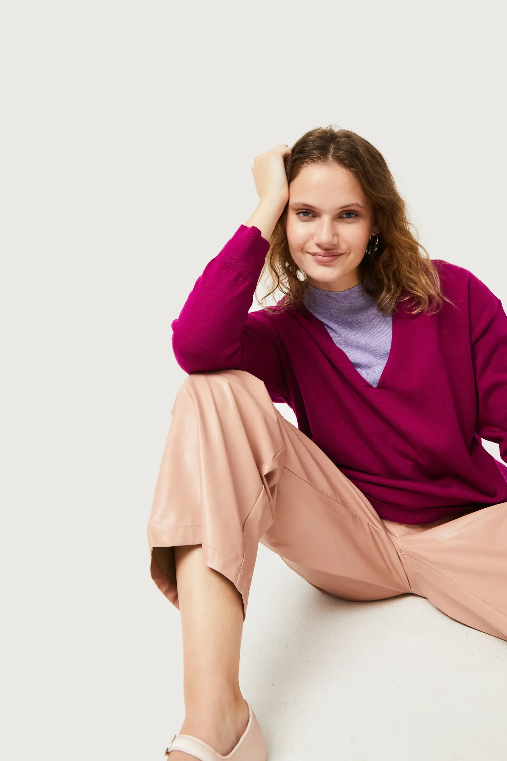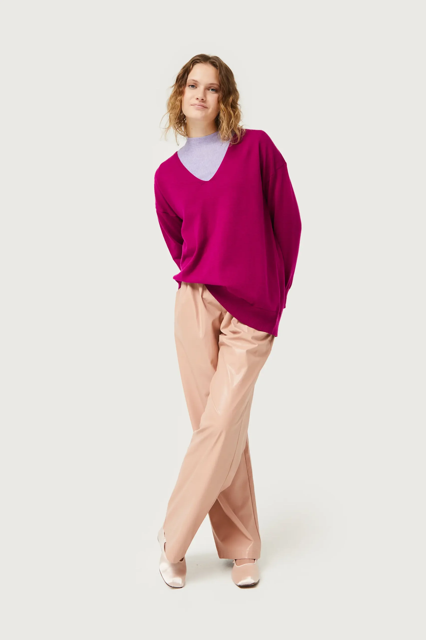 Jersey de punto de color fucsia. Con cuello pico y manga larga con hombro ligeramente caído. La modelo mide 175 cm y lleva la talla S.