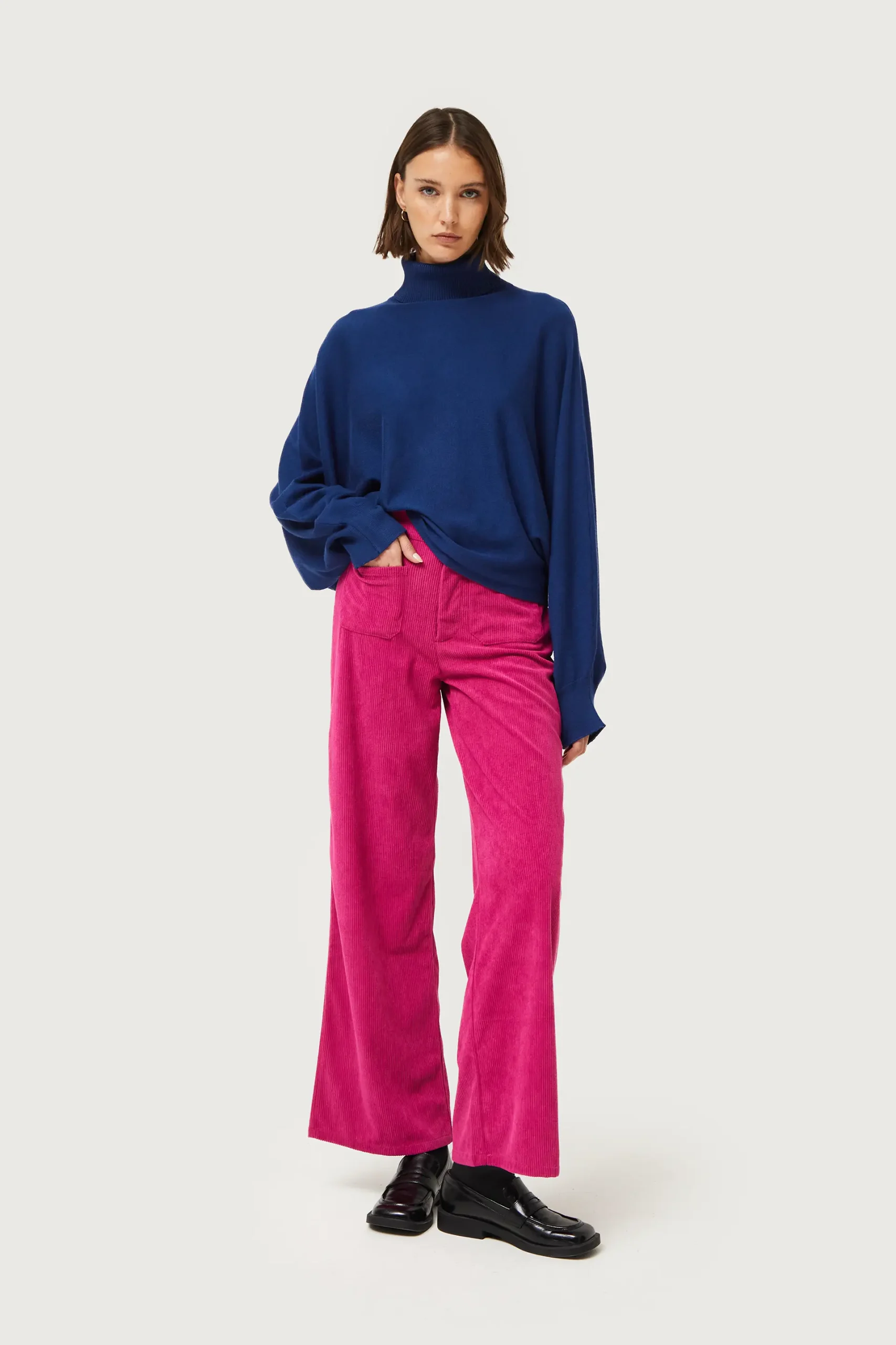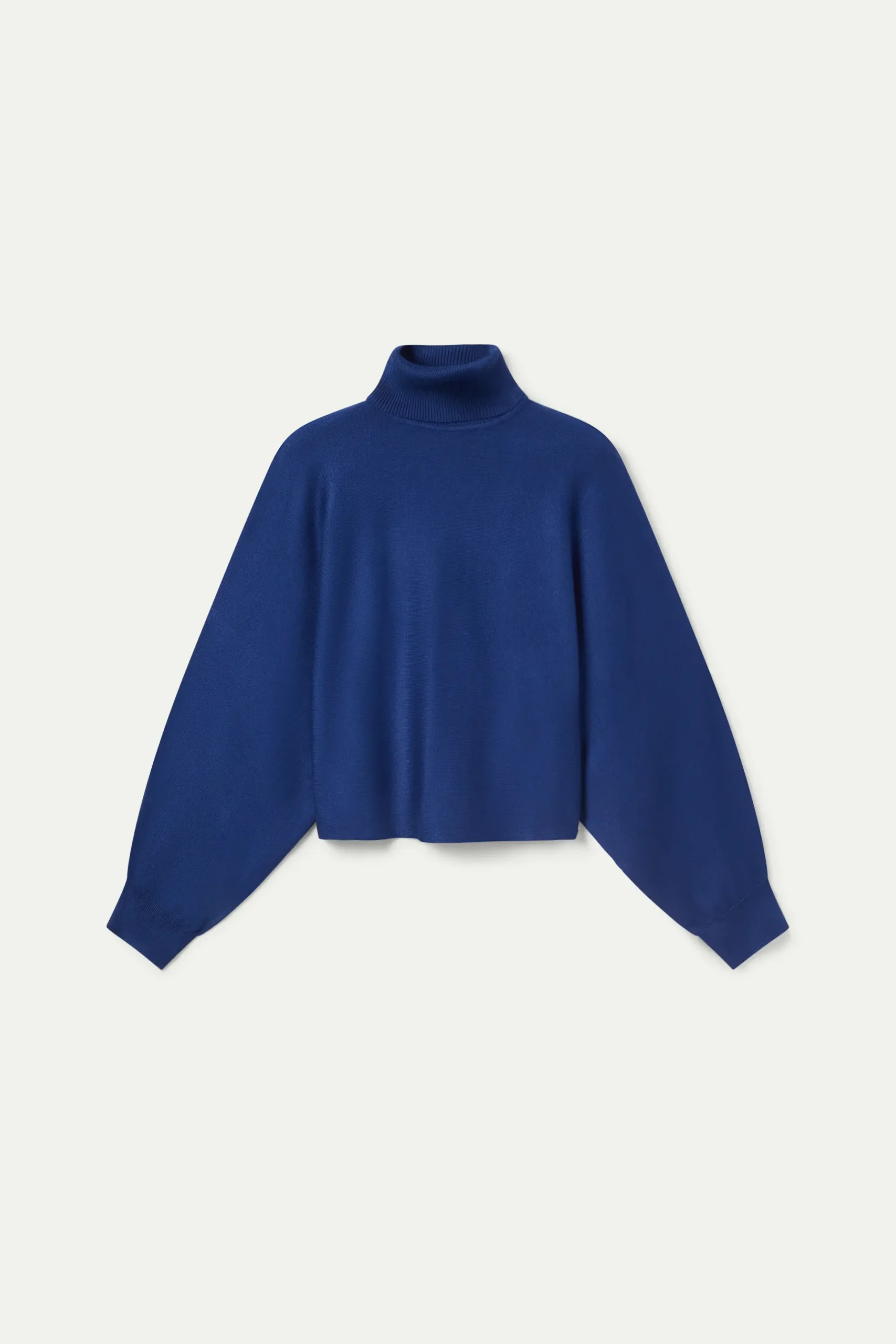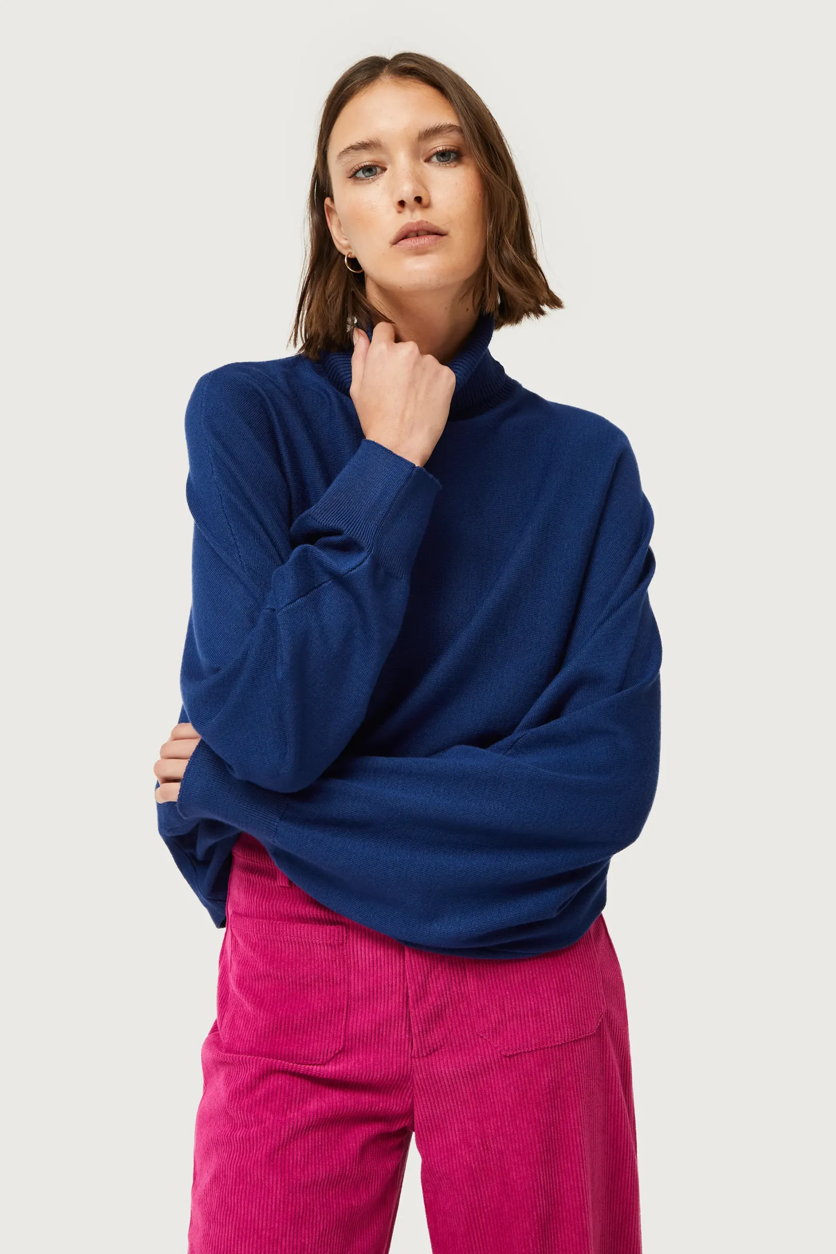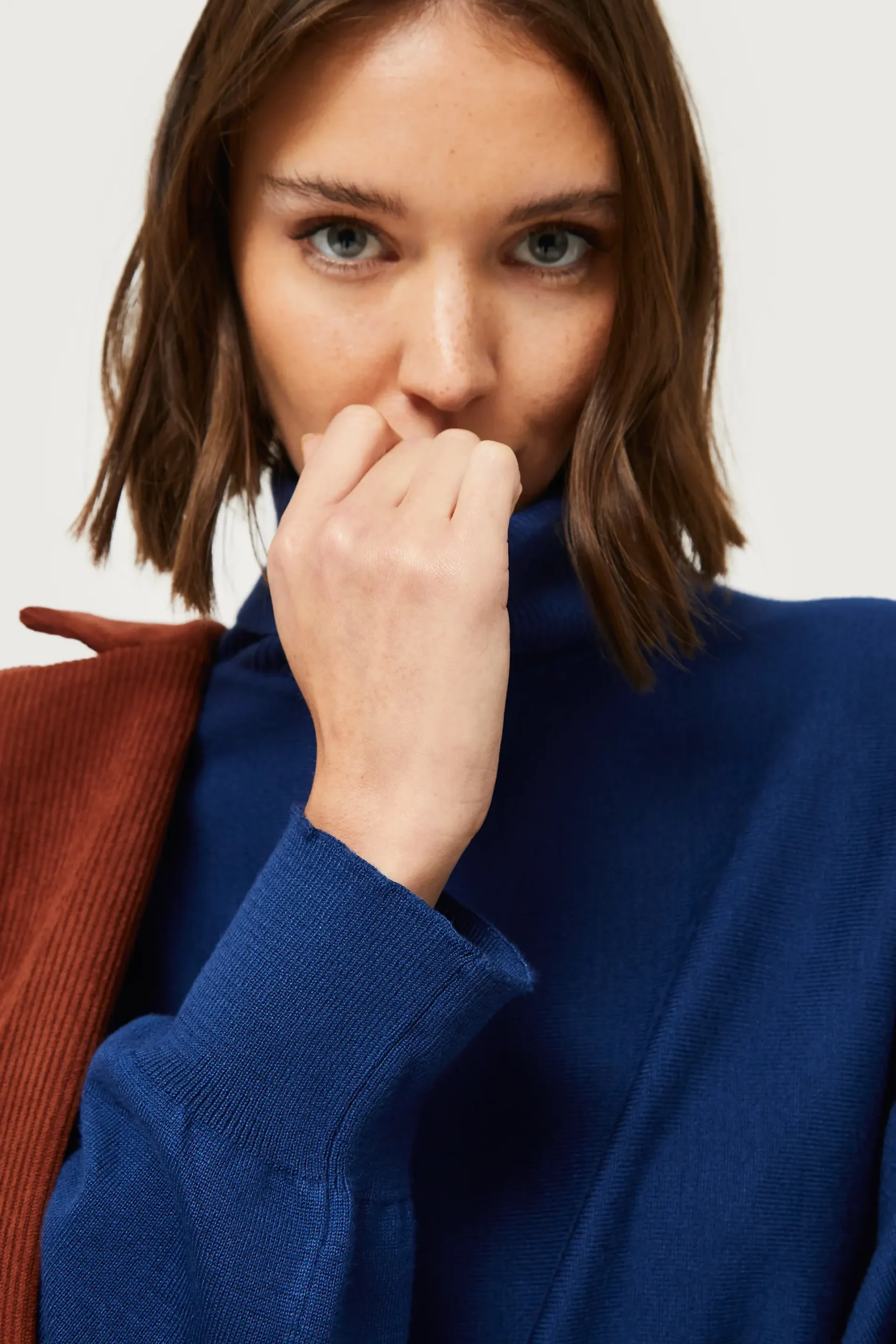 Jersey de punto de color azul marino. Con cuello vuelto y manga larga con hombro caído. Detalle de puños en canalé. La modelo mide 176 cm y lleva la talla S.