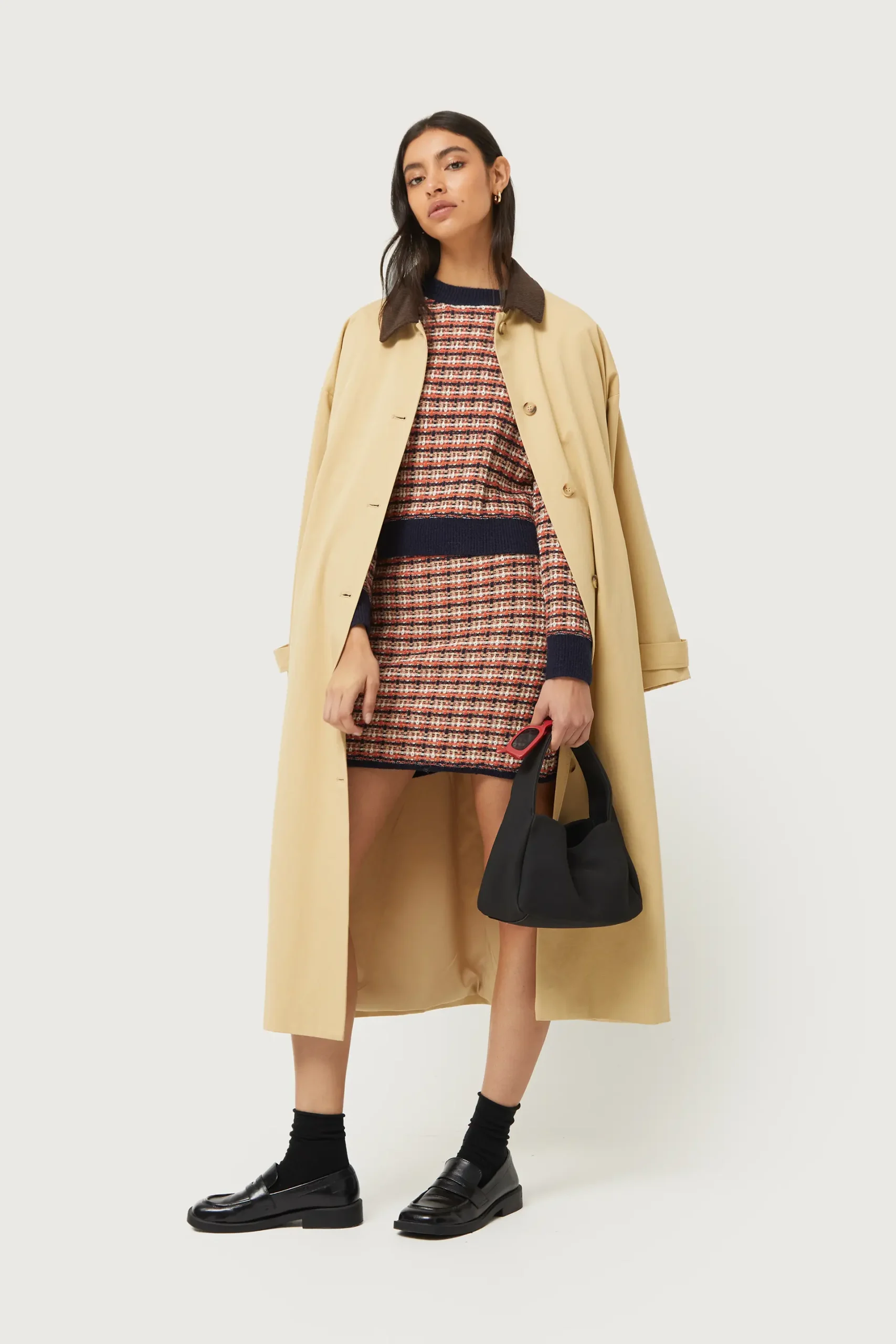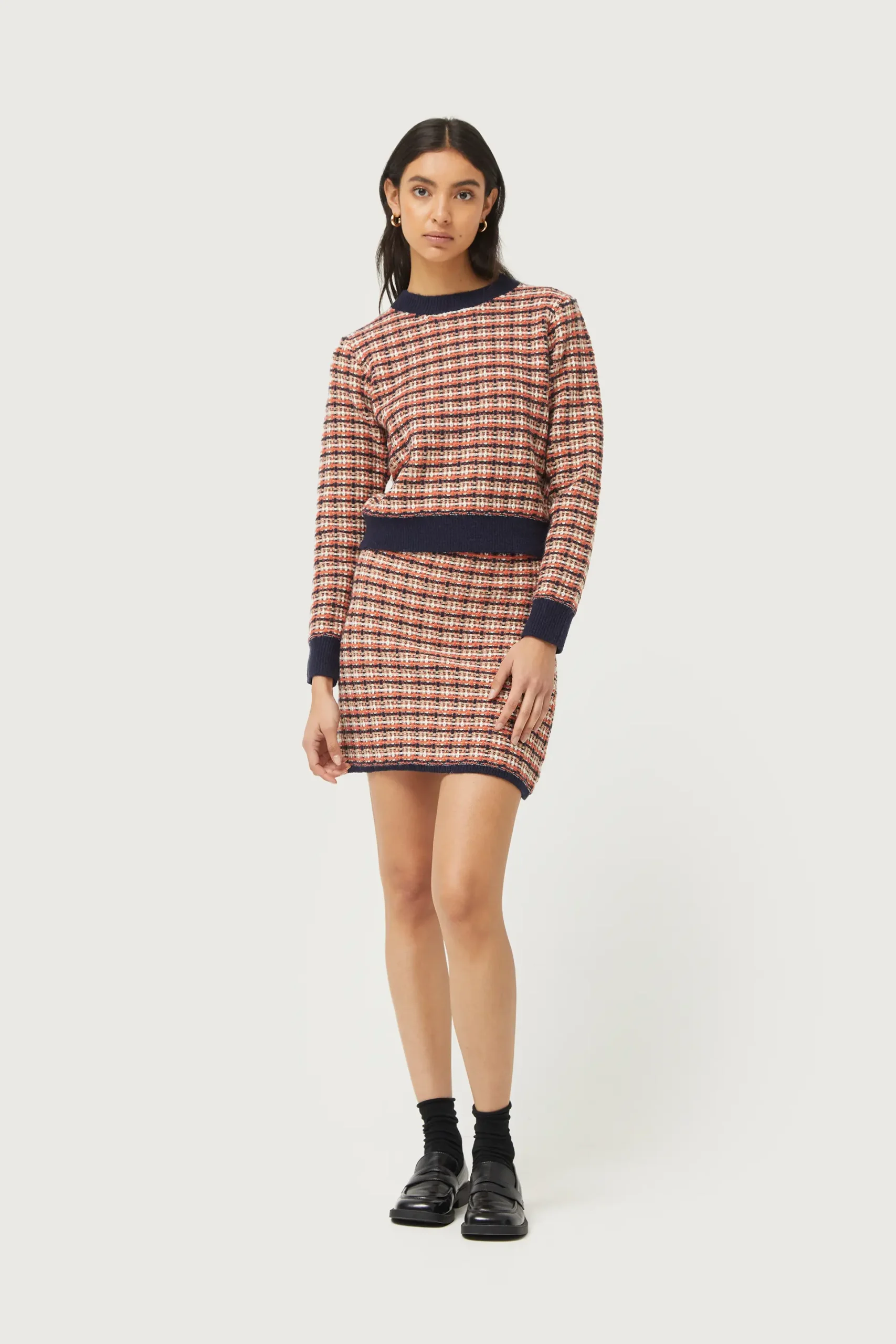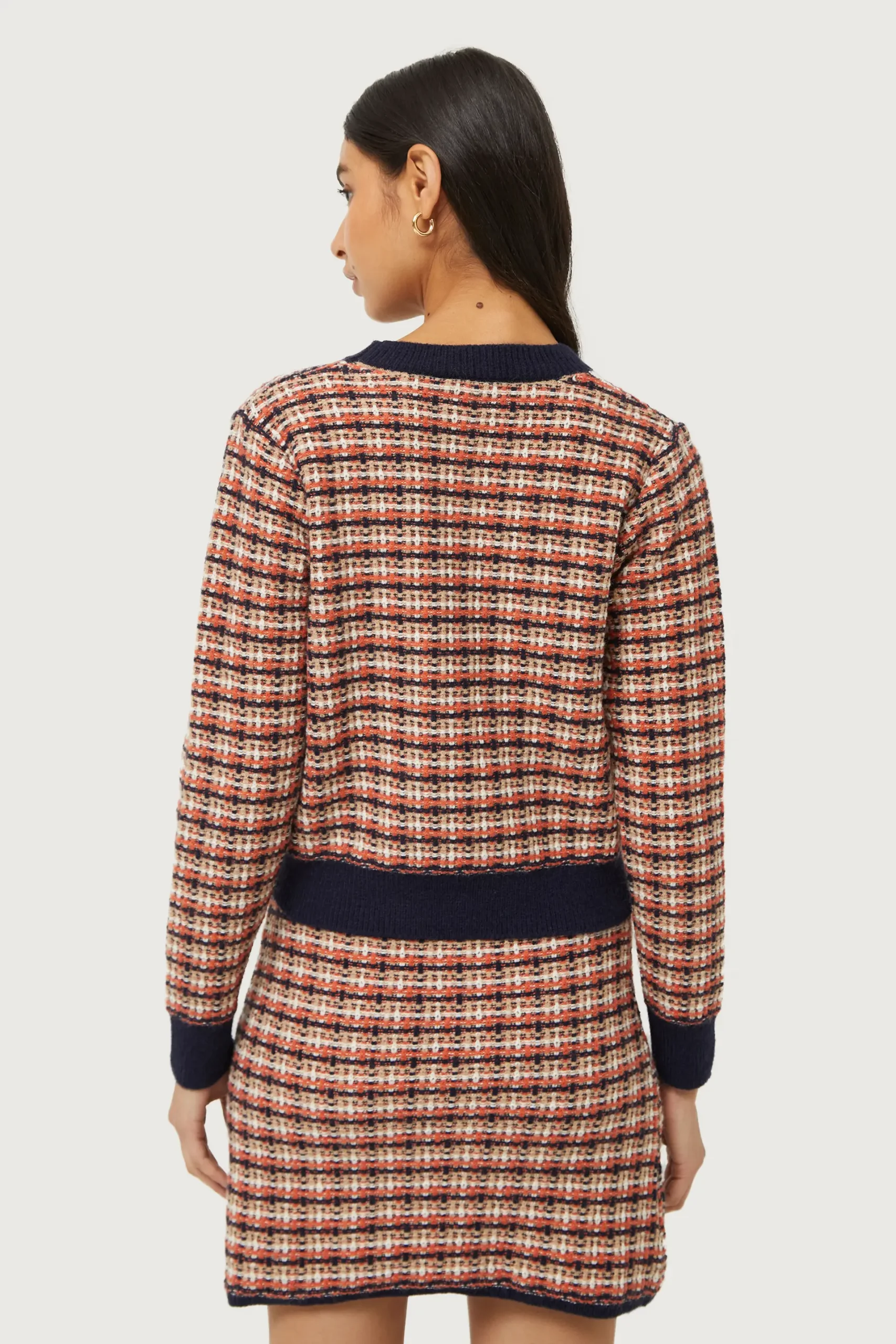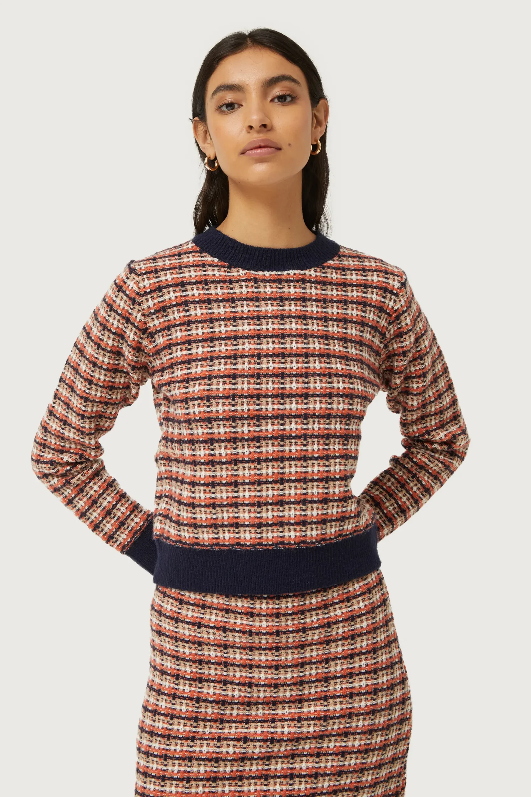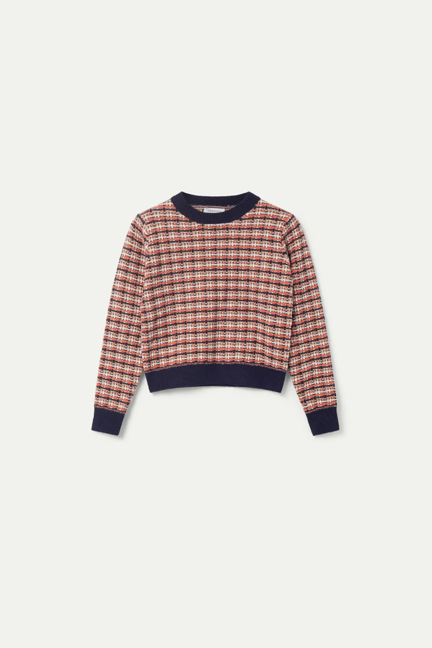 Jersey de punto con estampado de cuadros de color azul marino, rosa y blanco. Con cuello redondo y manga larga. Detalle de acabados en canalé en contraste. La modelo mide 176 cm y lleva la talla S.