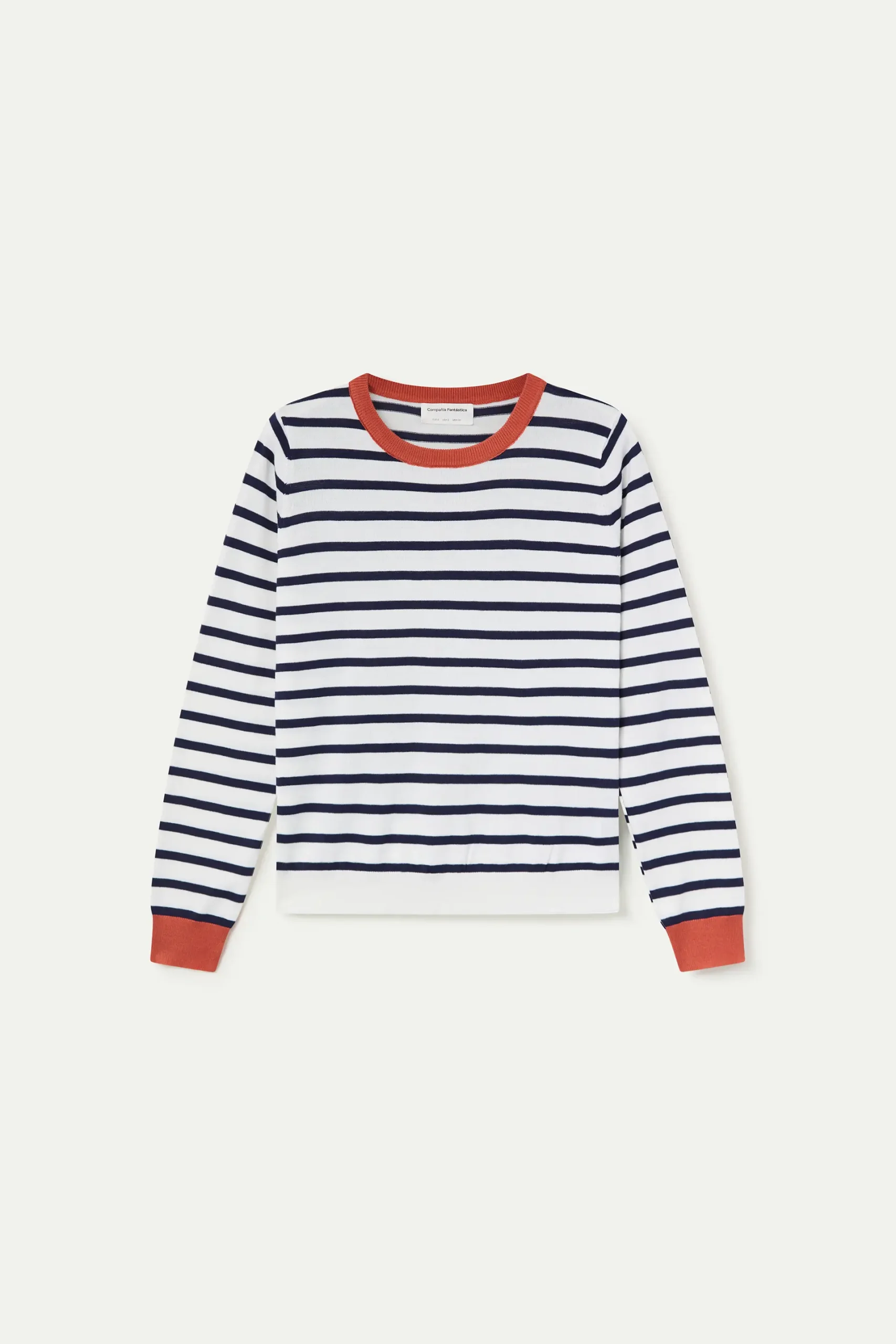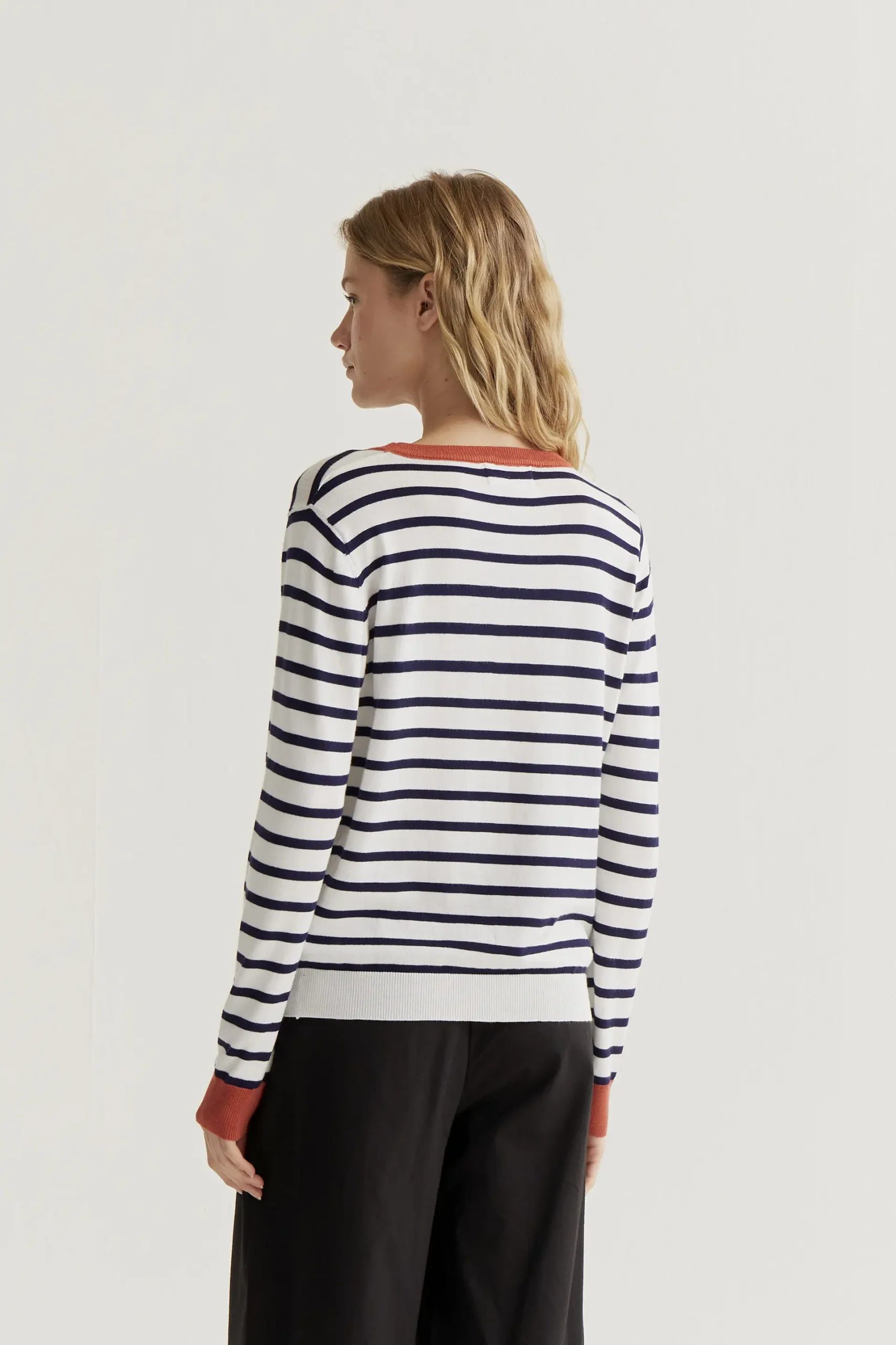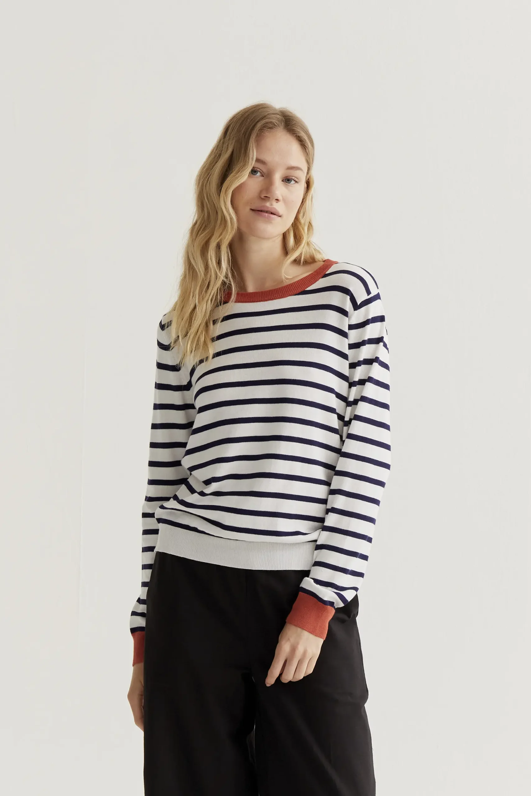 Jersey con tejido de punto estampado de rayas de color blanco y marino. Cuello redondo y manga larga con detalles en color rojo. Acabados en rib. La modelo mide 177 cm y lleva la talla S.