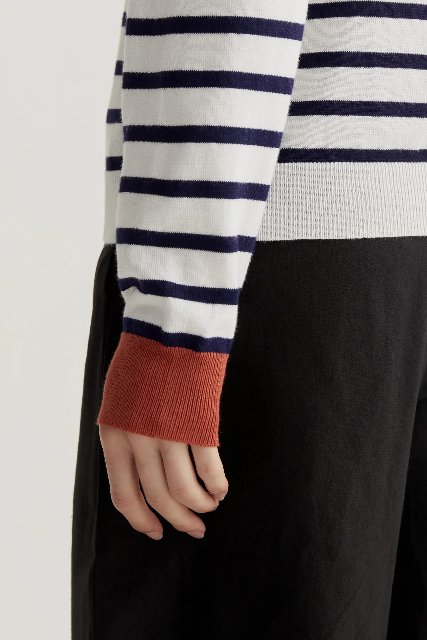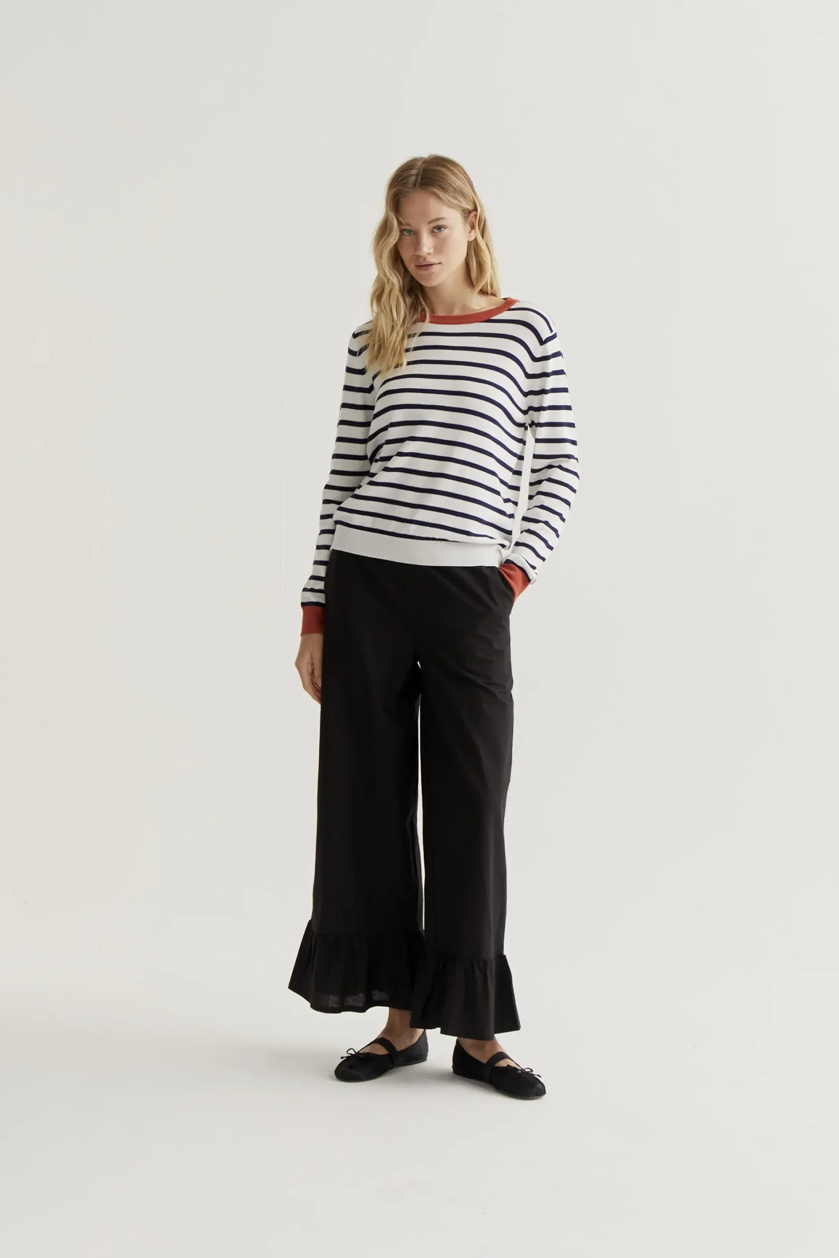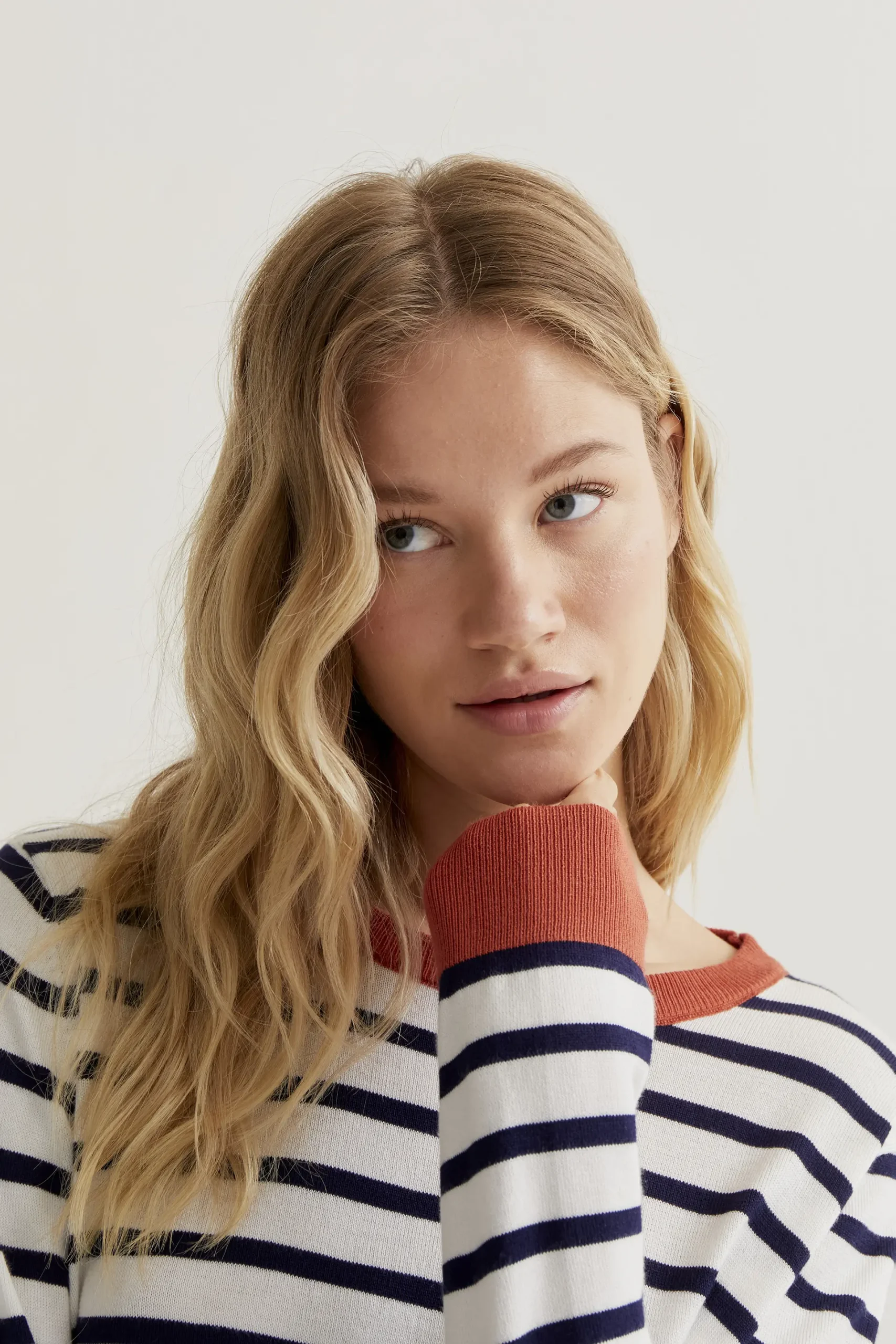 Jersey con tejido de punto estampado de rayas de color blanco y marino. Cuello redondo y manga larga con detalles en color rojo. Acabados en rib. La modelo mide 177 cm y lleva la talla S.
