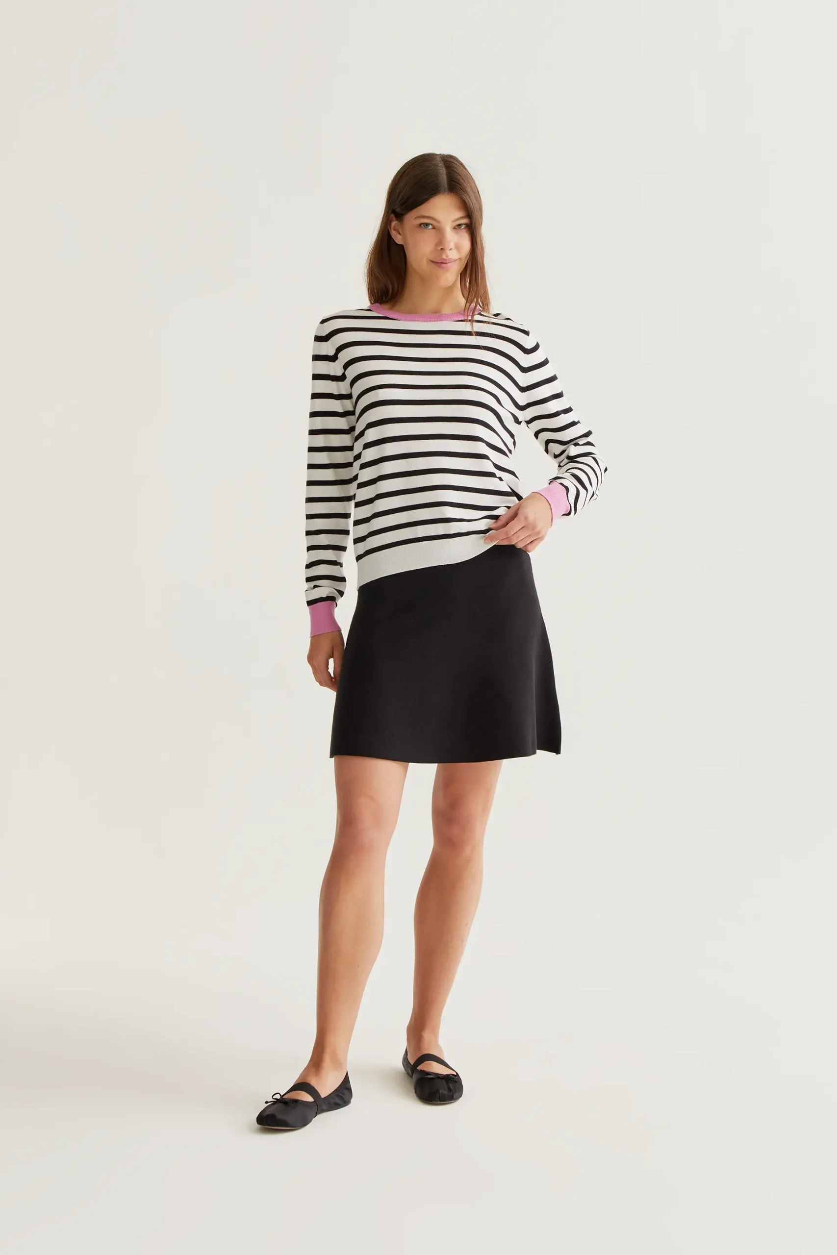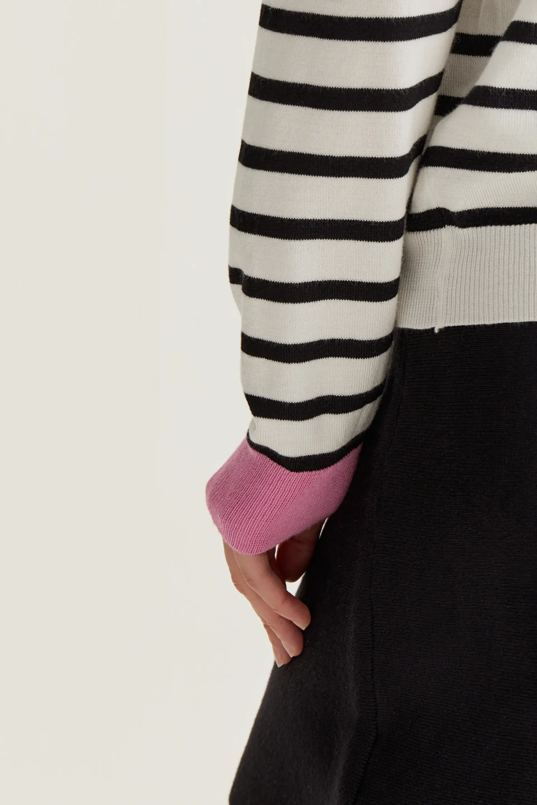 Jersey con tejido de punto estampado de rayas de color blanco y negro. Cuello redondo y manga larga con detalles en color rosa. Acabados en rib. La modelo mide 177 cm y lleva la talla S.