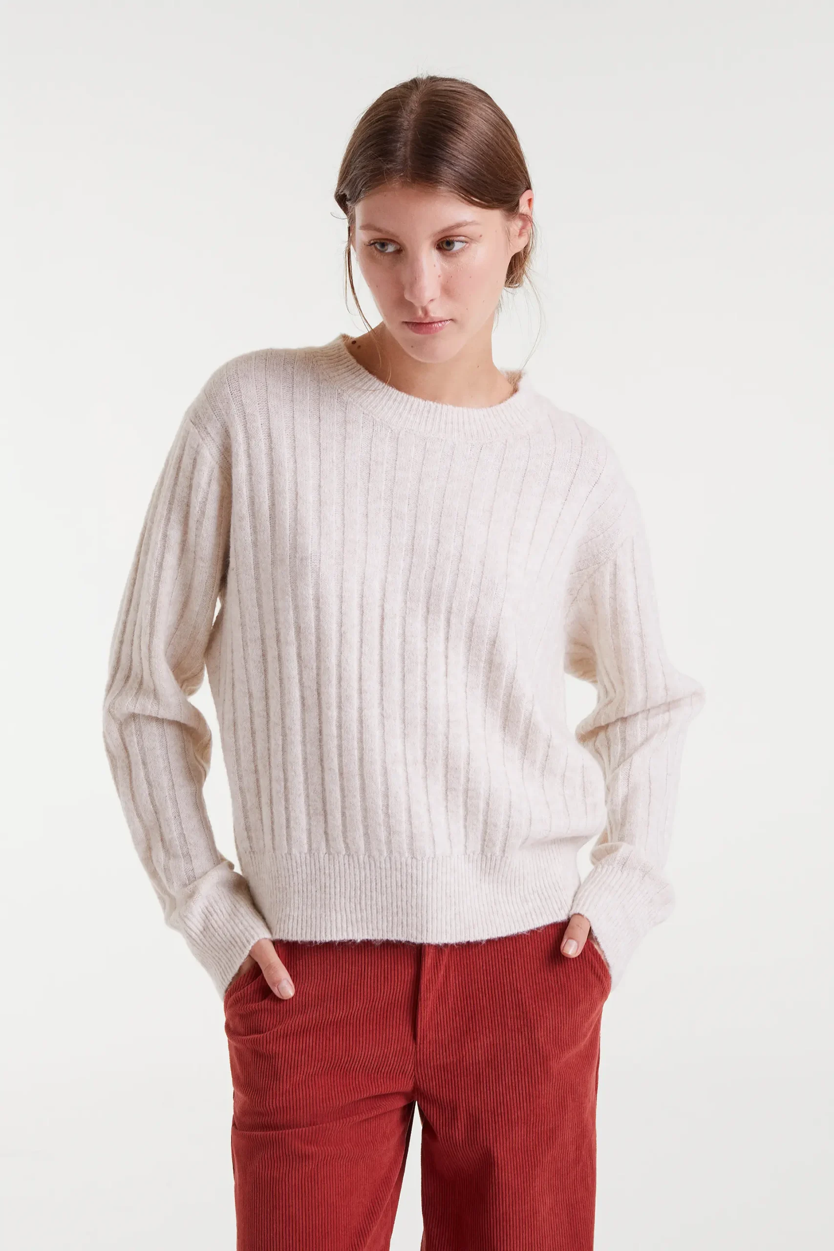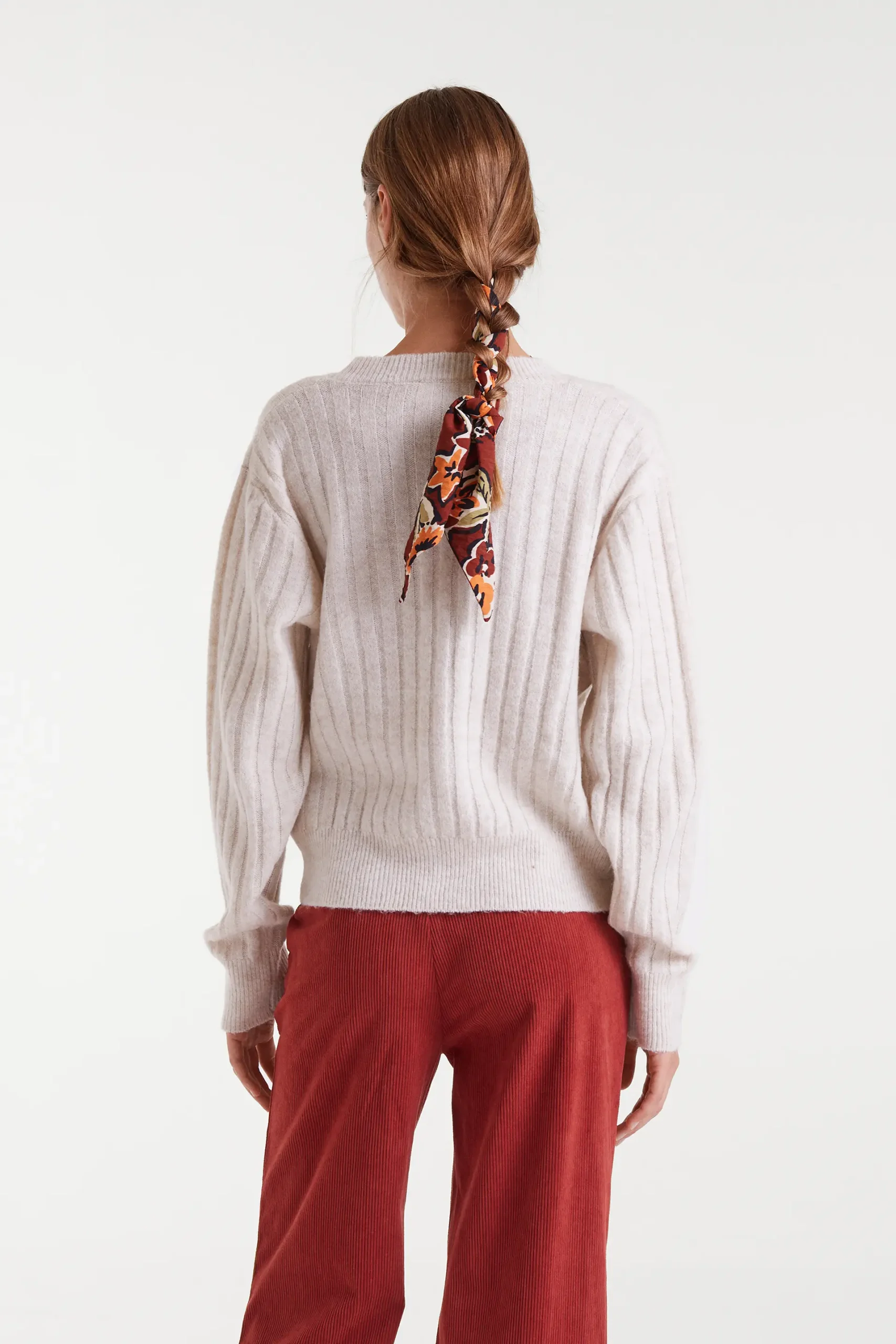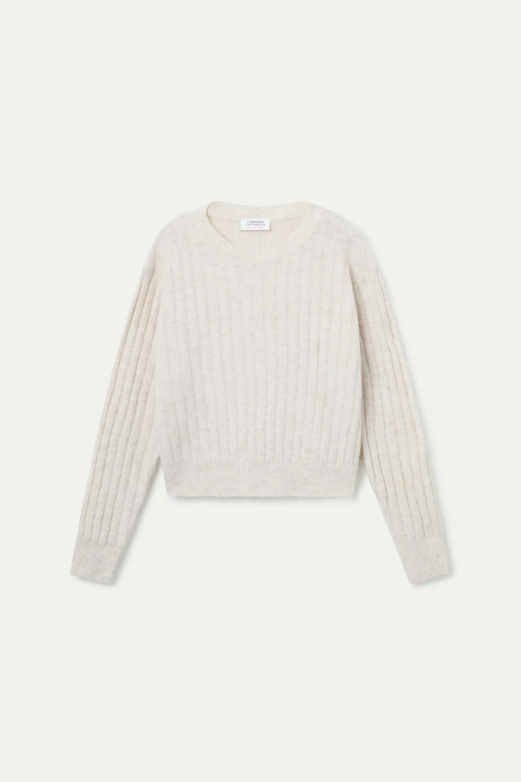 Jersey de punto con rayas verticales de color blanco. Con cuello redondo y manga larga con hombro ligeramente caído. Detalles con acabados en rib. La modelo mide 177 cm y lleva la talla S.
