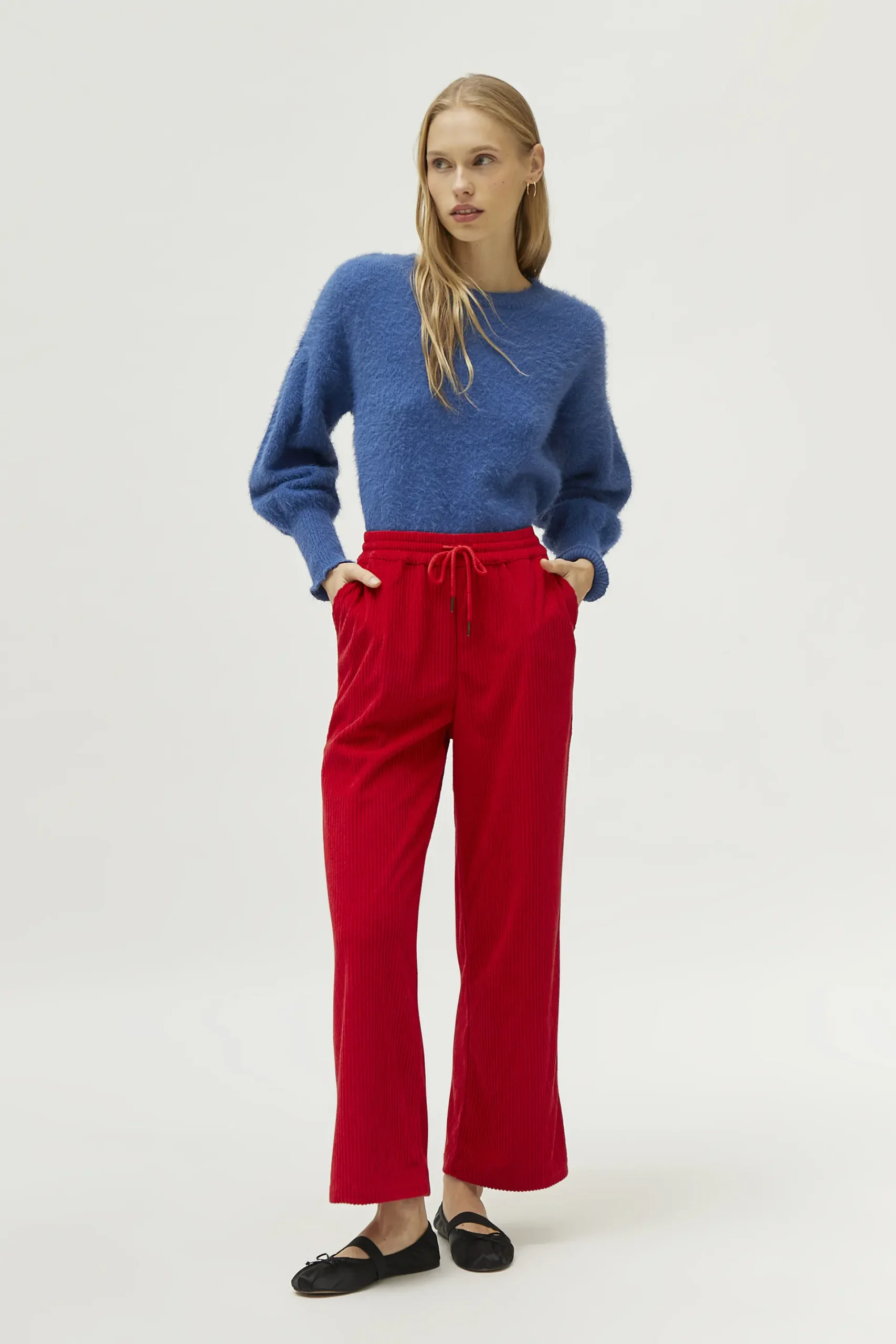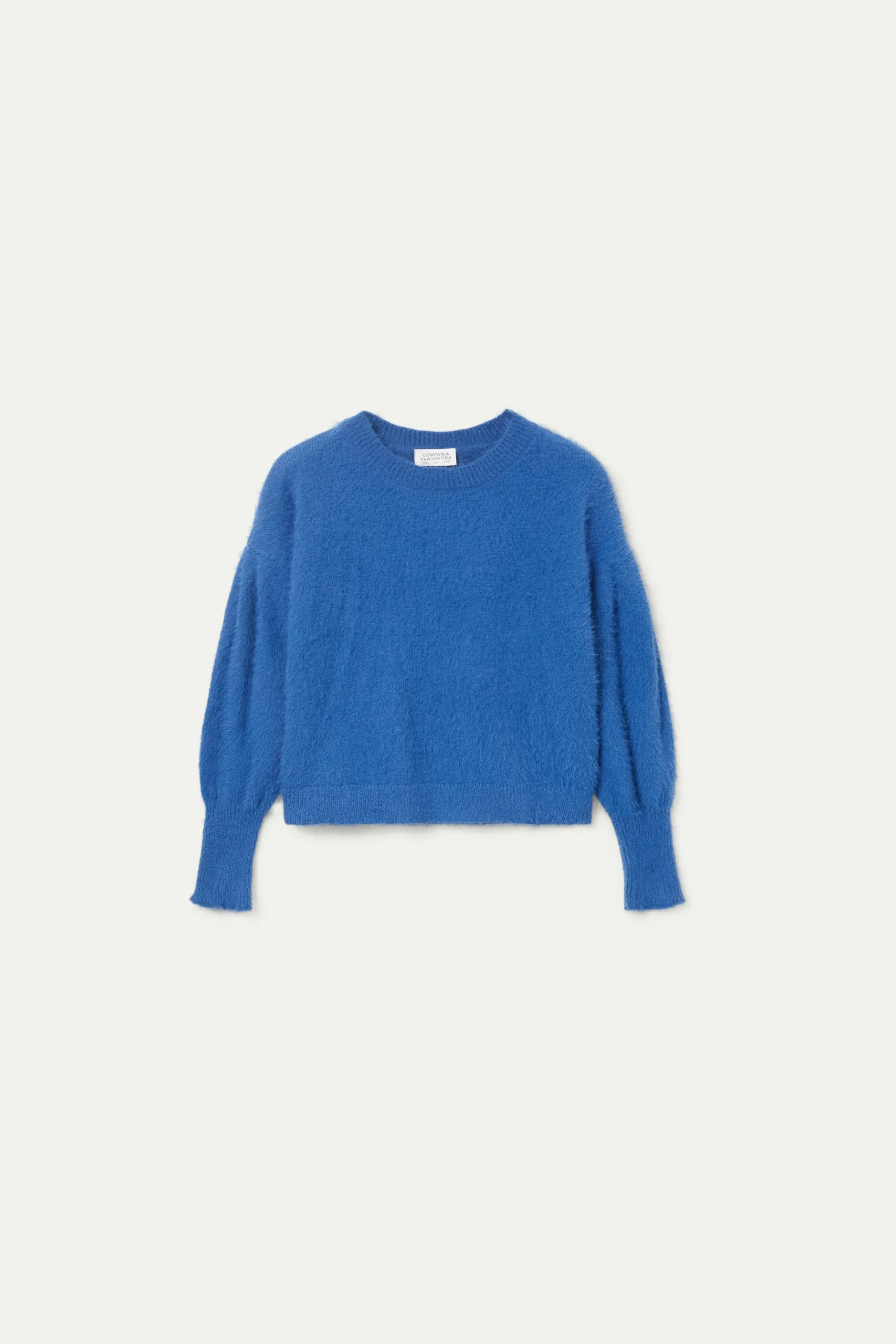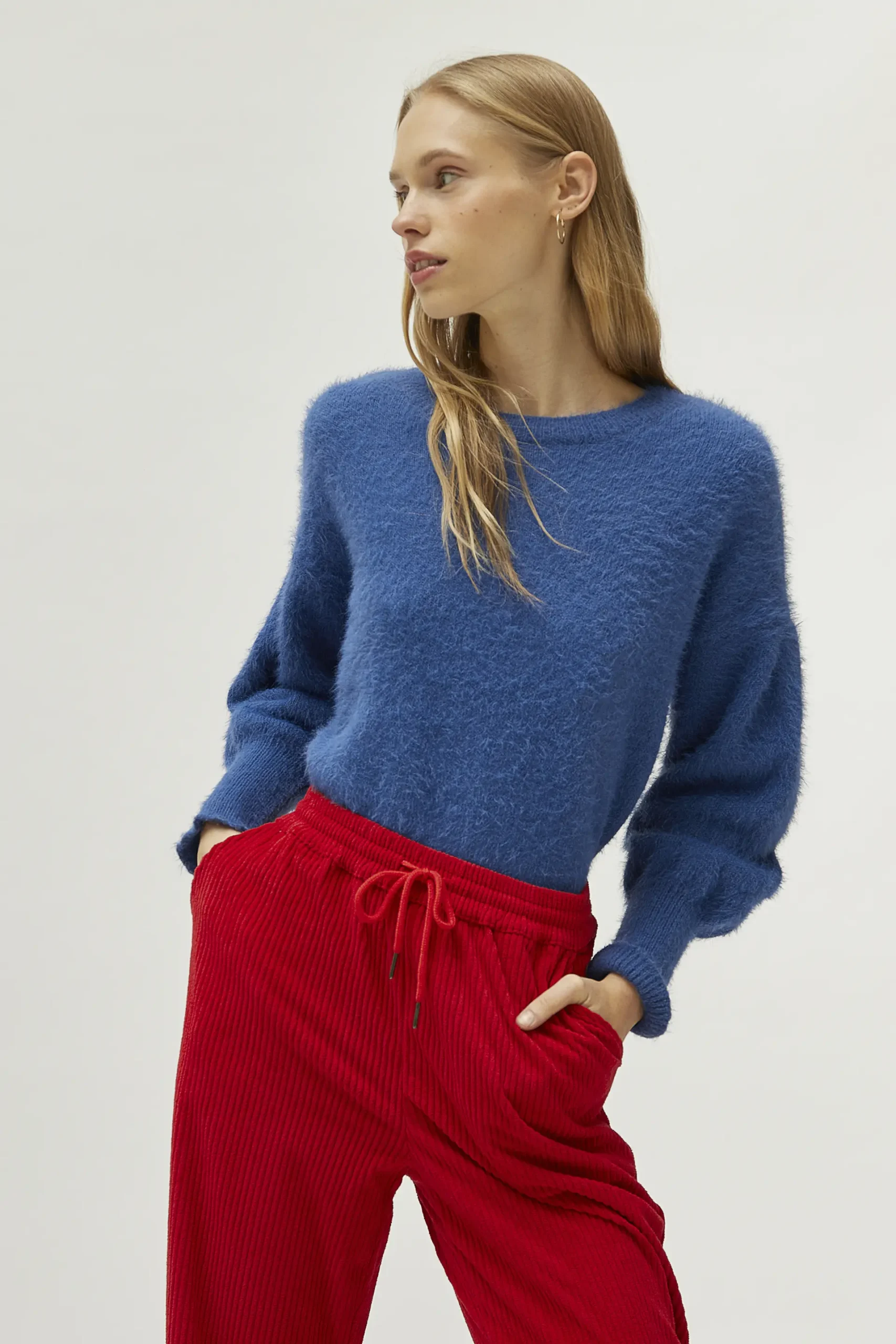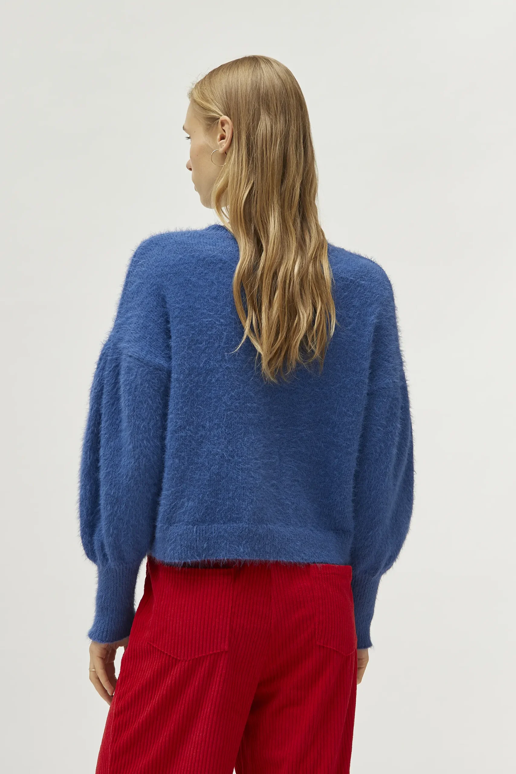 Jersey de punto con textura de color azul. Con cuello redondo y manga larga con hombros caídos. Detalle de puños elásticos. La modelo mide 174 cm y lleva la talla S.