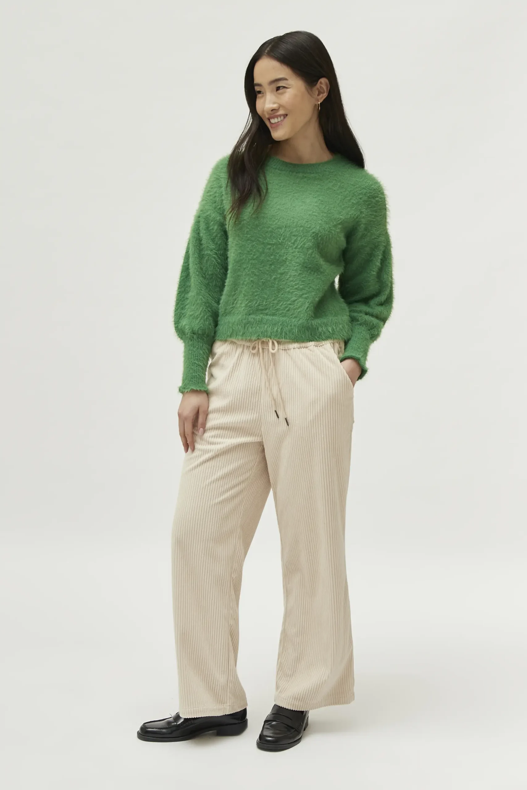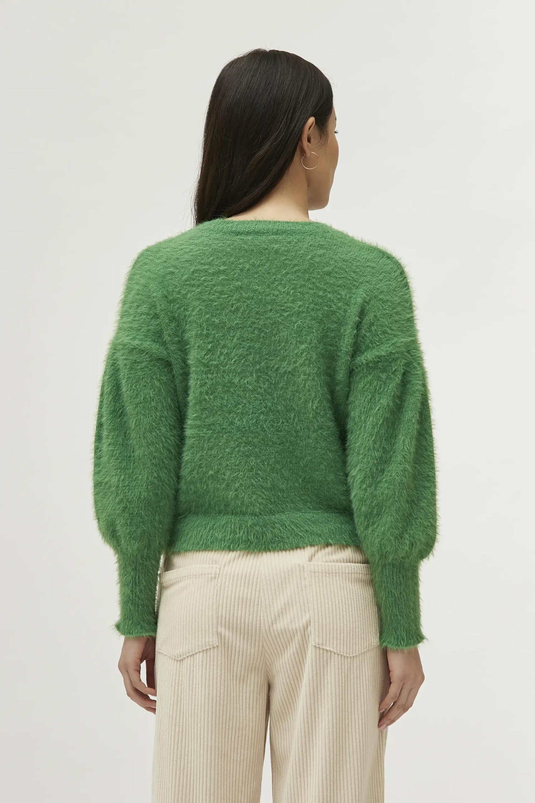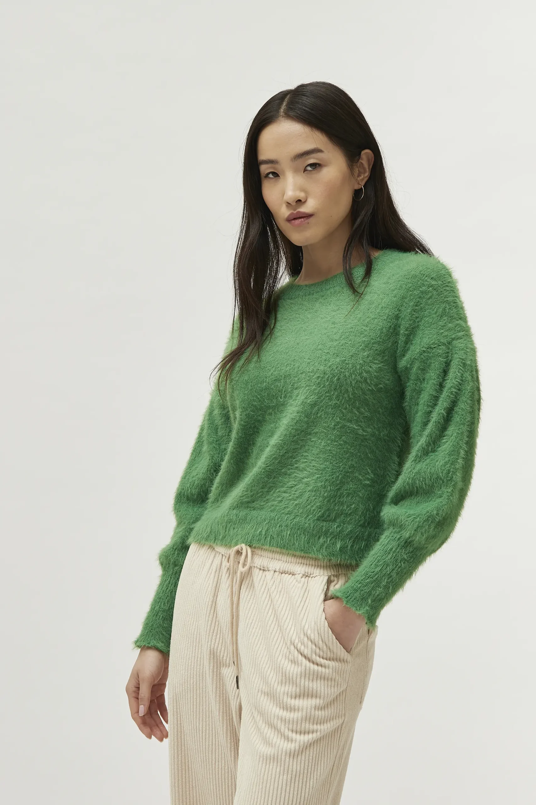 Jersey de punto con textura de color verde. Con cuello redondo y manga larga con hombros caídos. Detalle de puños elásticos. La modelo mide 171 cm y lleva la talla S.