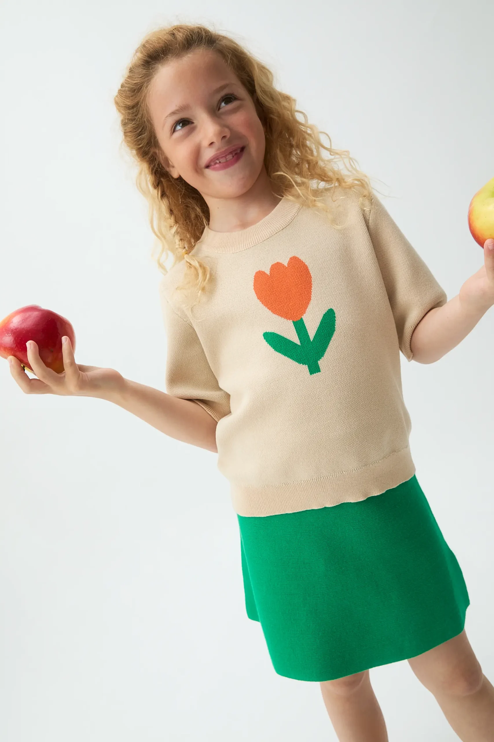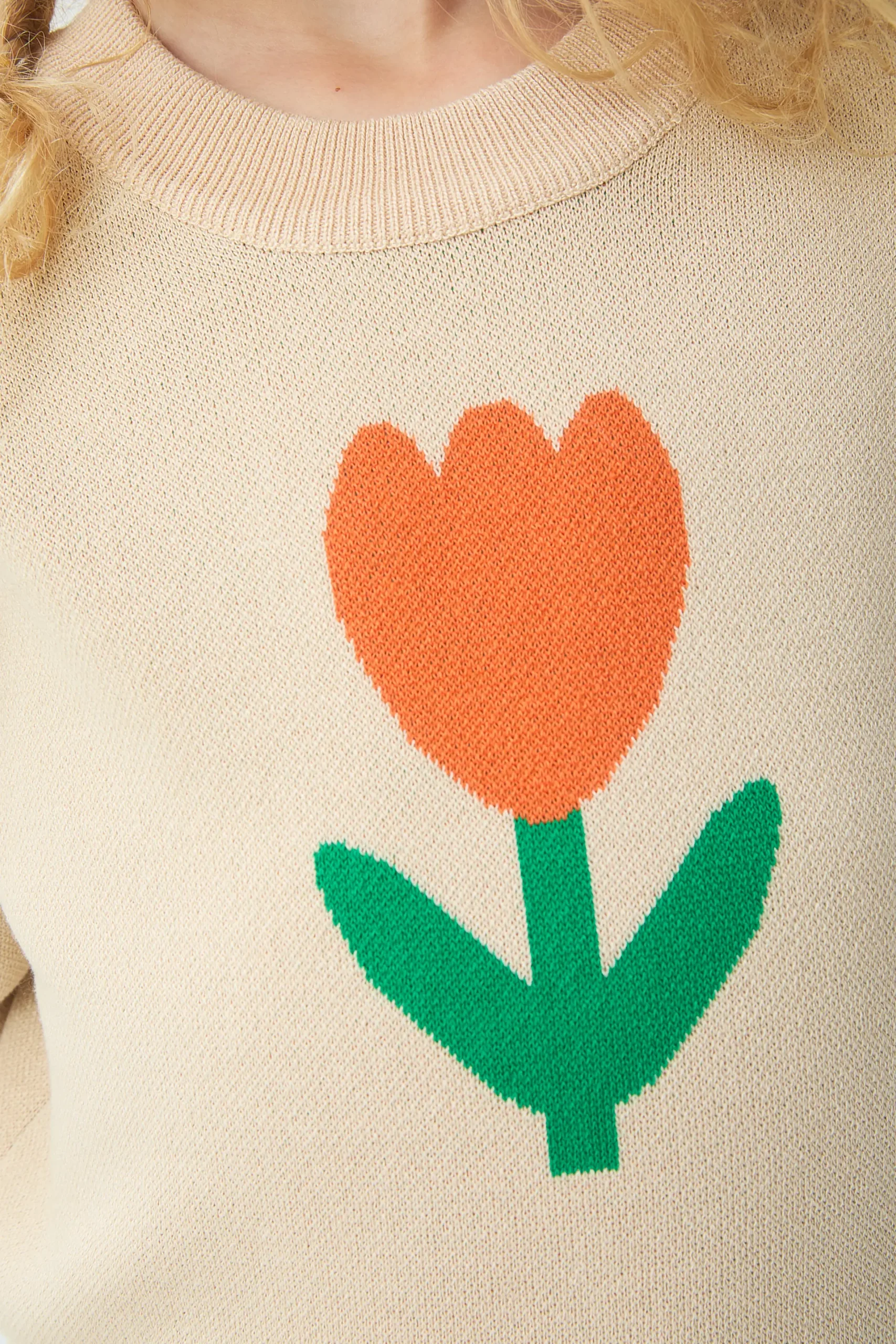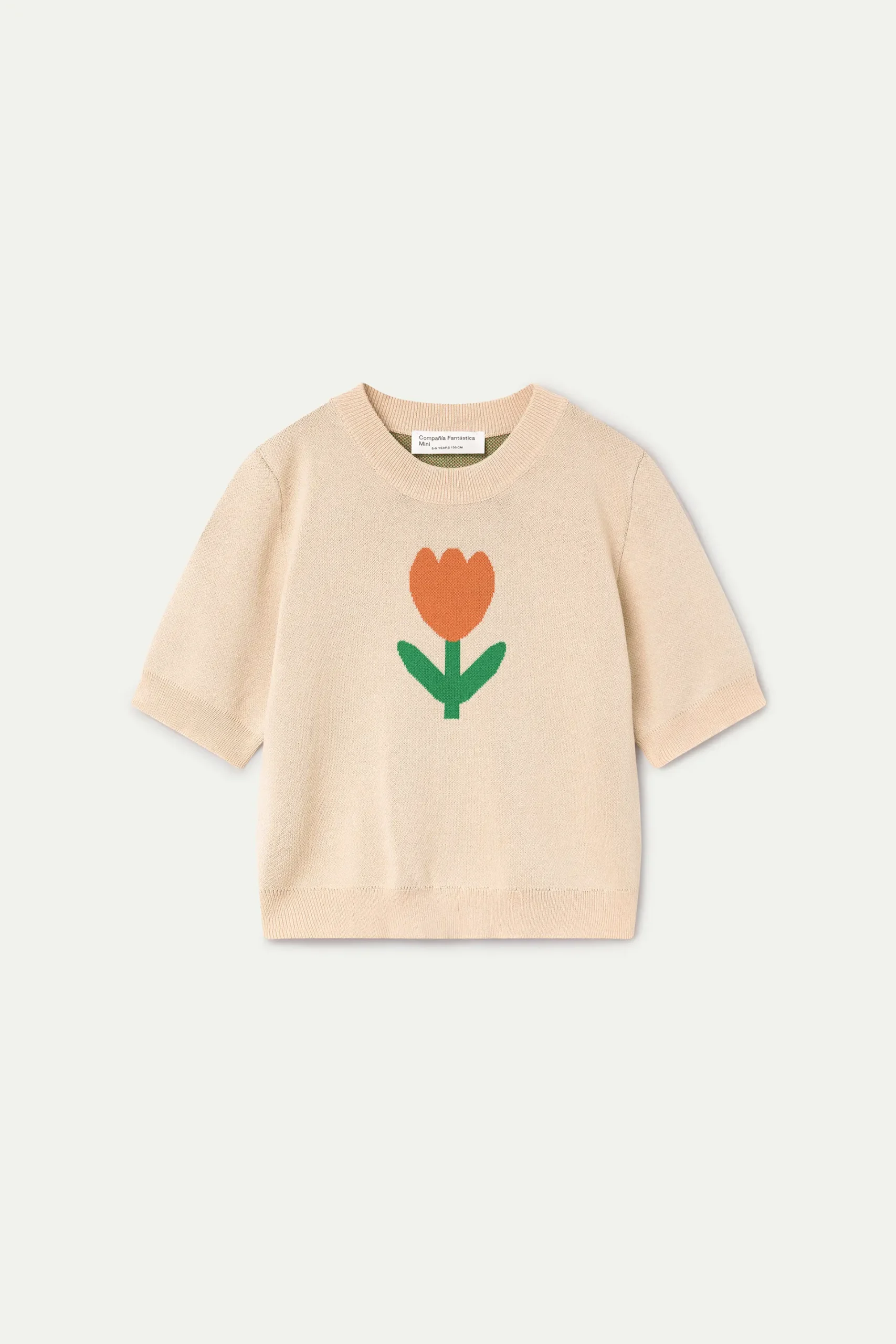 Jersey de punto de niña con tejido jacquard con estampado Big Tulip. Cuello redondo y manga corta. Detalles acabados en rib. La modelo mide 126 cm y lleva la talla 8-9 años