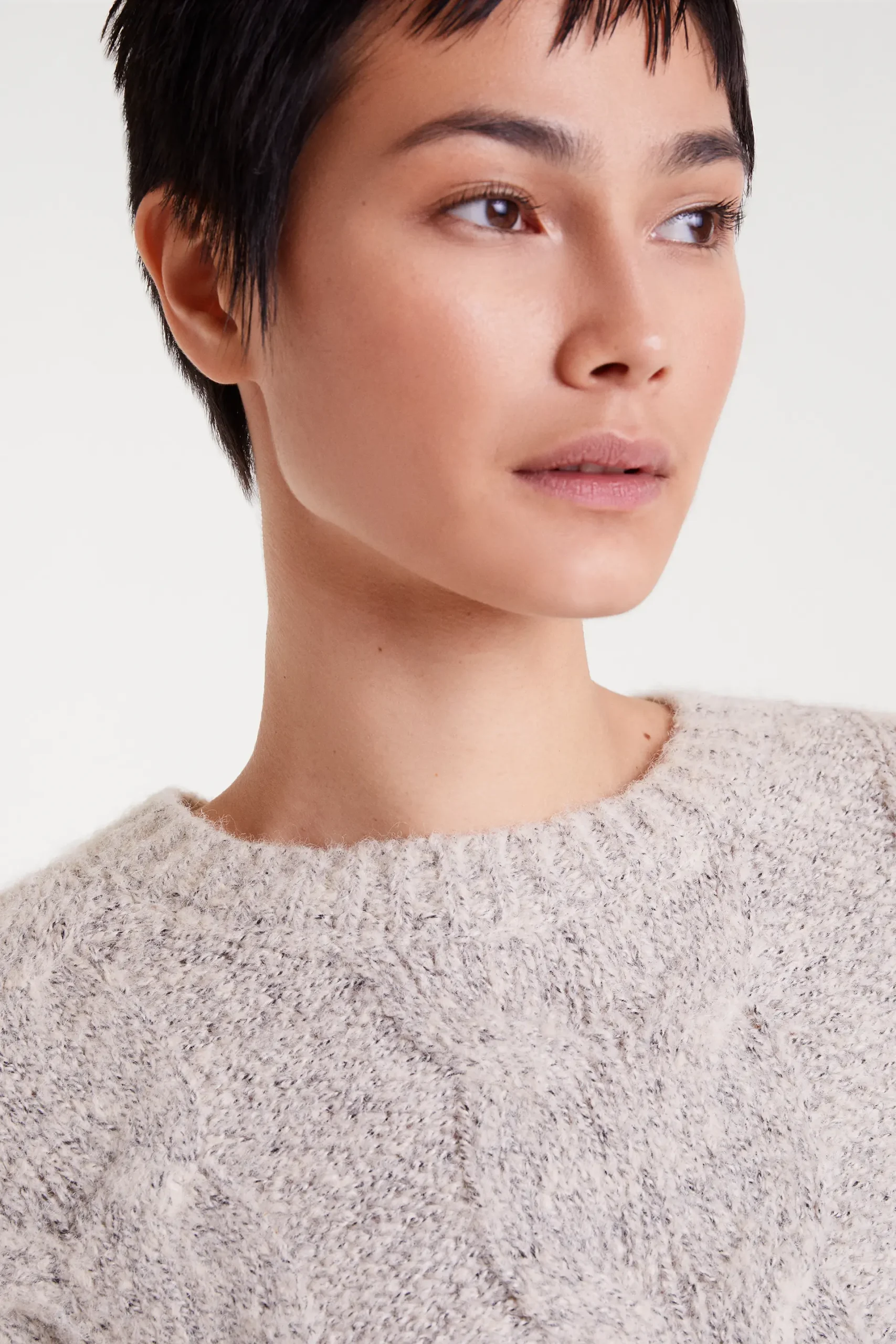 Jersey de punto con detalles encadenados de color blanco. Con cuello redondo y manga larga. Detalles en rib. La modelo mide 177 cm y lleva la talla S.