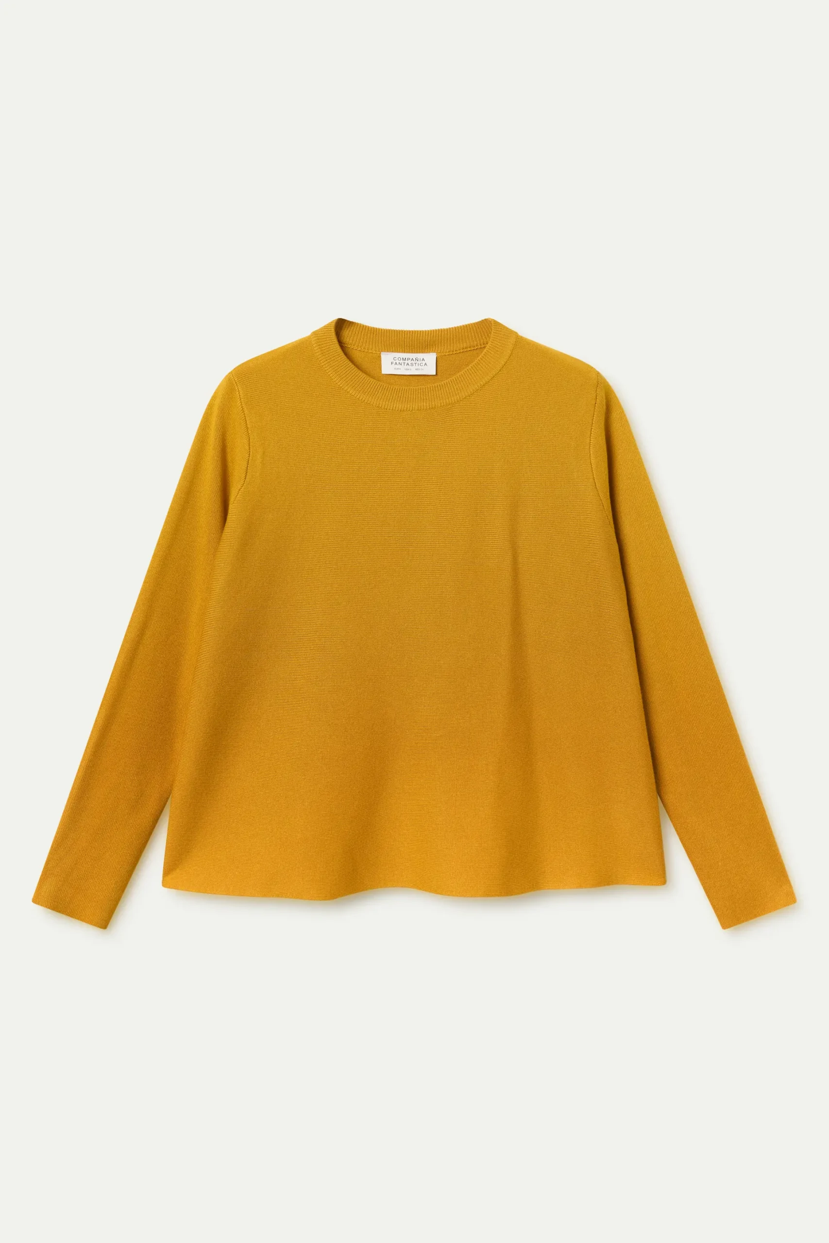 Jersey de punto con corte envasé de color amarillo. Con cuello redondo y manga larga. La modelo mide 177 cm y lleva la talla S.