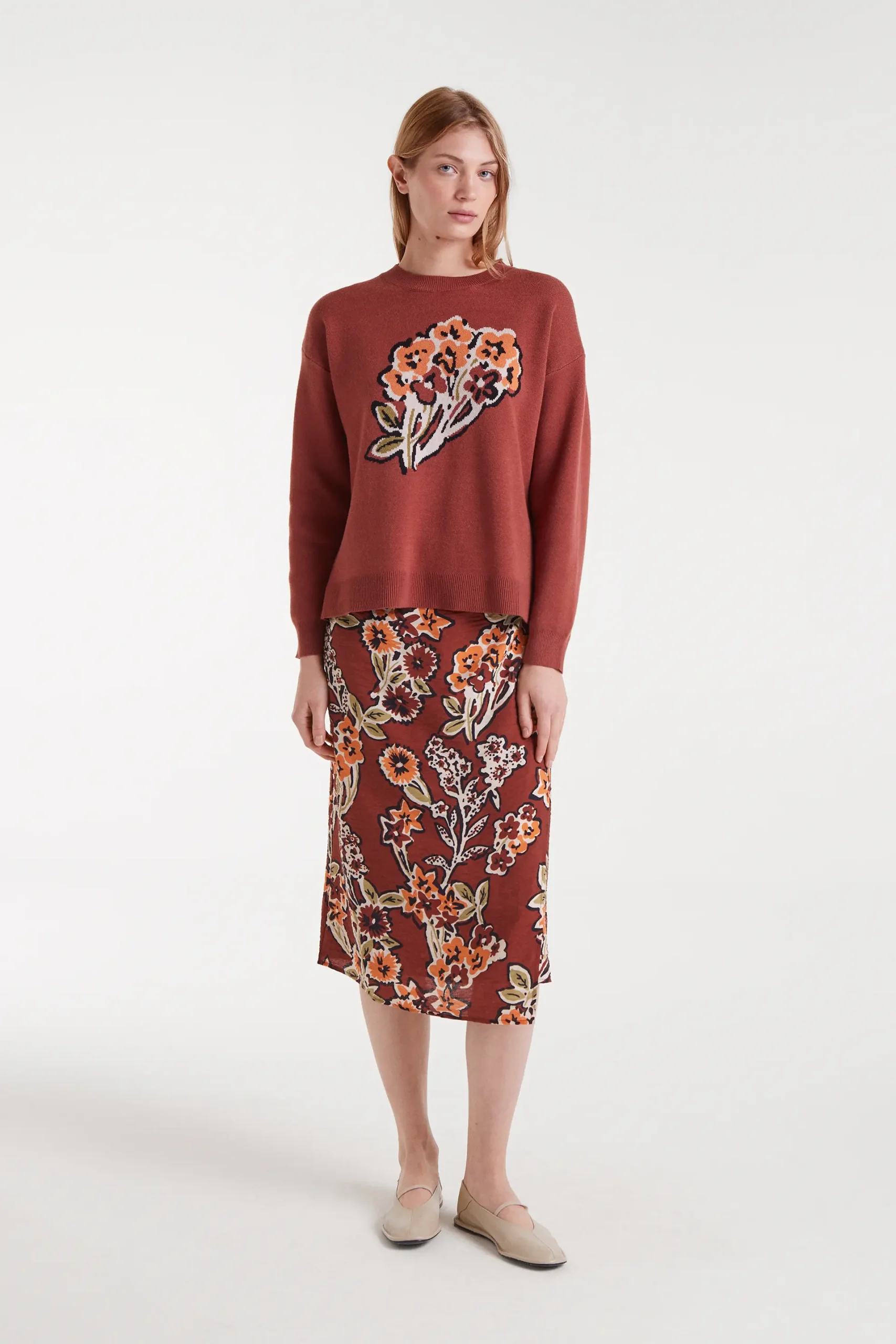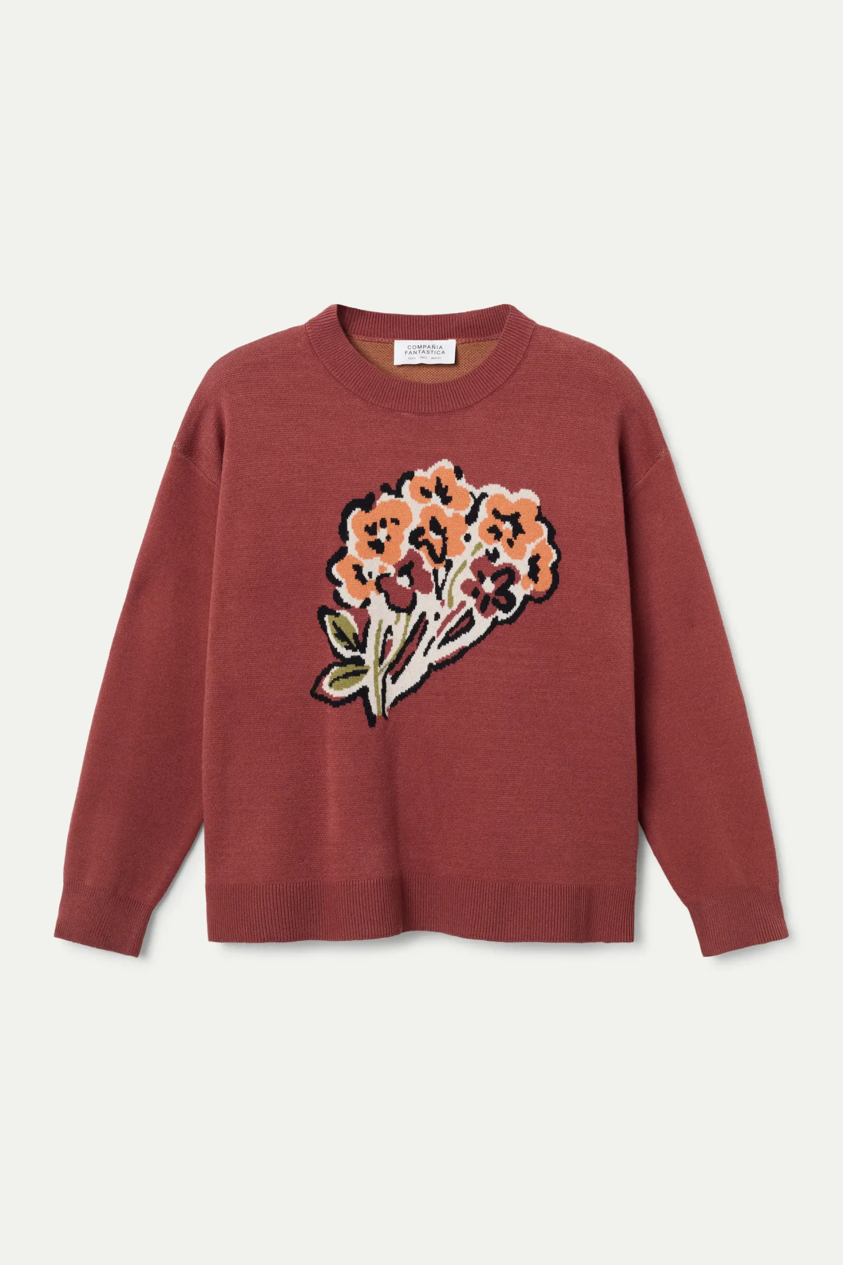 Jersey de punto jacquard de color marrón con estampado bouquet. Cuello redondo y manga larga con hombro ligeramente caído. Detalles con acabados en rib. La modelo mide 179 cm y lleva la talla S.