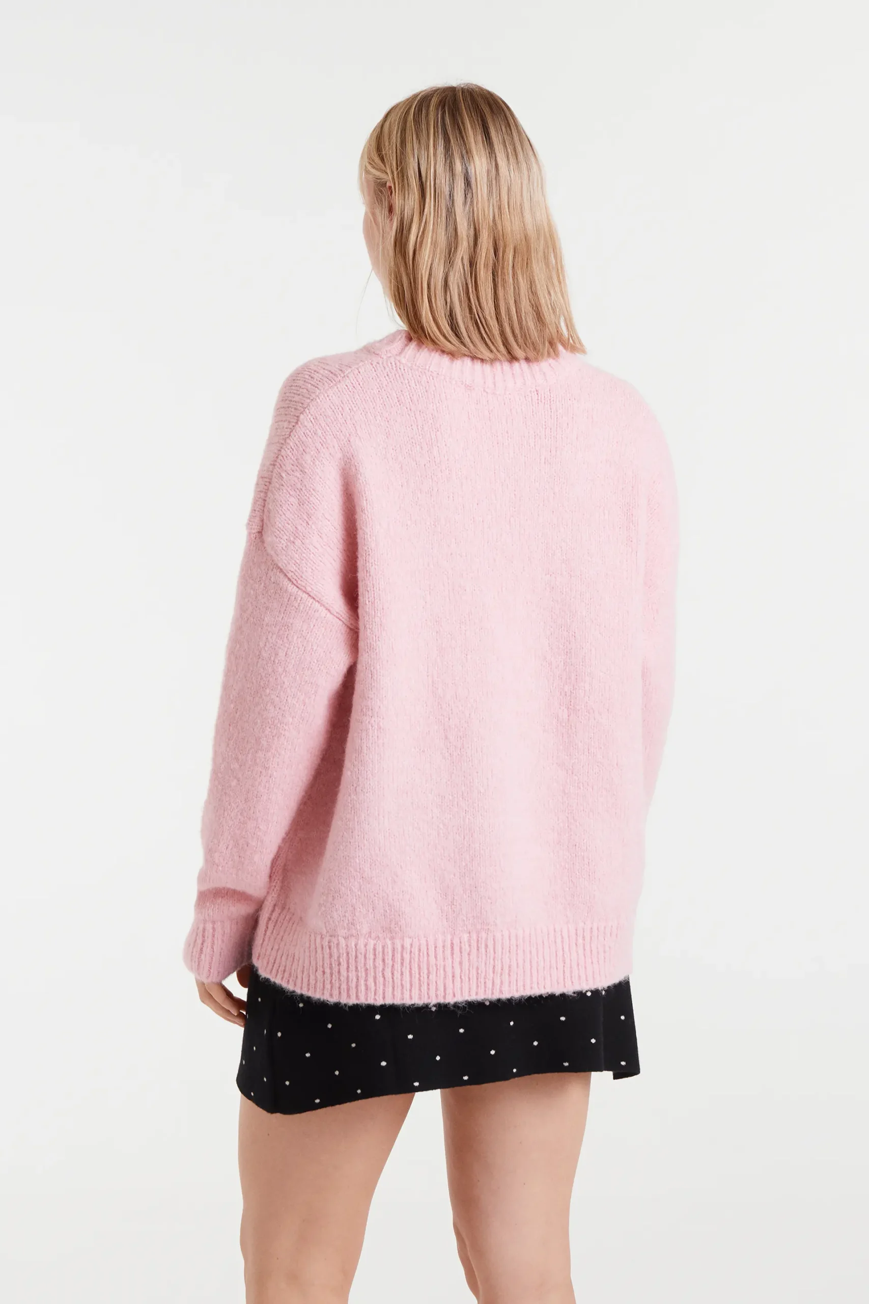 Jersey de punto jacquard de color rosa con estampado Strawberry. Cuello redondo y manga larga con hombro ligeramente caído. Detalles con acabados en rib. La modelo mide 174 cm y lleva la talla S.
