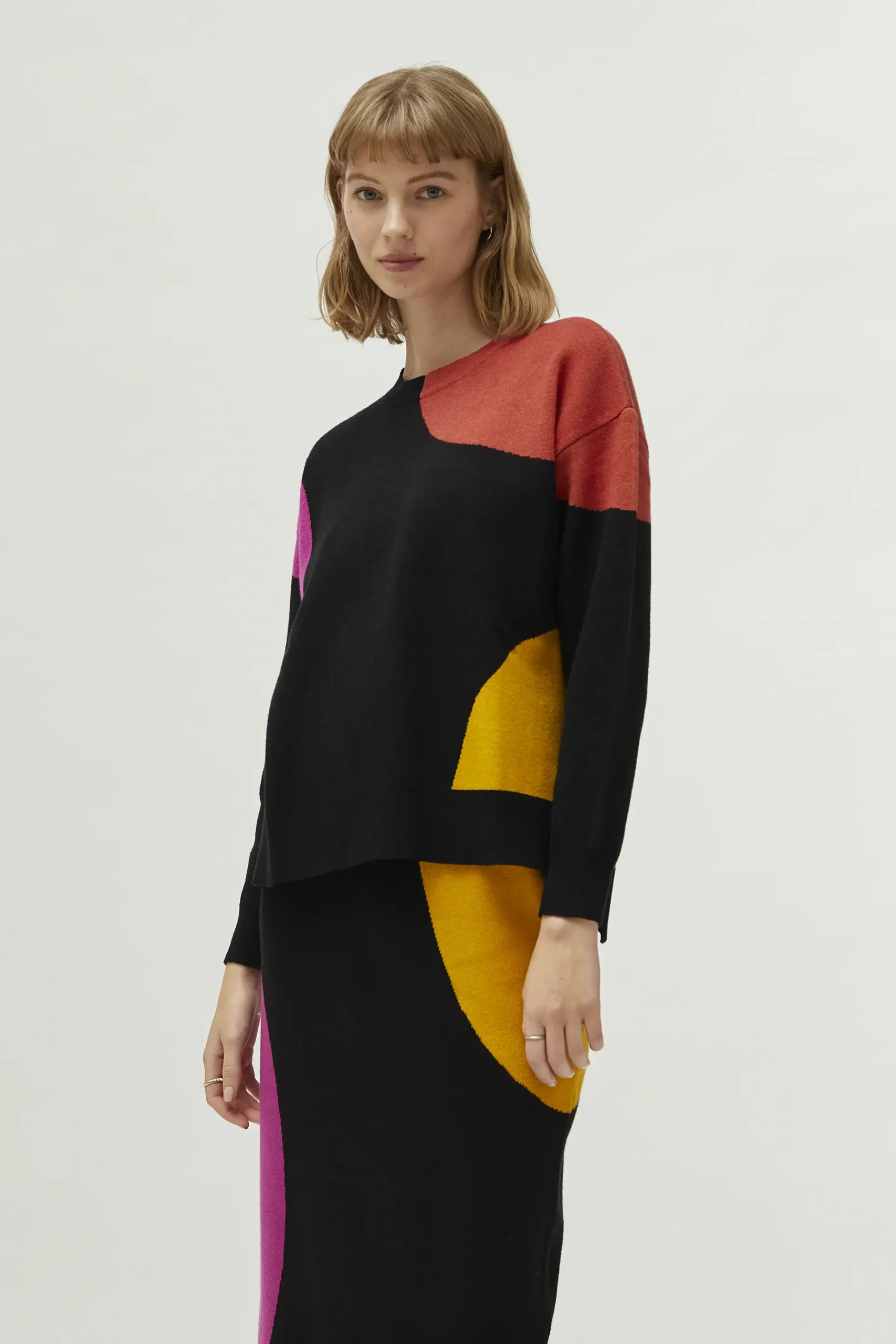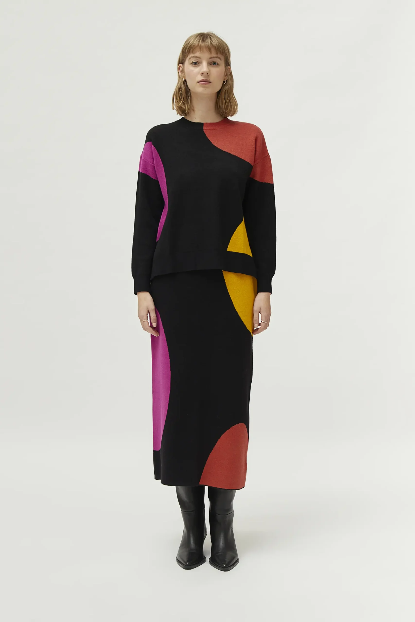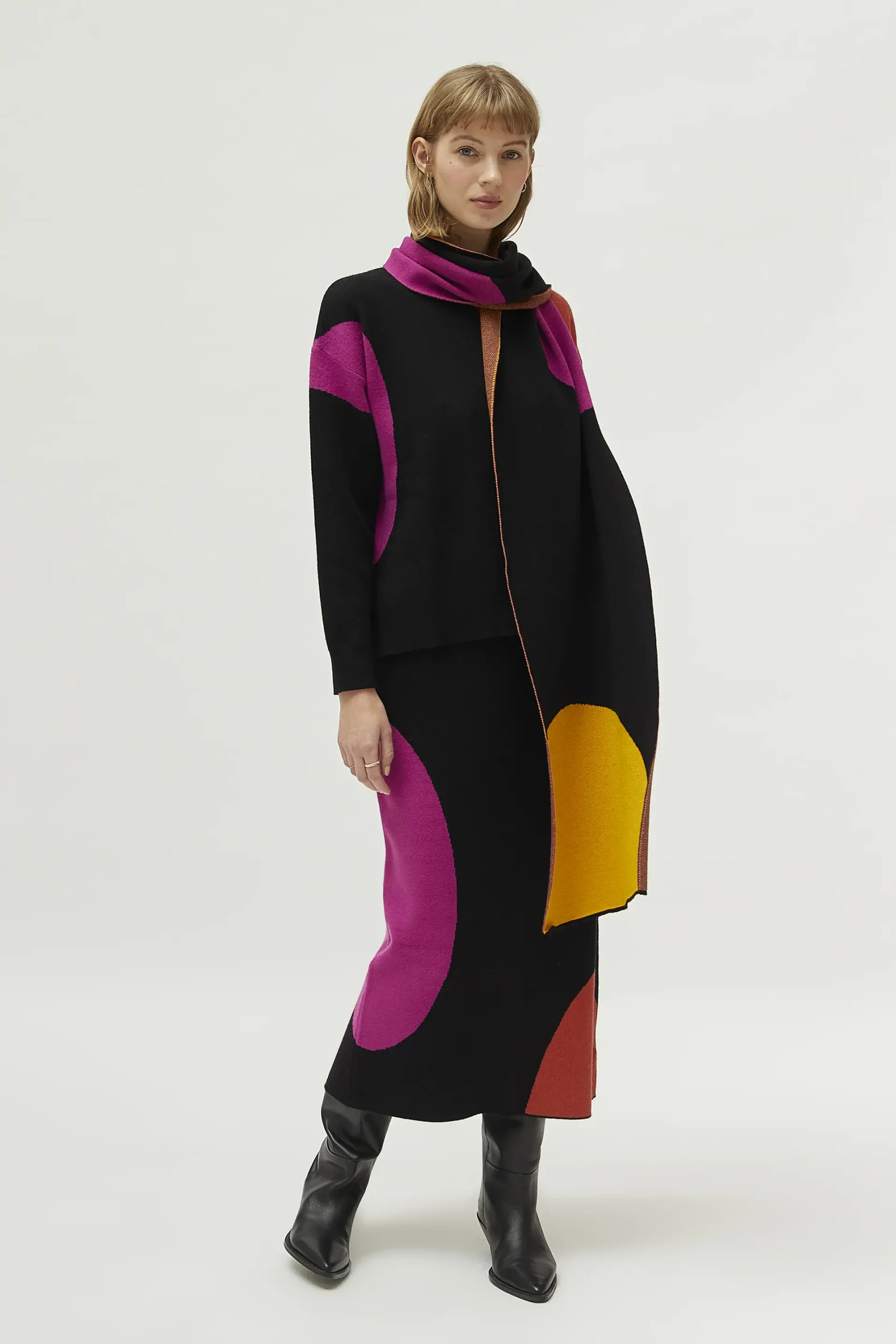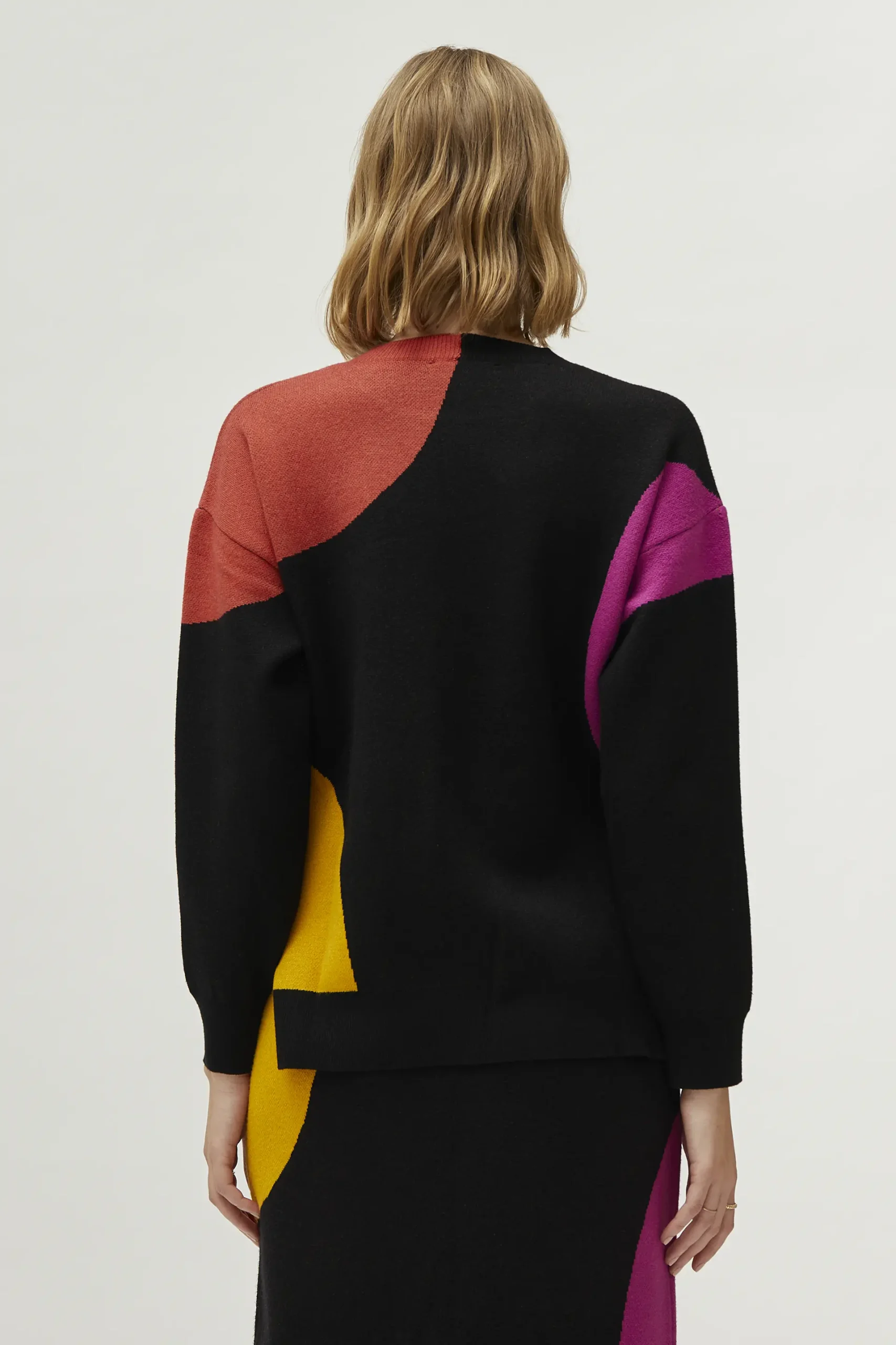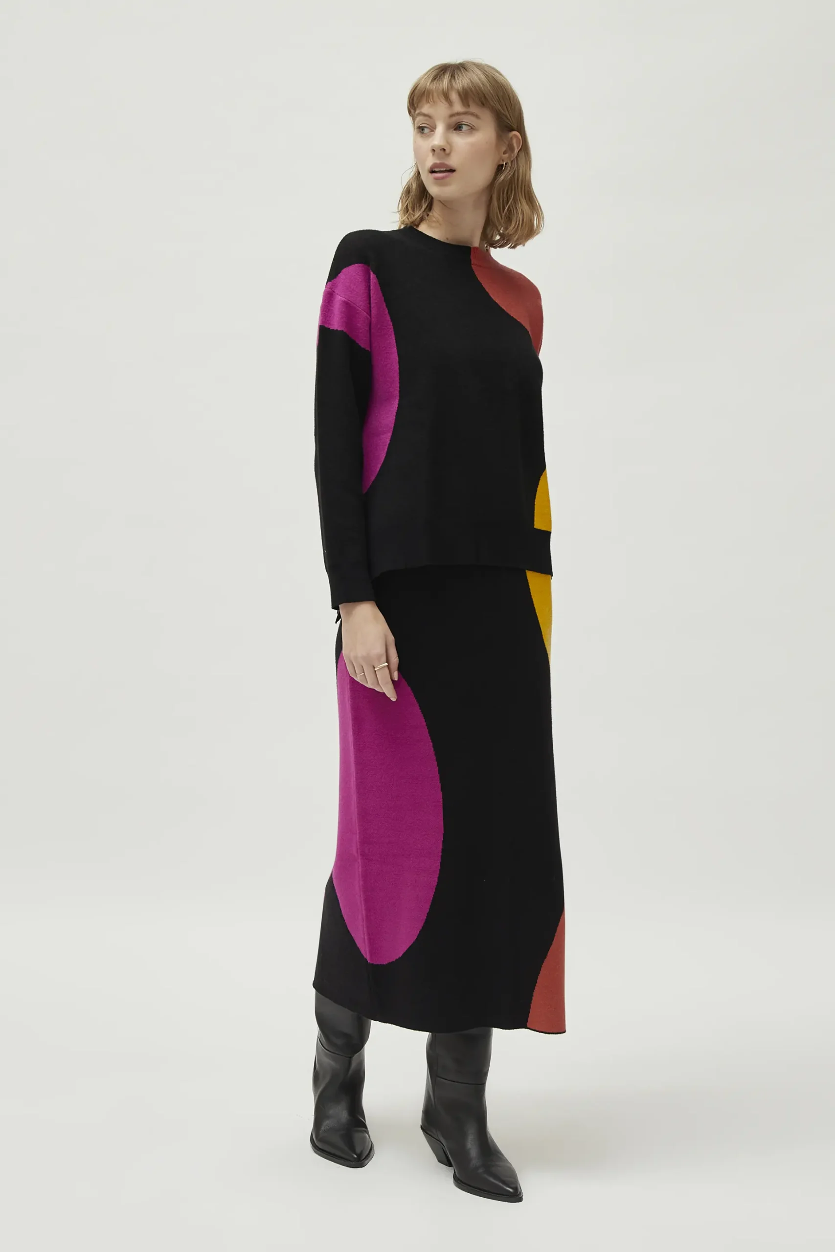 Jersey de punto jacquard de color negro con estampado de círculos multicolor. Con cuello redondo y manga larga. La modelo mide 177 cm y lleva la talla S.