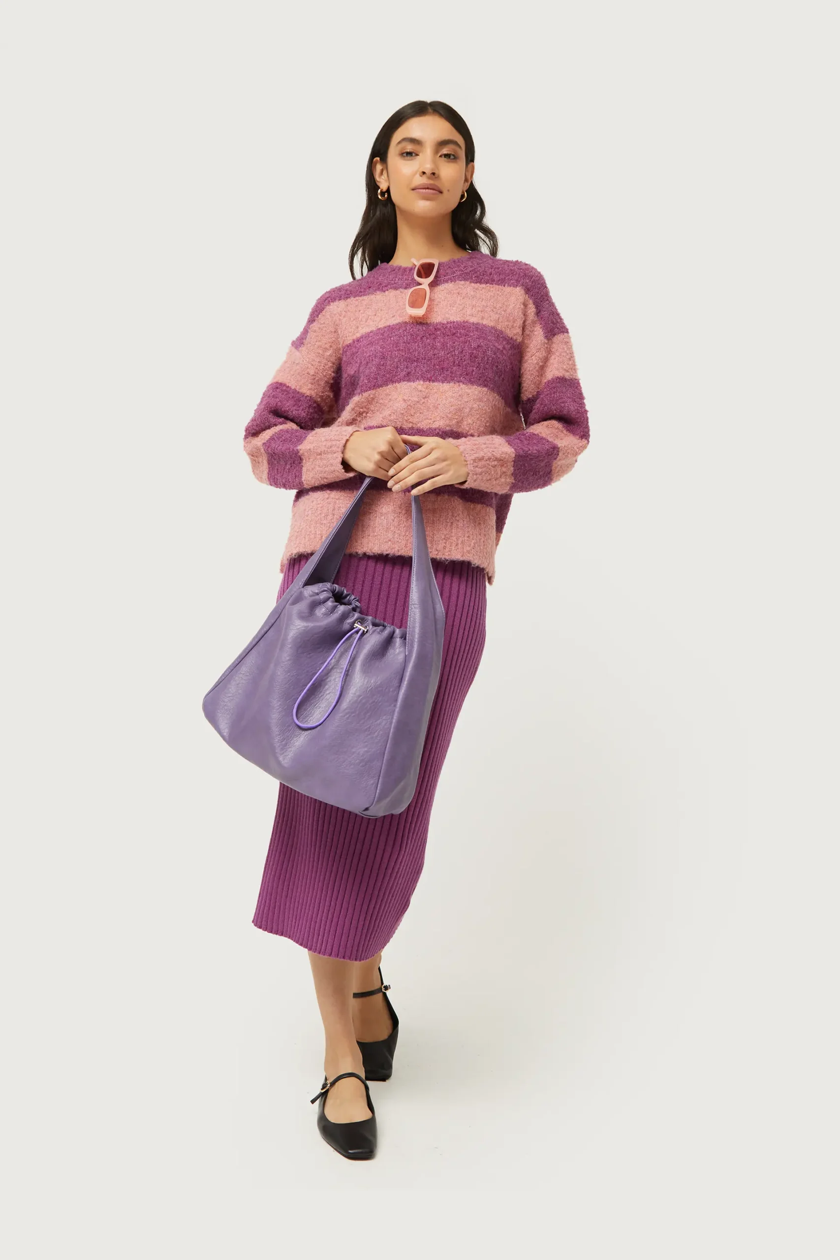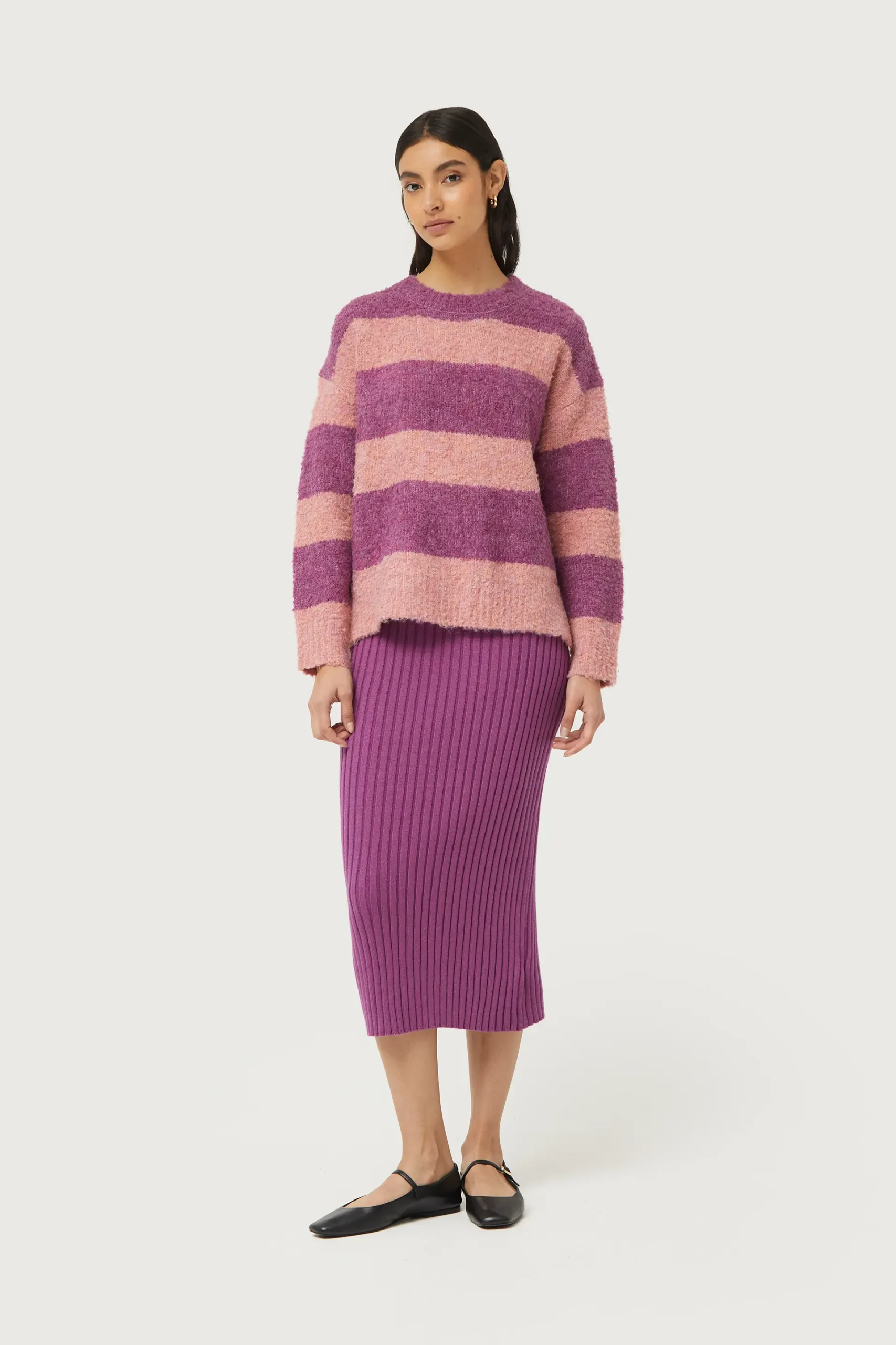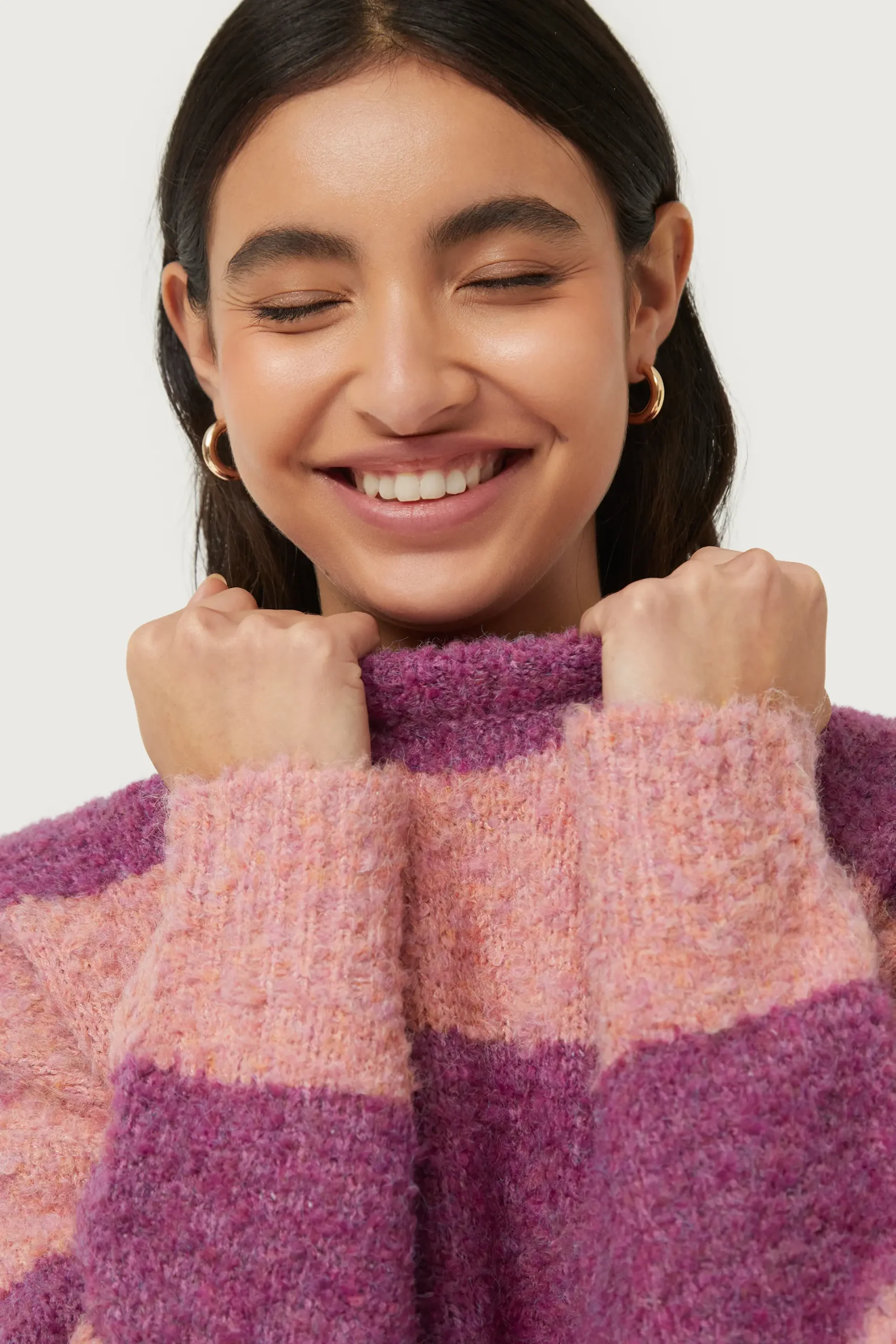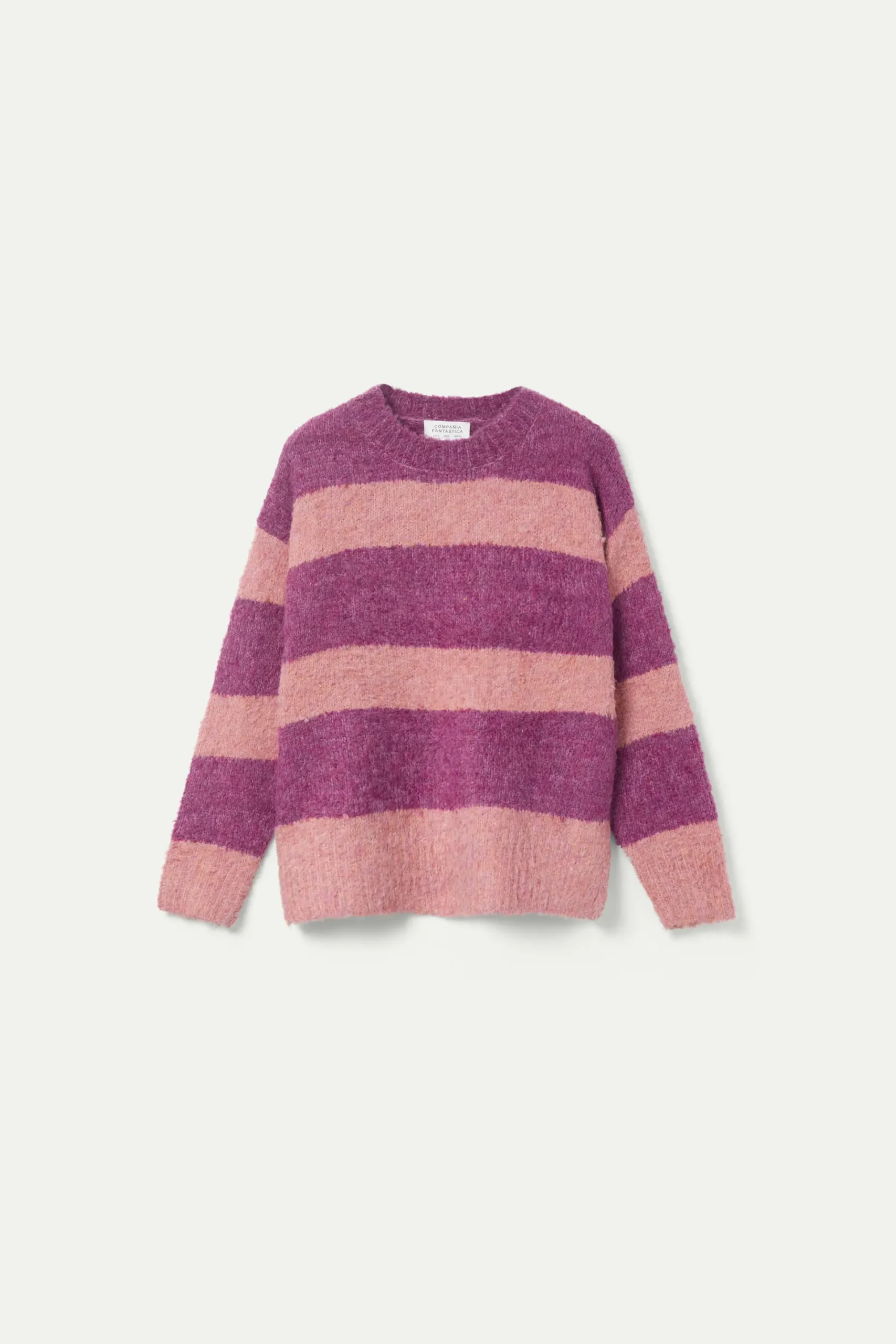 Jersey de punto mullido de rayas moradas y rosas. Con cuello redondo y manga larga. Detalle de aberturas laterales. La modelo mide 176 cm y lleva la talla S.