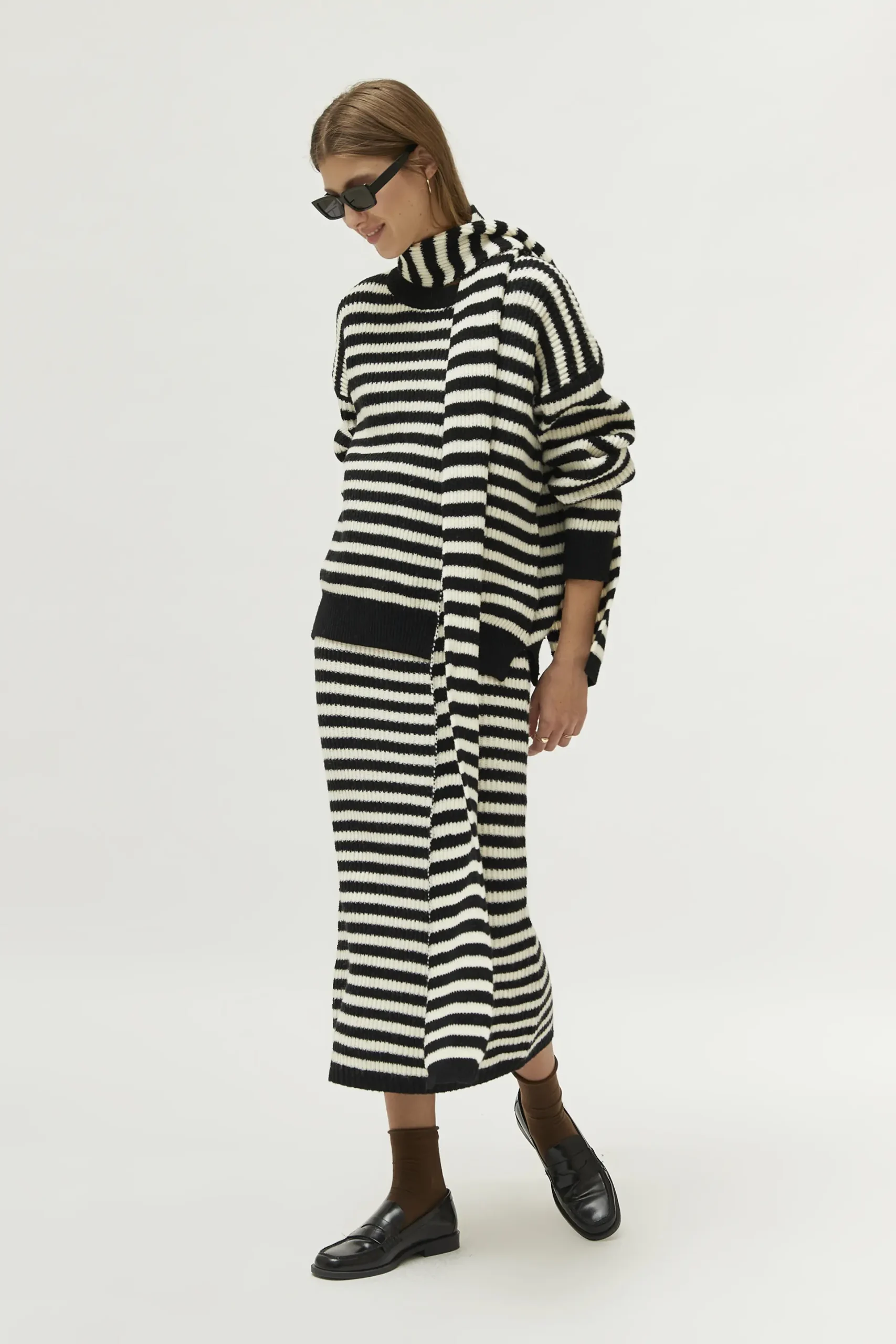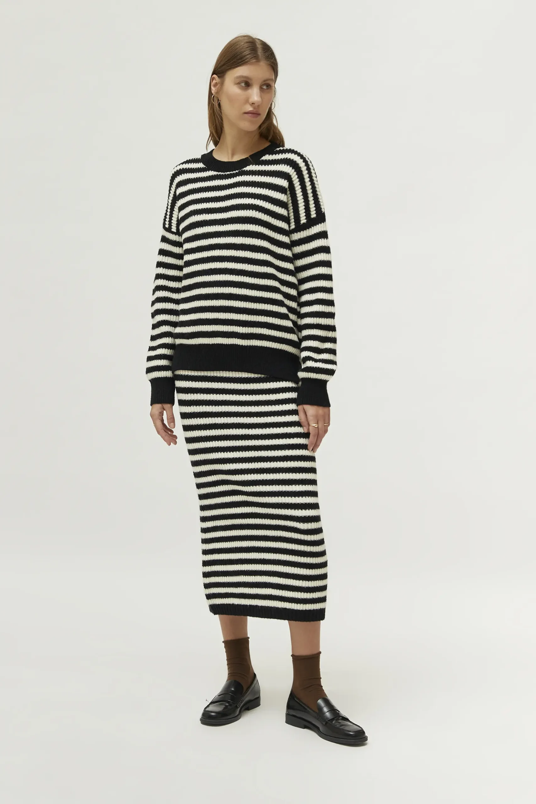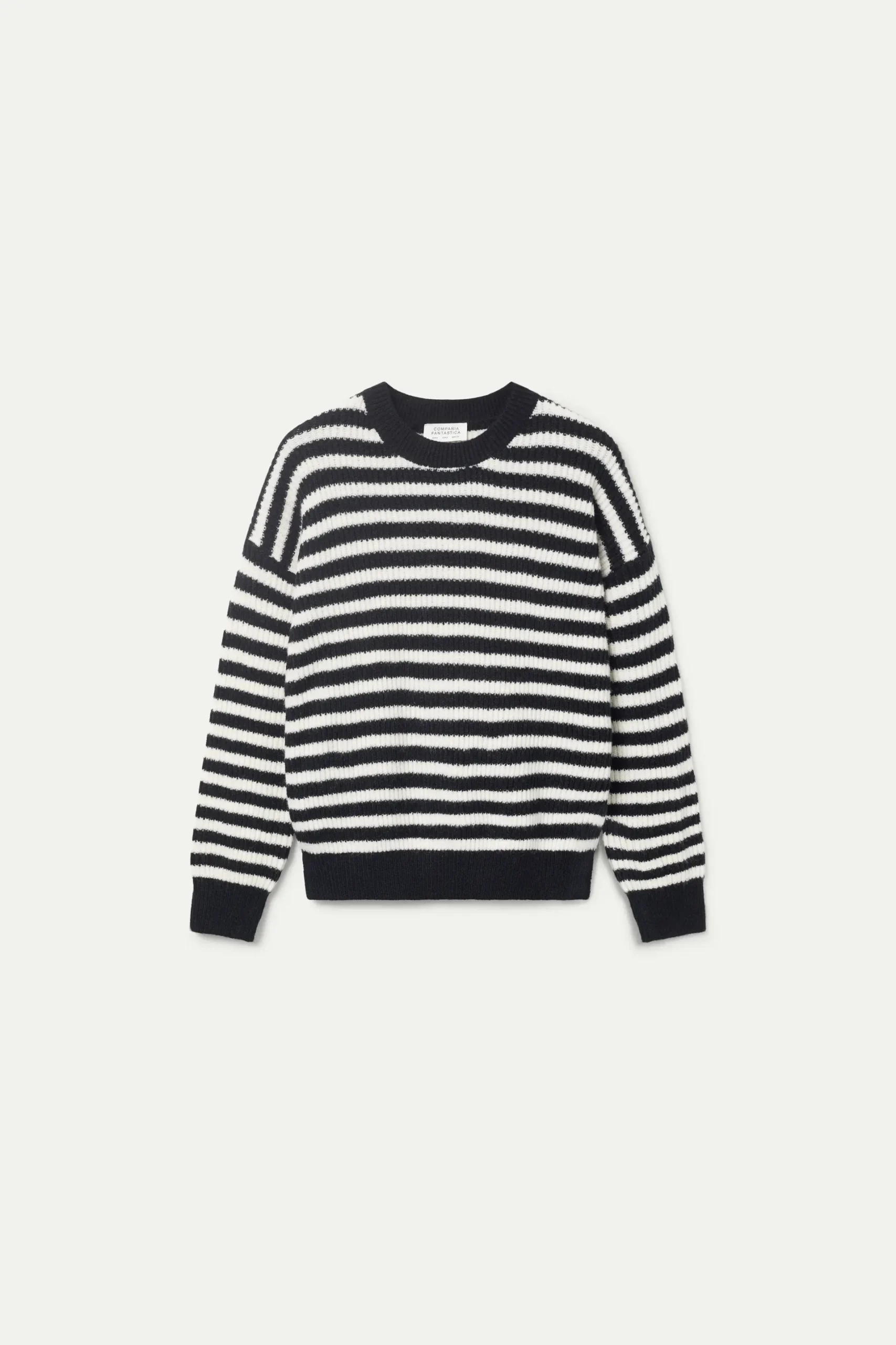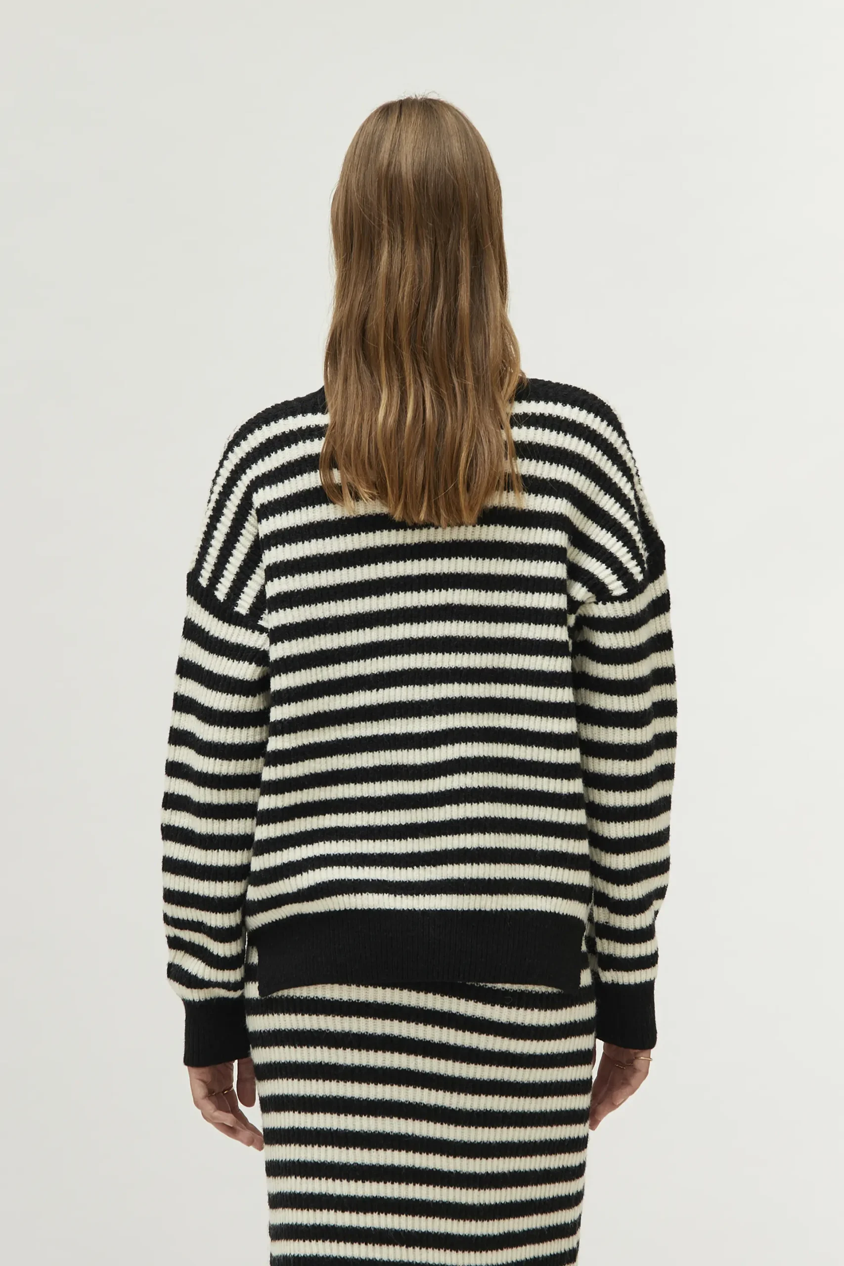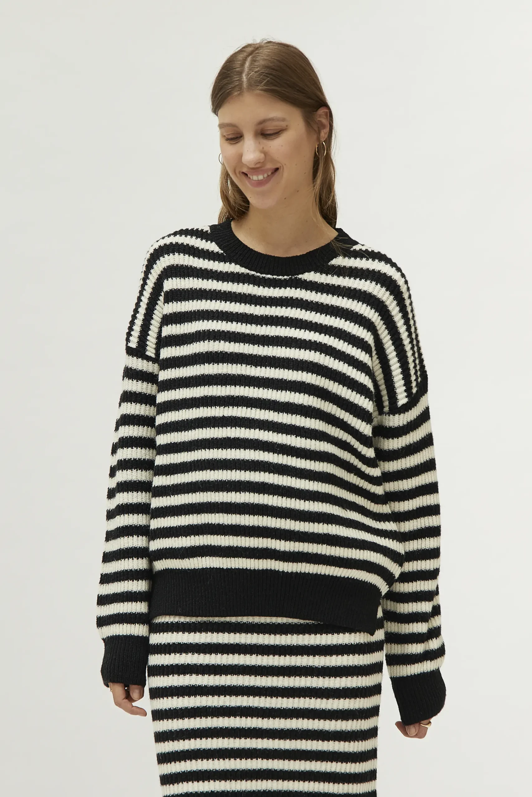 Jersey de punto con estampado de rayas negras y blancas. Con cuello redondo y manga larga. La modelo mide 177 cm y lleva la talla S.