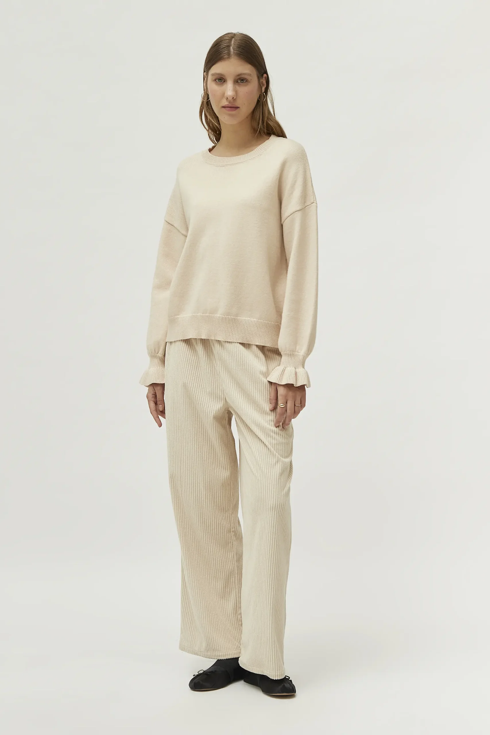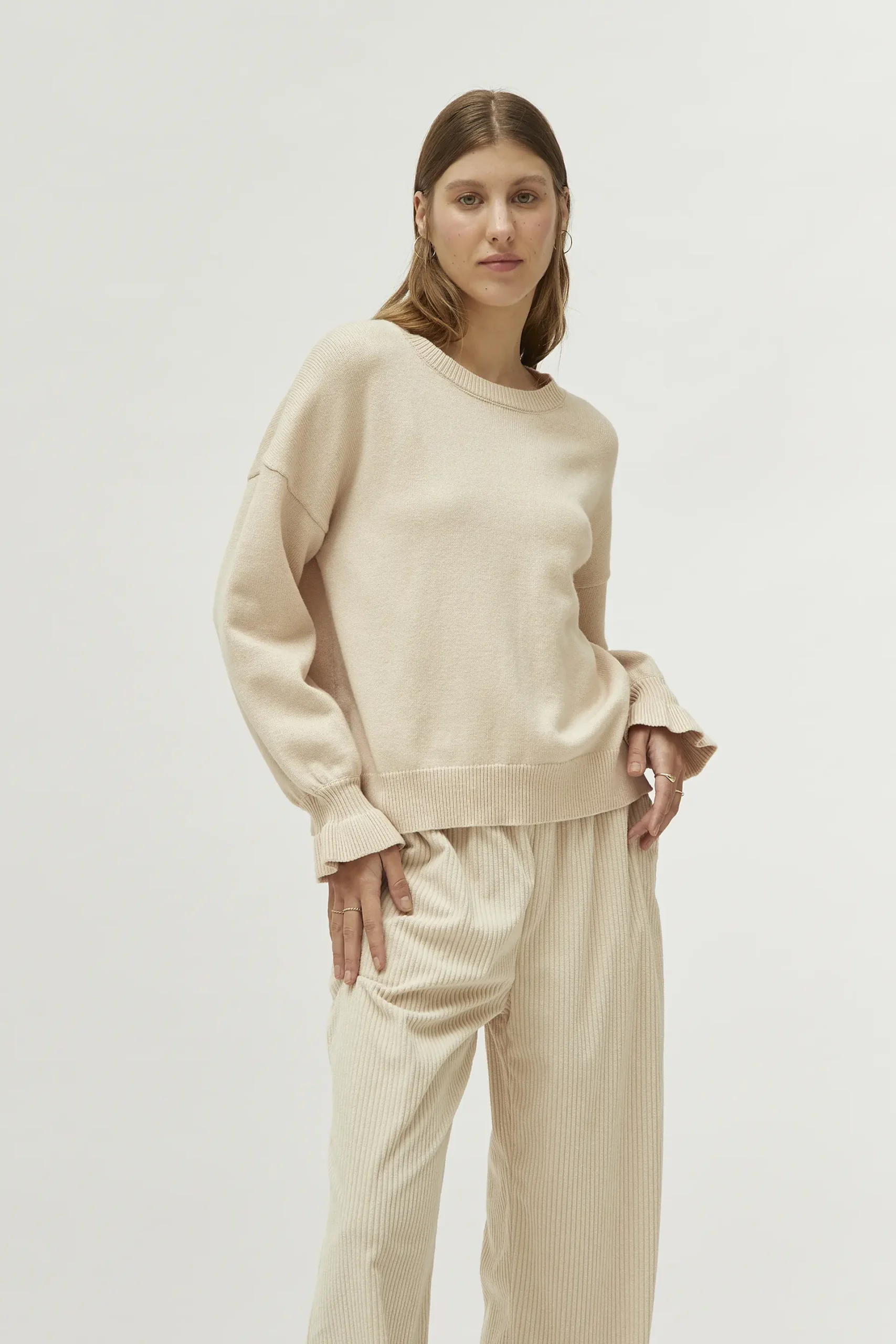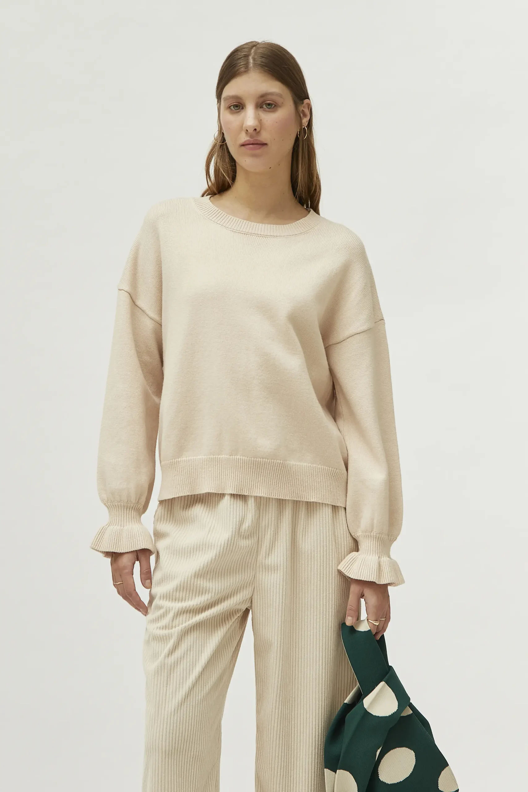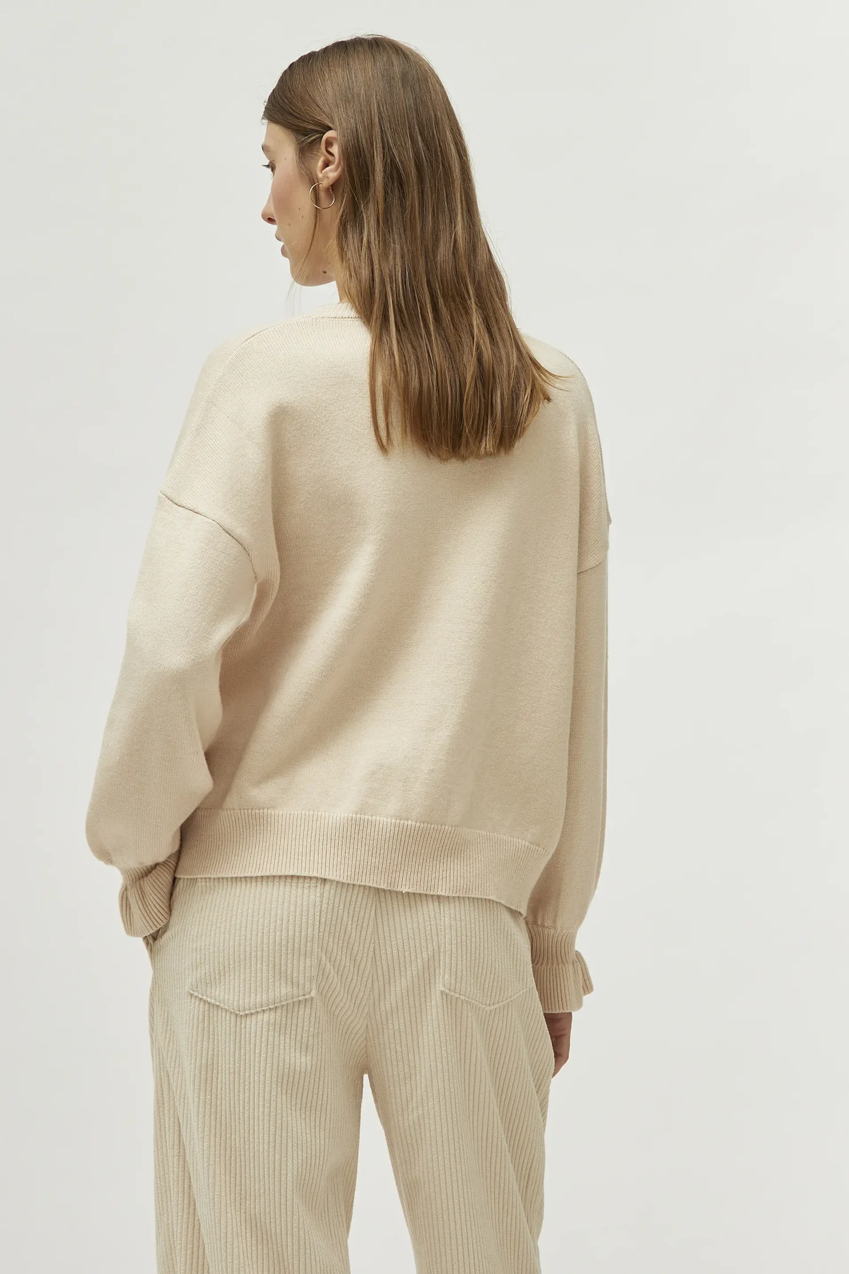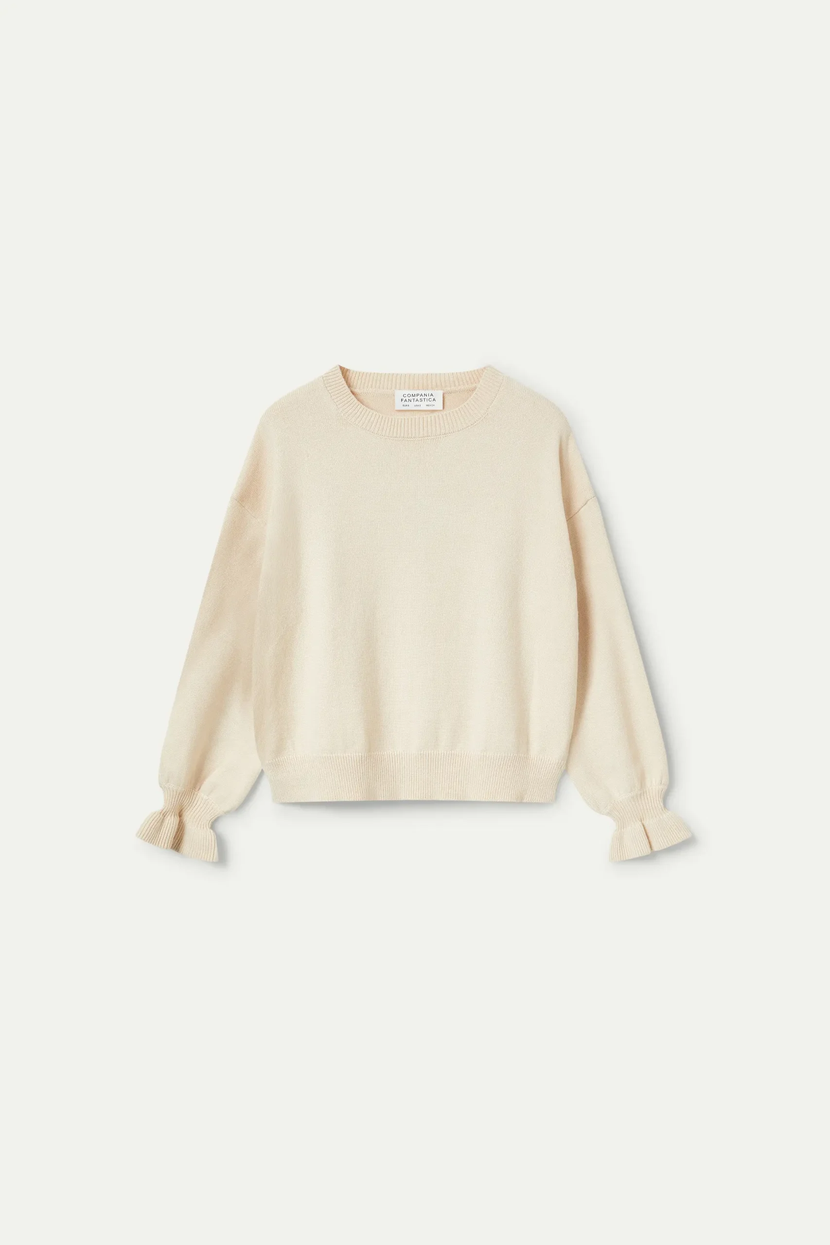 Jersey de punto de color blanco roto. Con cuello redondo y manga larga. Detalle de puños con volante. La modelo mide 177 cm y lleva la talla S.