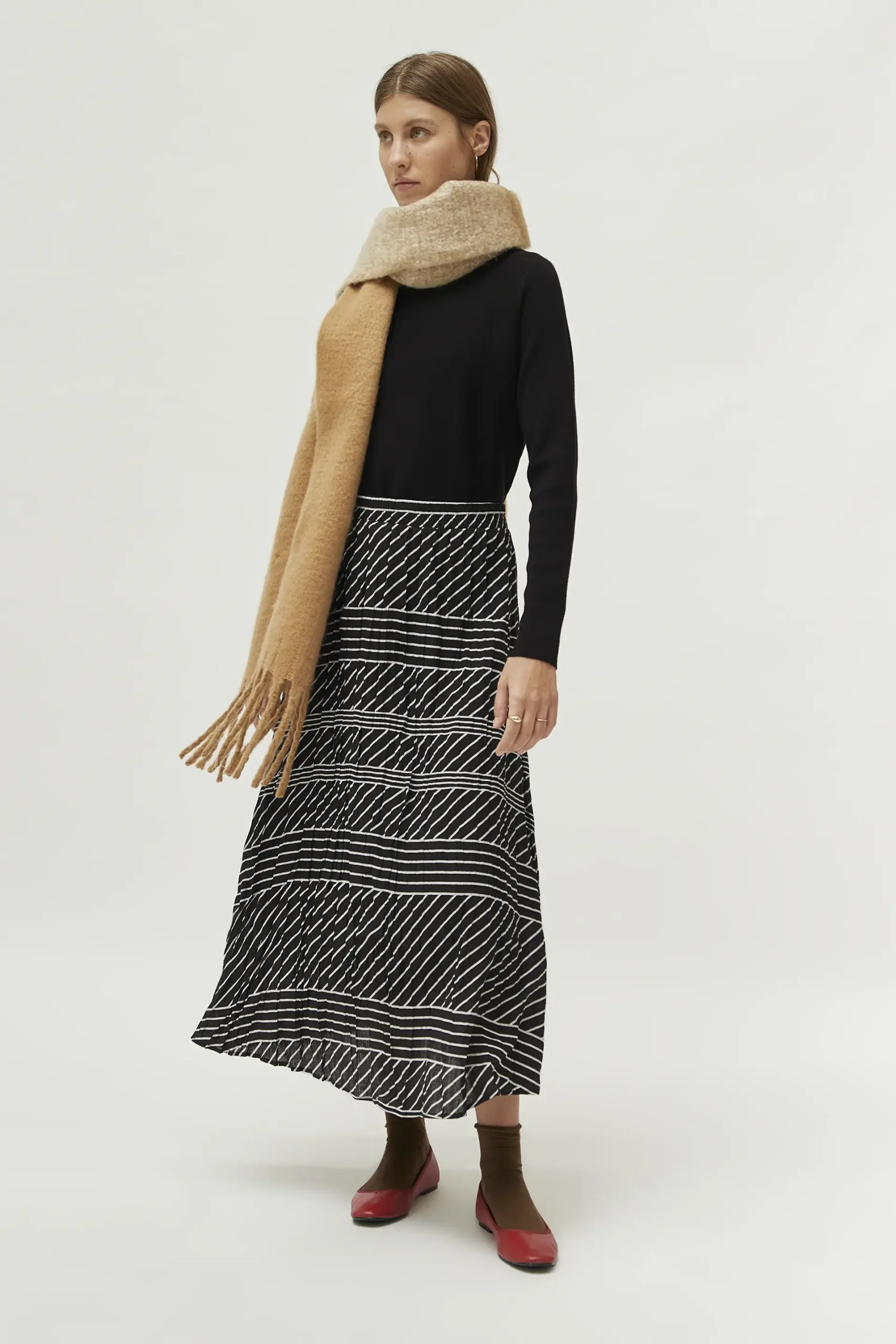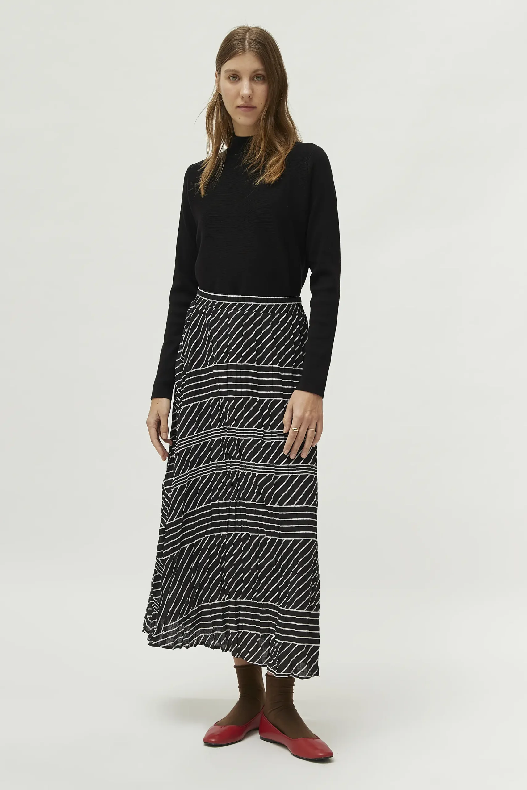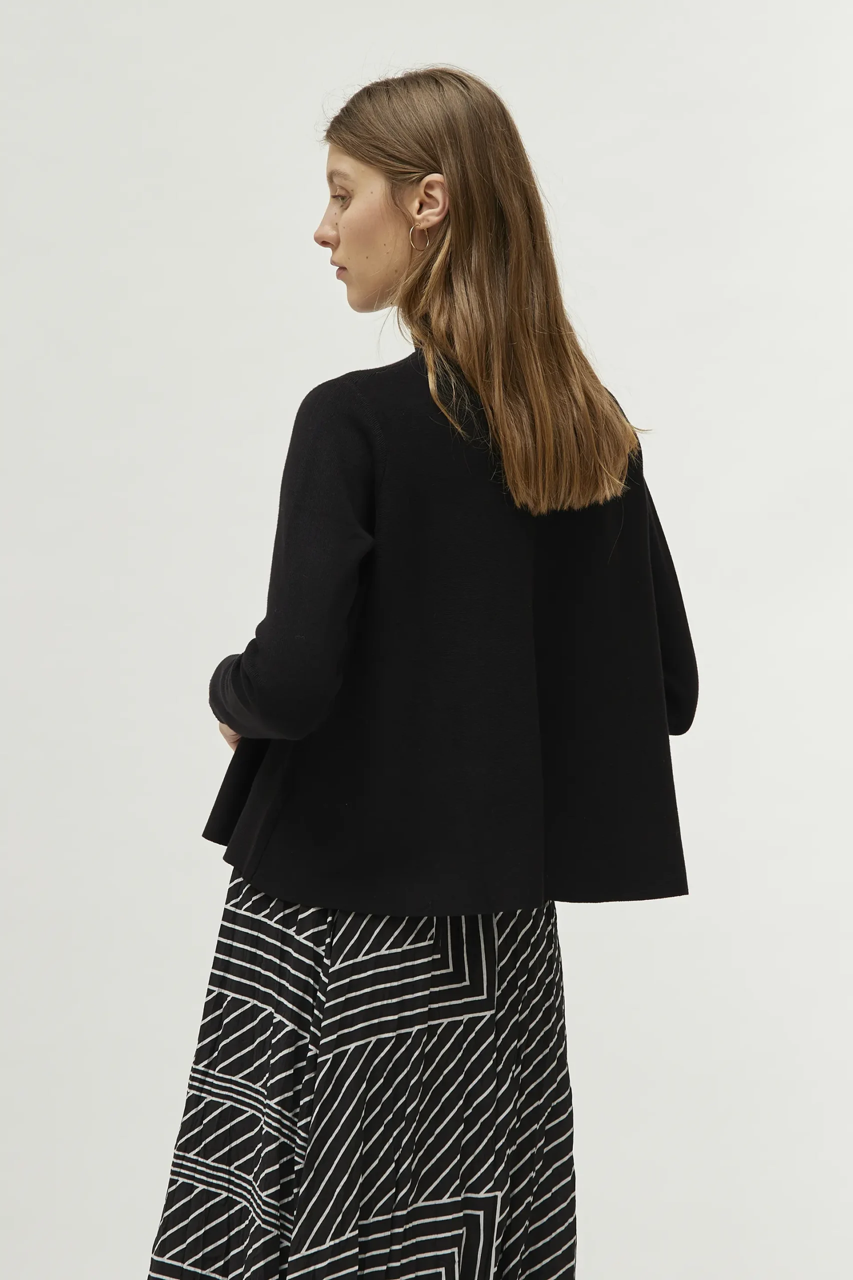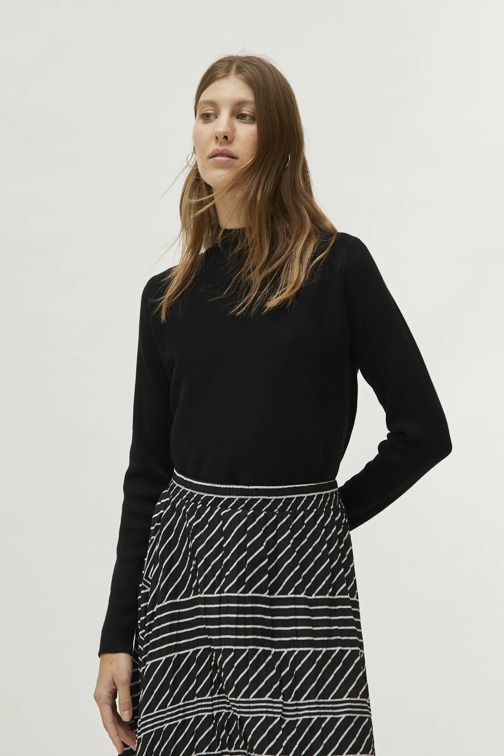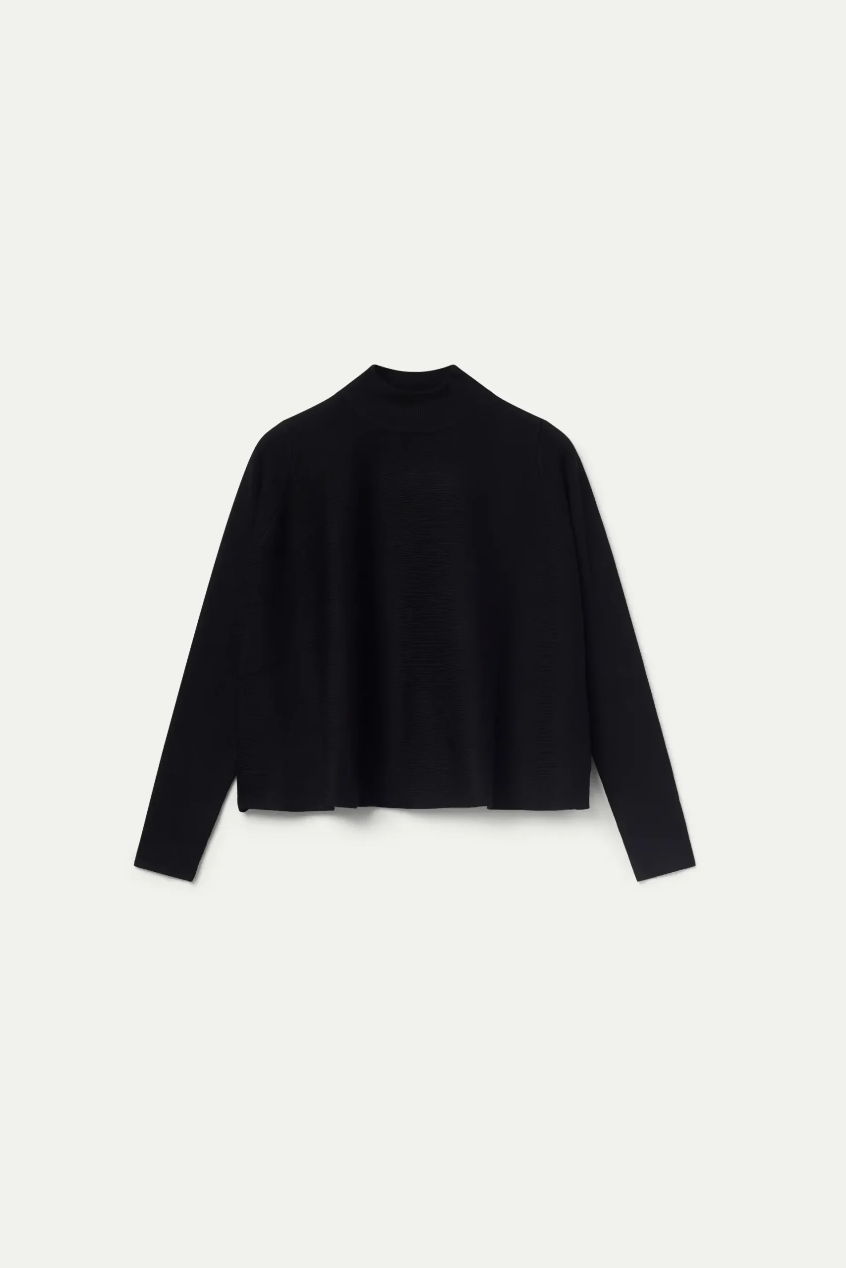 Jersey de punto de color negro. Con cuello mock y manga larga. Modelo de corte evasé. La modelo mide 177 cm y lleva la talla S.