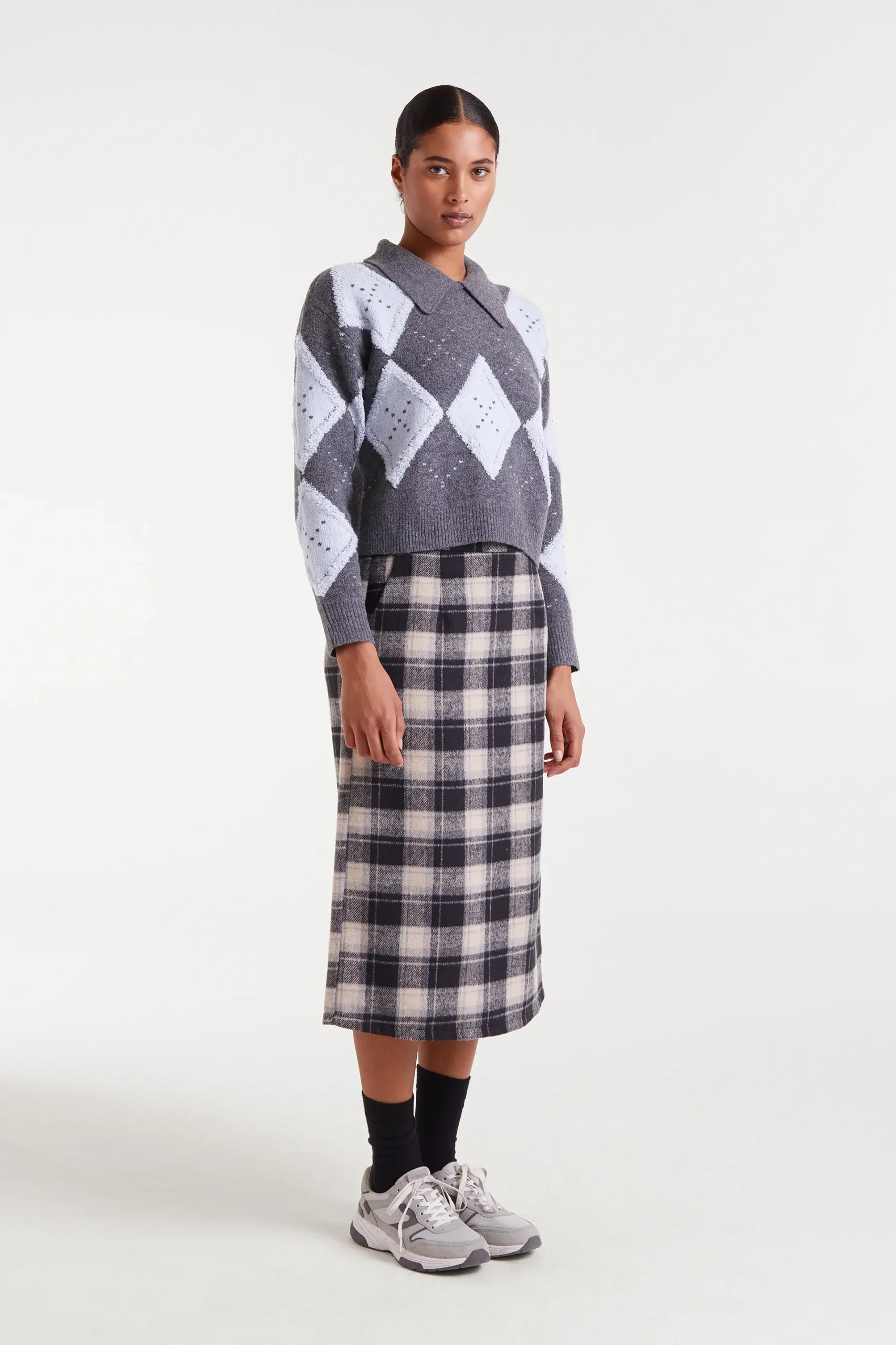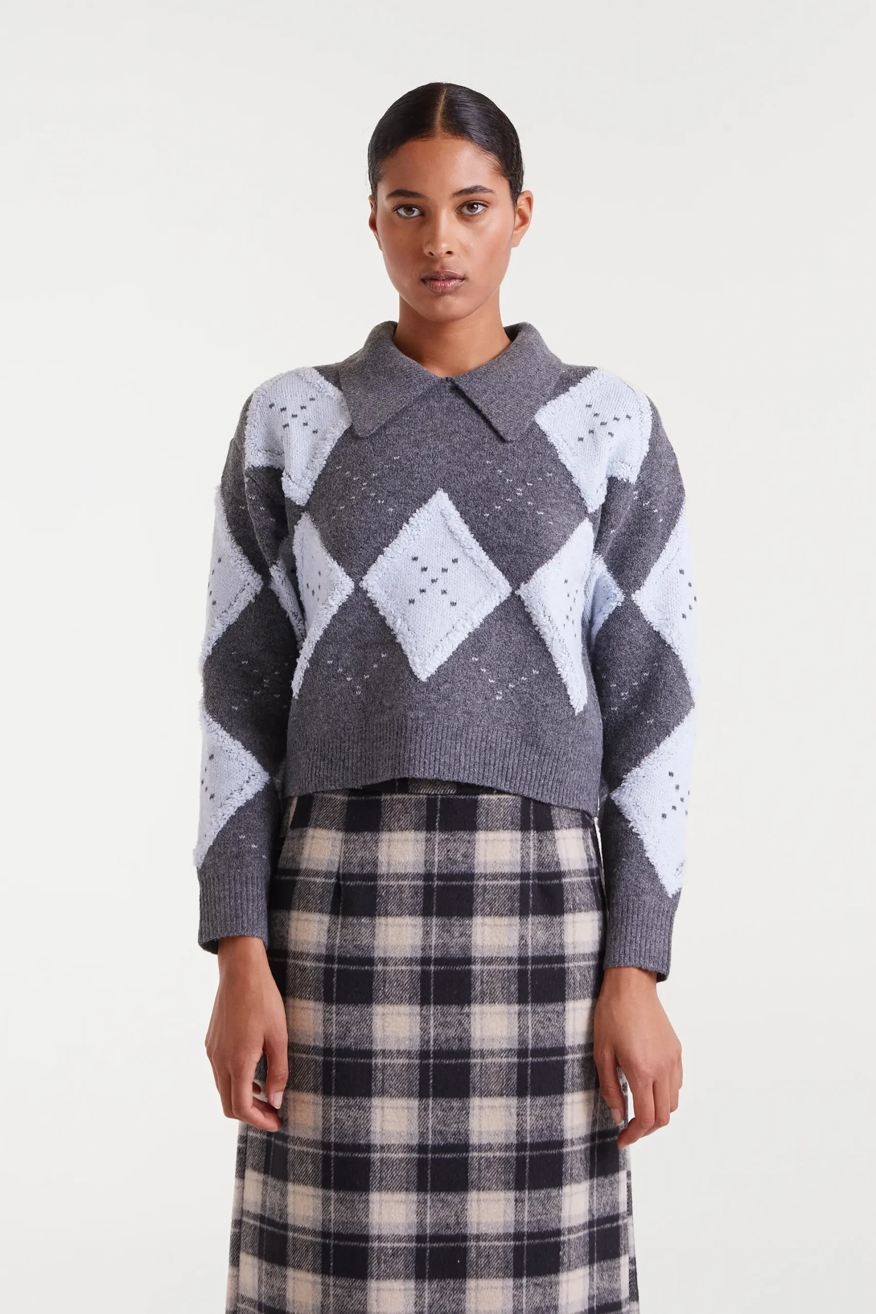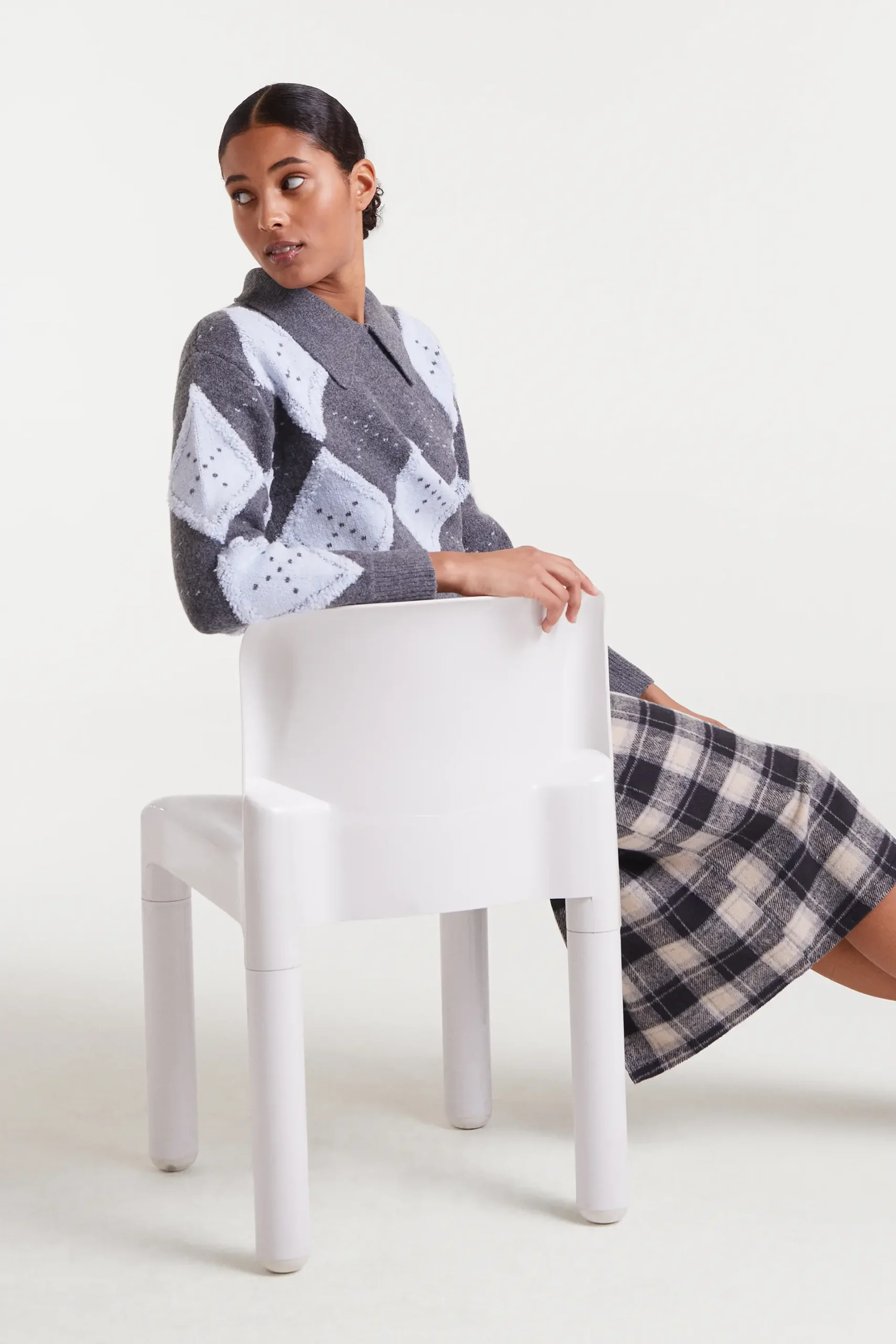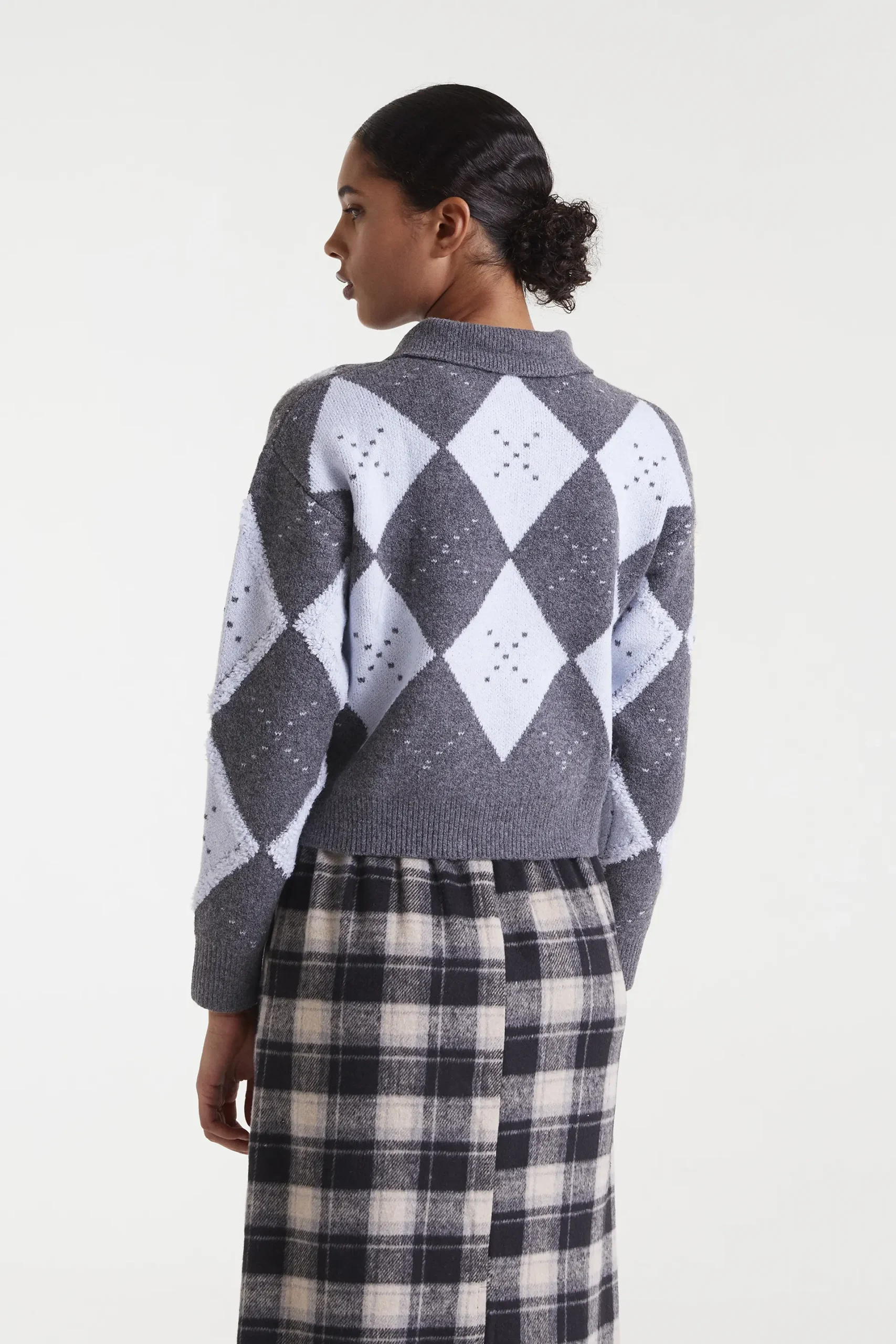 Jersey con tejido jacquard de color gris y azul. Con cuello solapa y manga larga. Hombro ligeramente caído. Detalles bordados en rombo y acabados en rib. La modelo mide 175 cm y lleva la talla S.