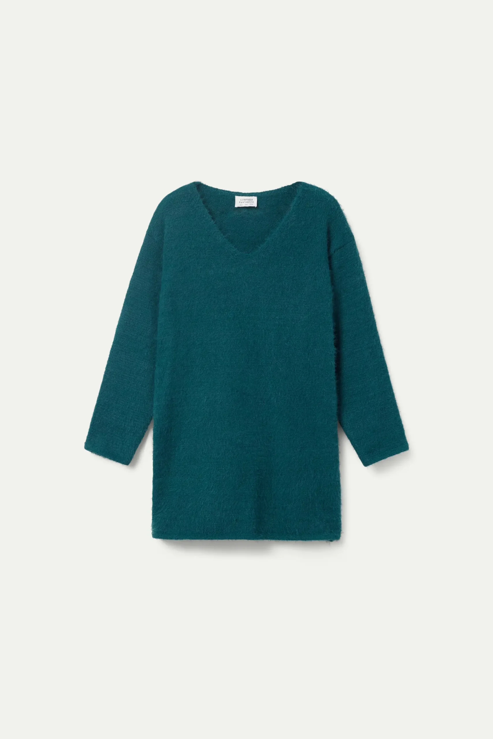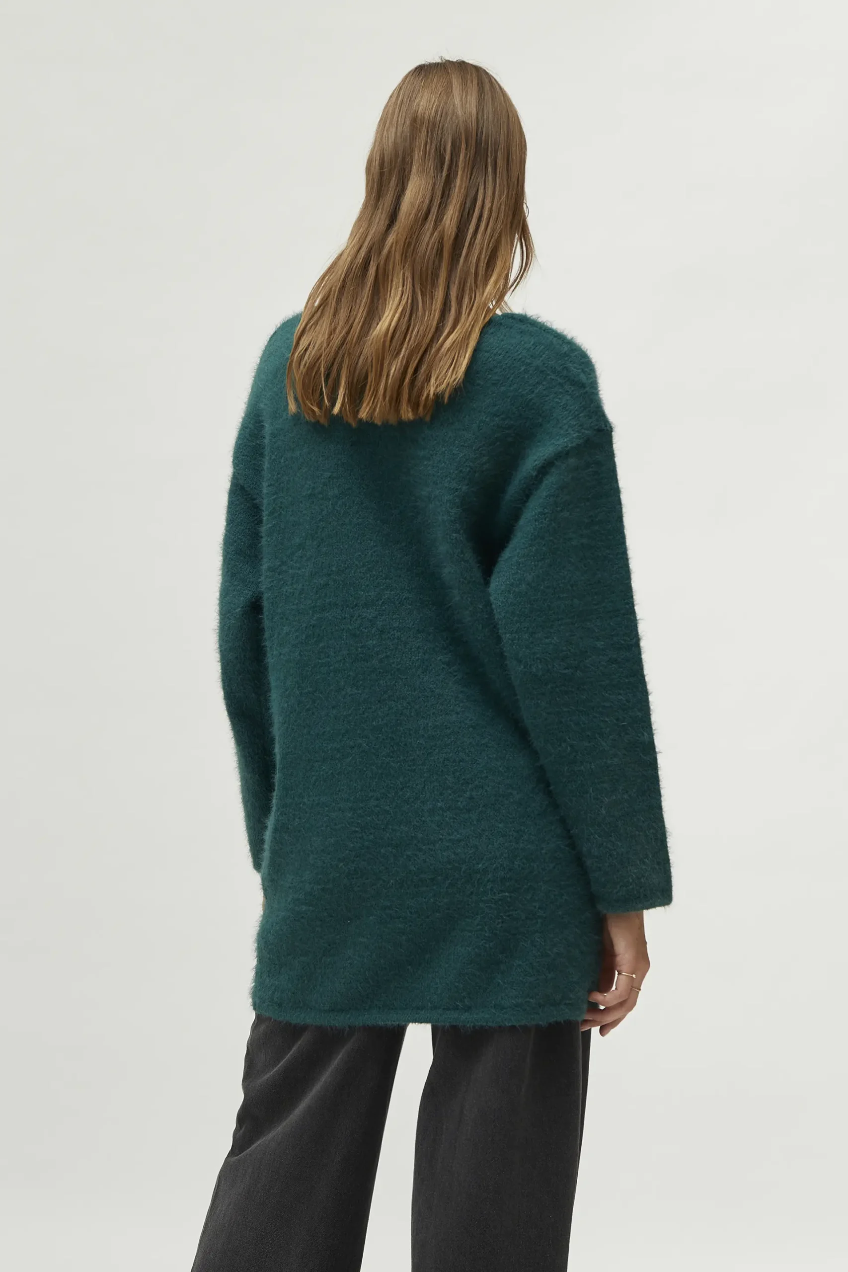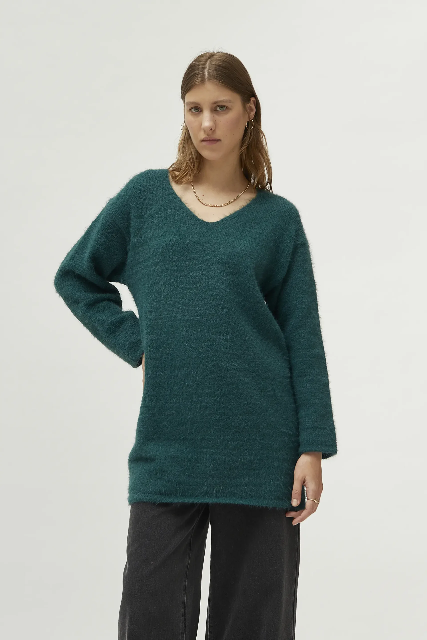 Jersey largo de punto con textura de color verde. Con cuello pico y manga larga. La modelo mide 177 cm y lleva la talla S.