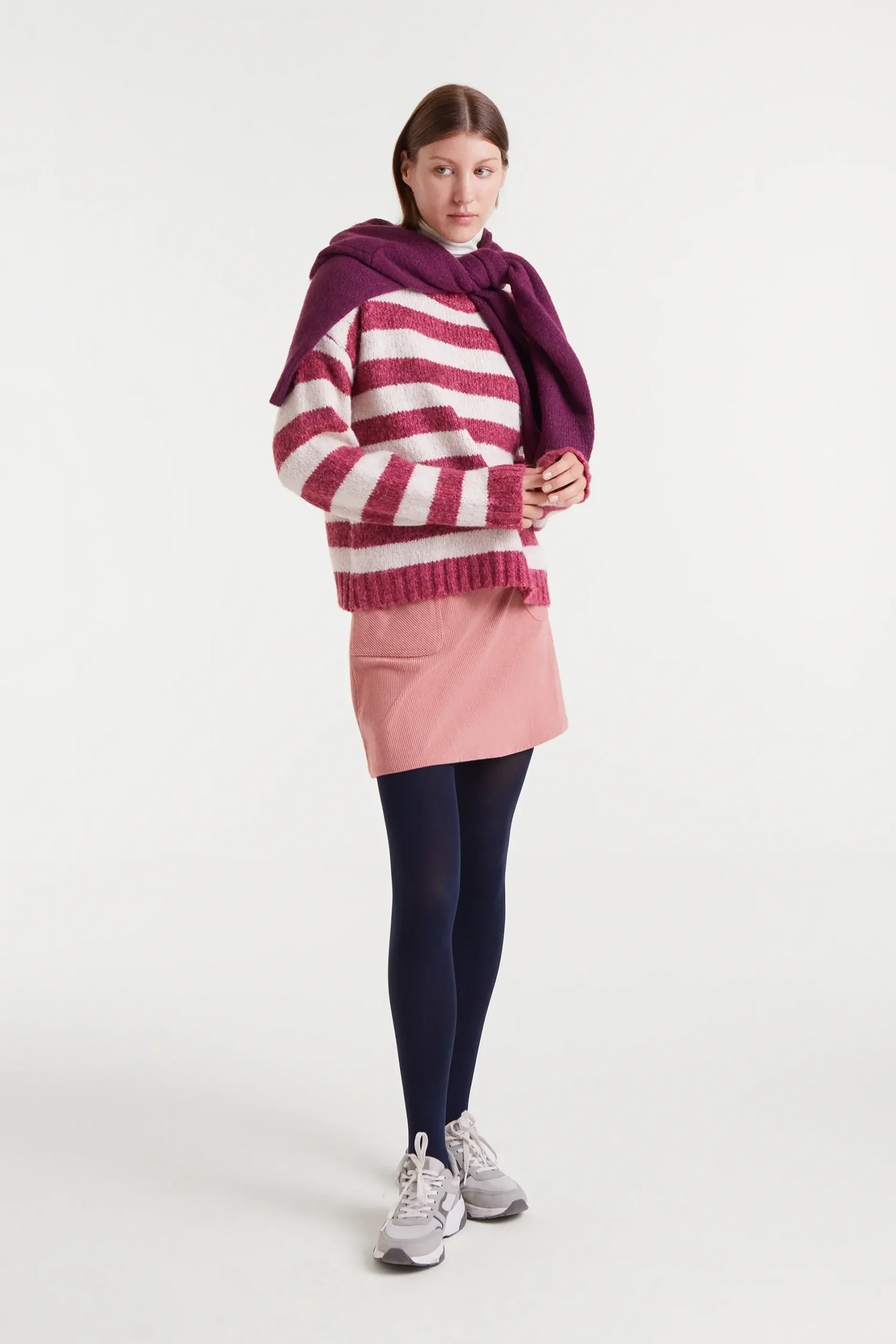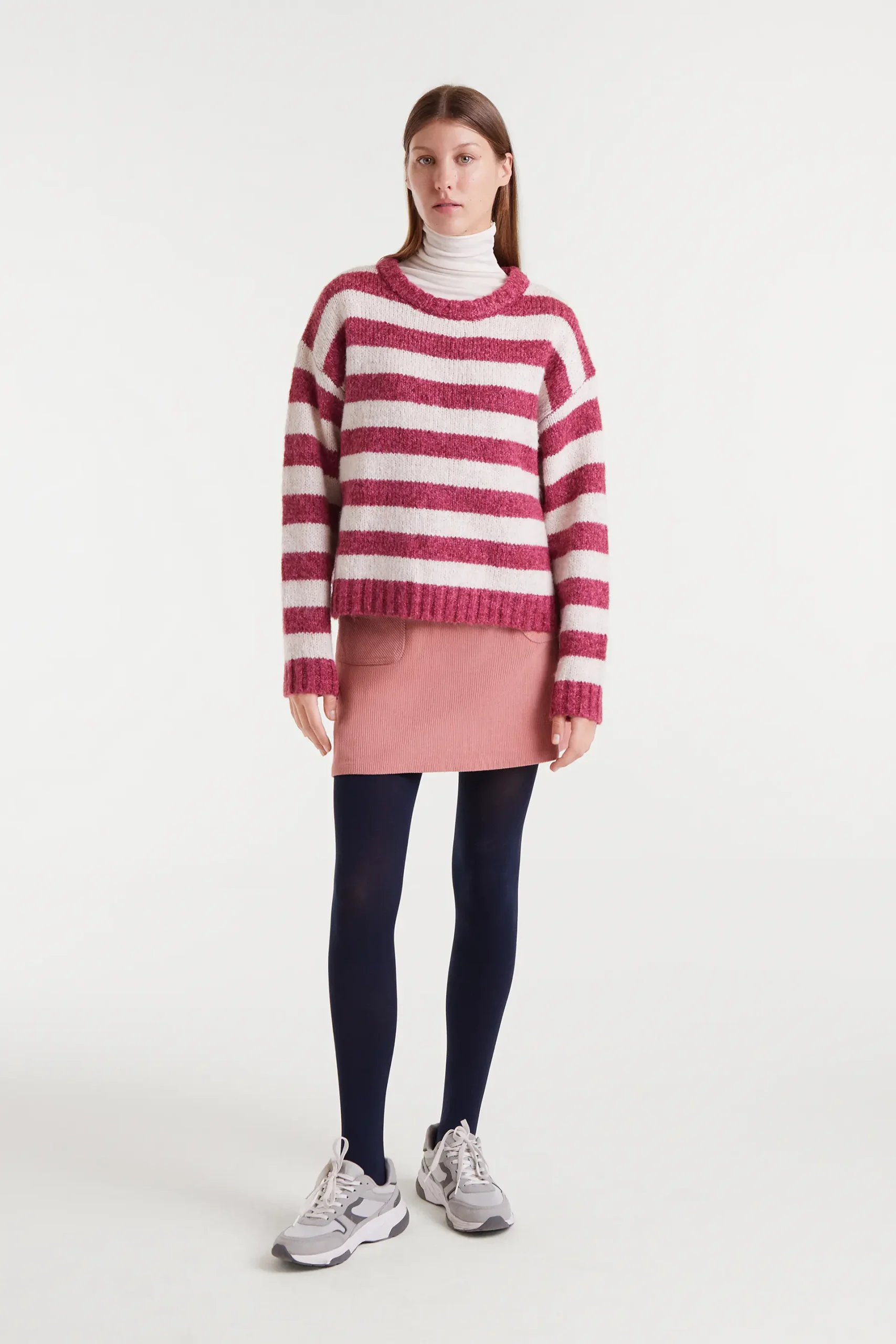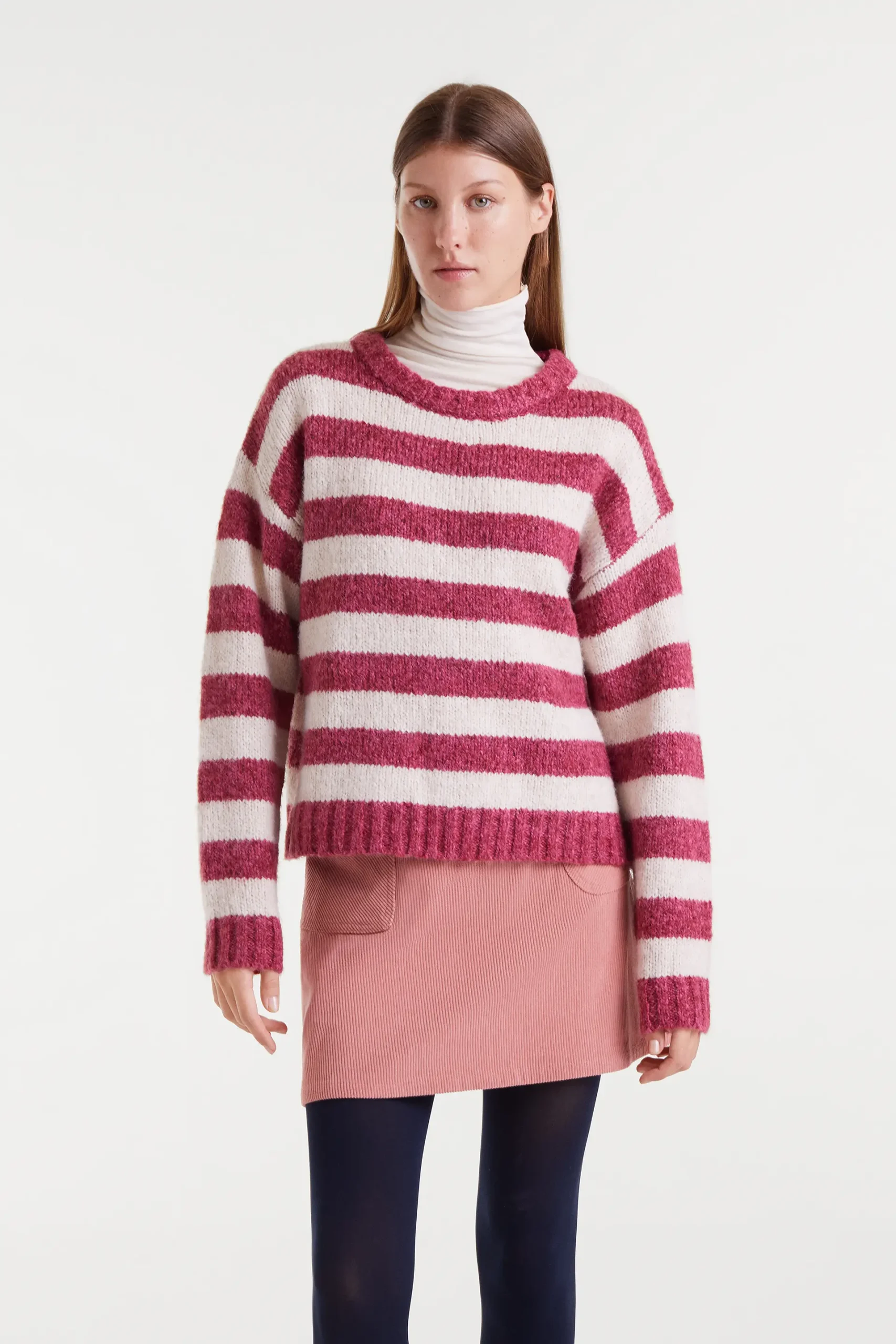Jersey punto con rayas de color blanco y fucsia. Cuello pico y manga larga con hombro ligeramente caído. La modelo mide 177 cm y lleva la talla S.