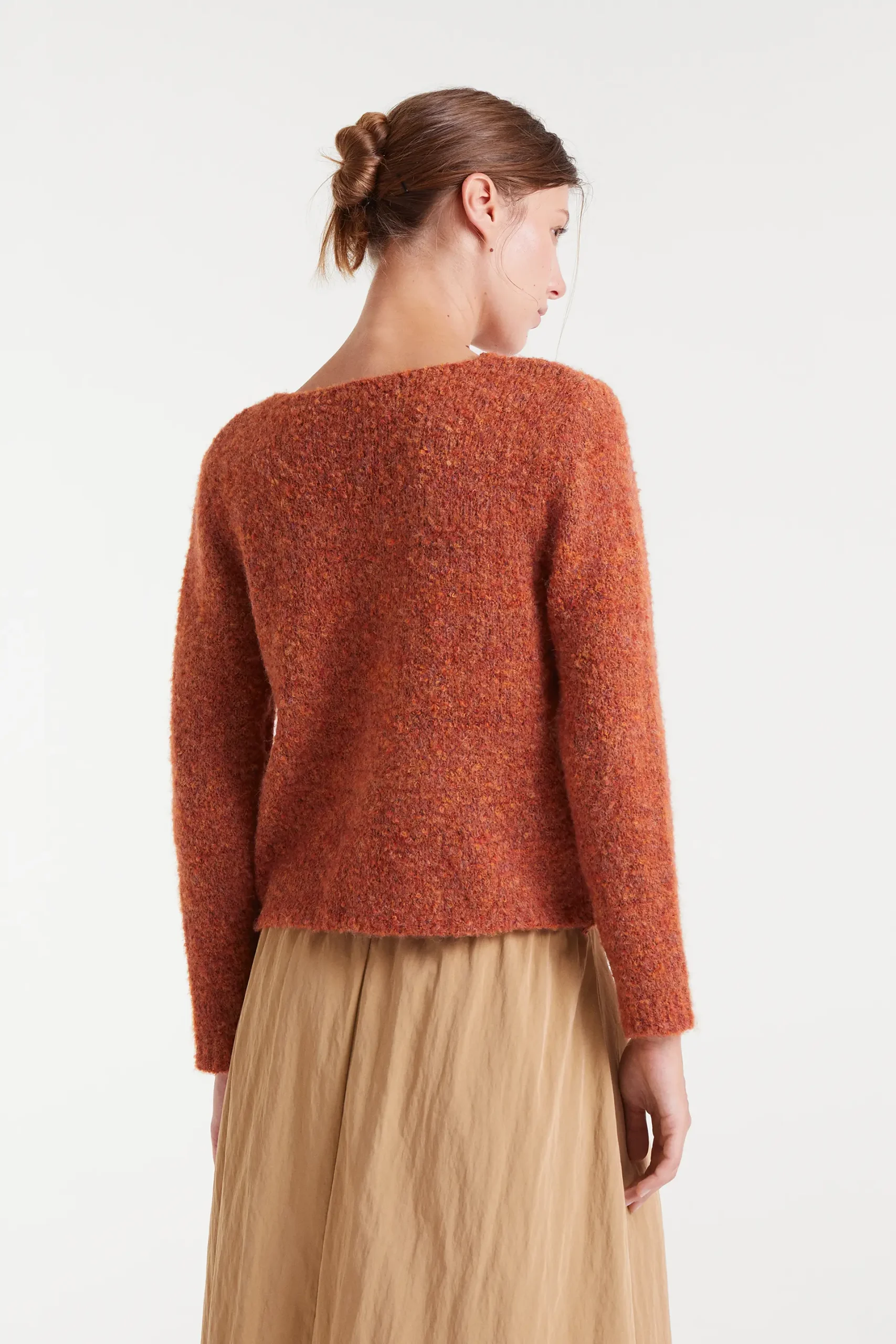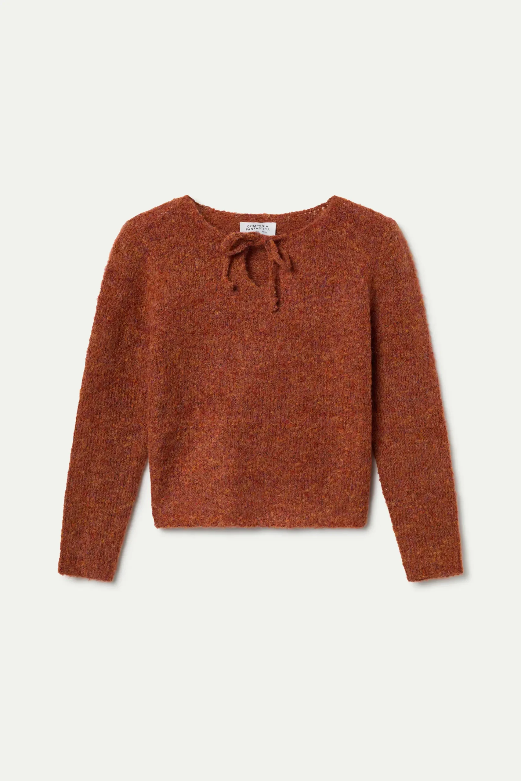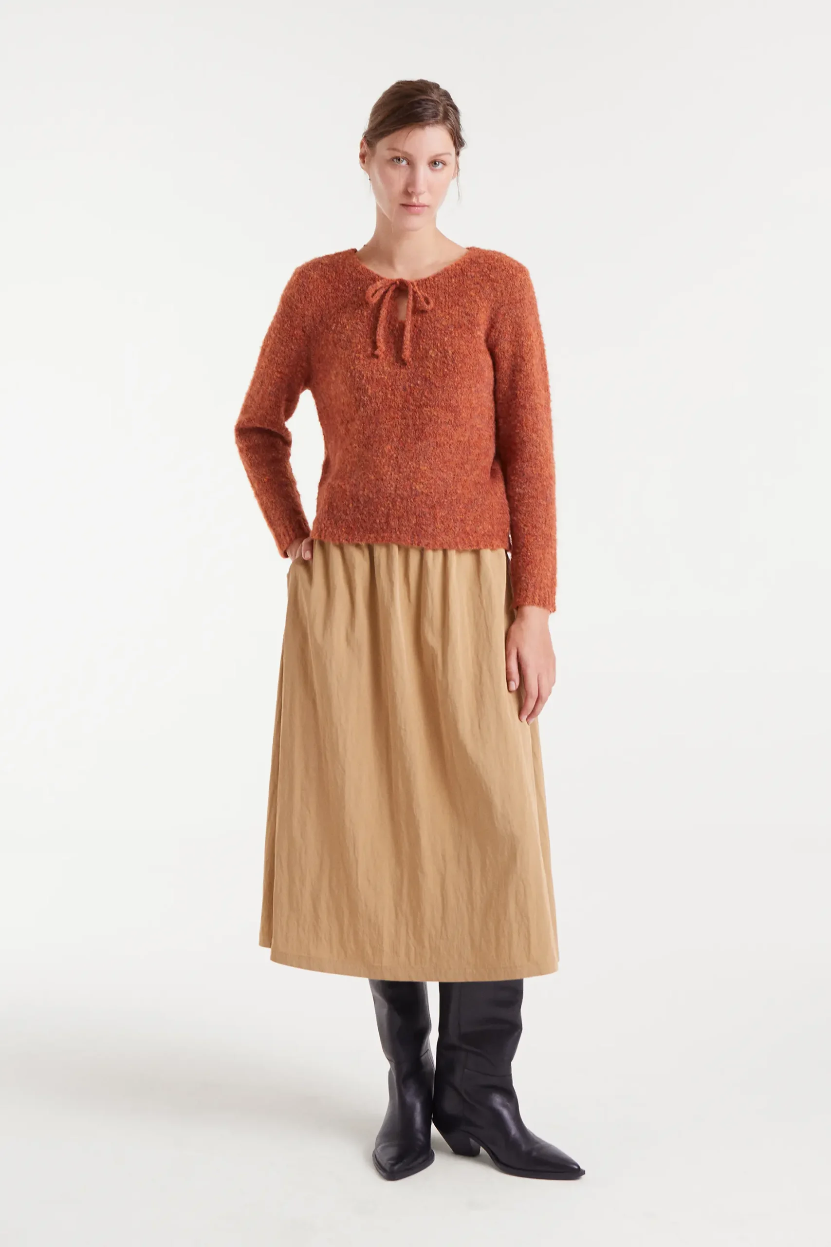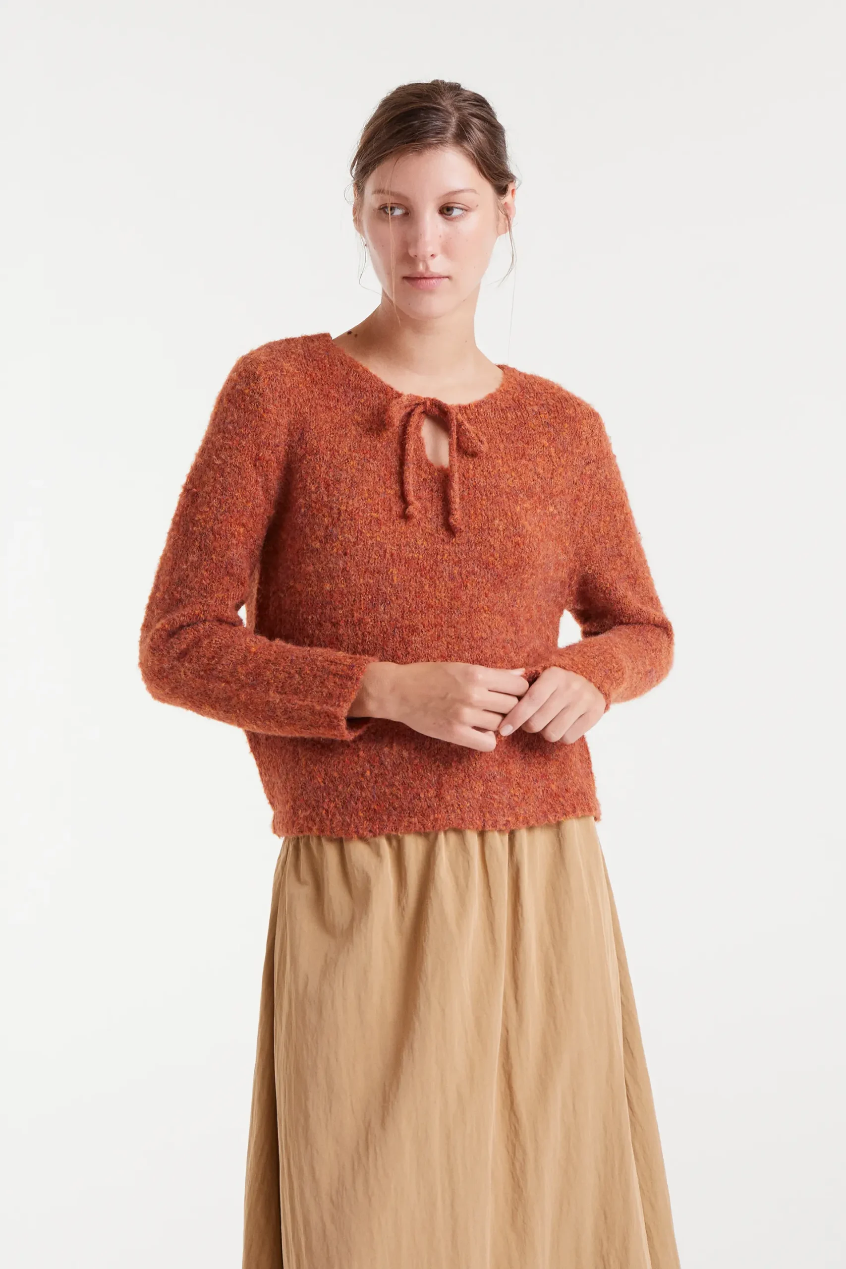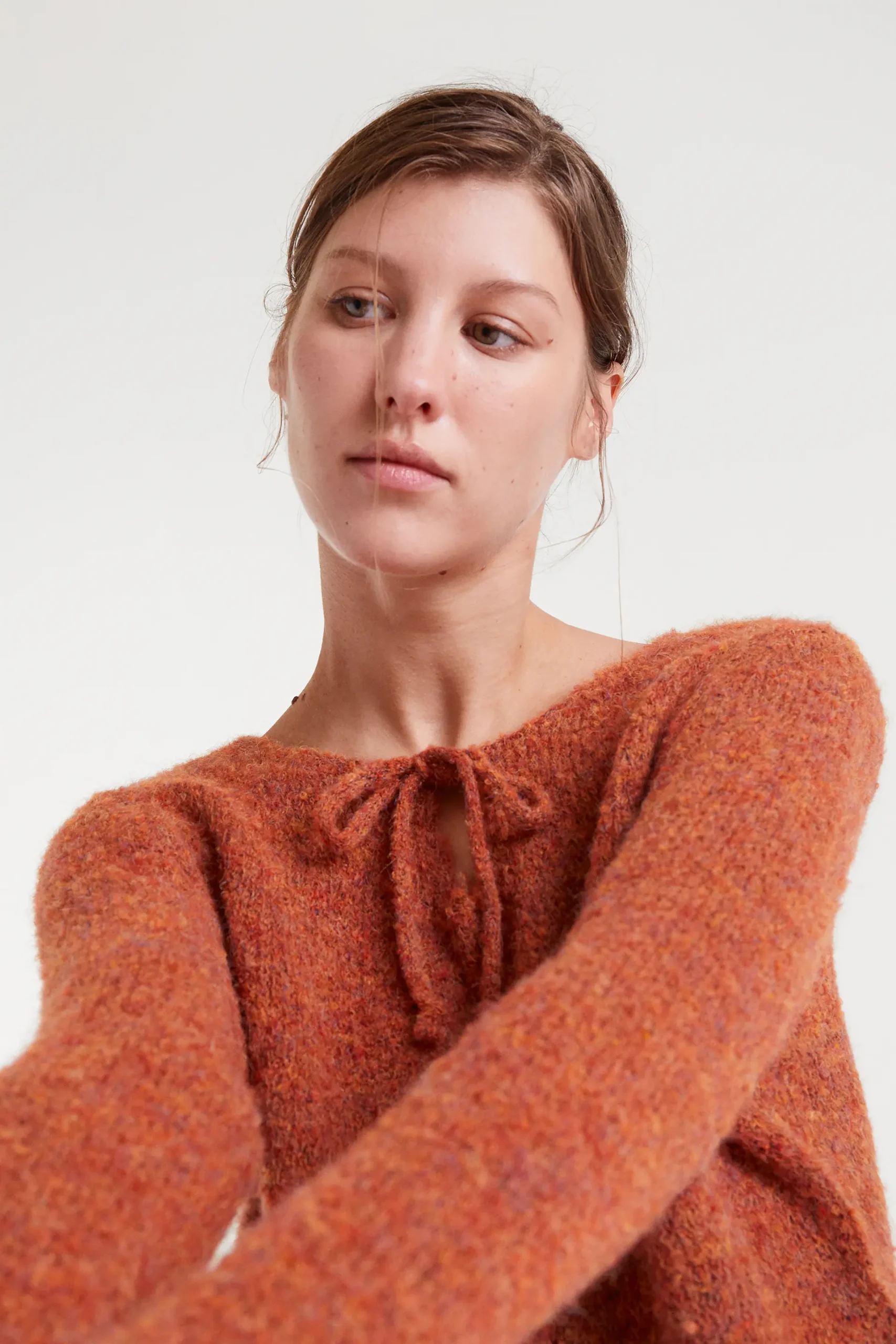 Jersey punto con textura de color naranja. Cuello redondo con escote nudado en forma de lazo. Manga larga. La modelo mide 177 cm y lleva la talla S.