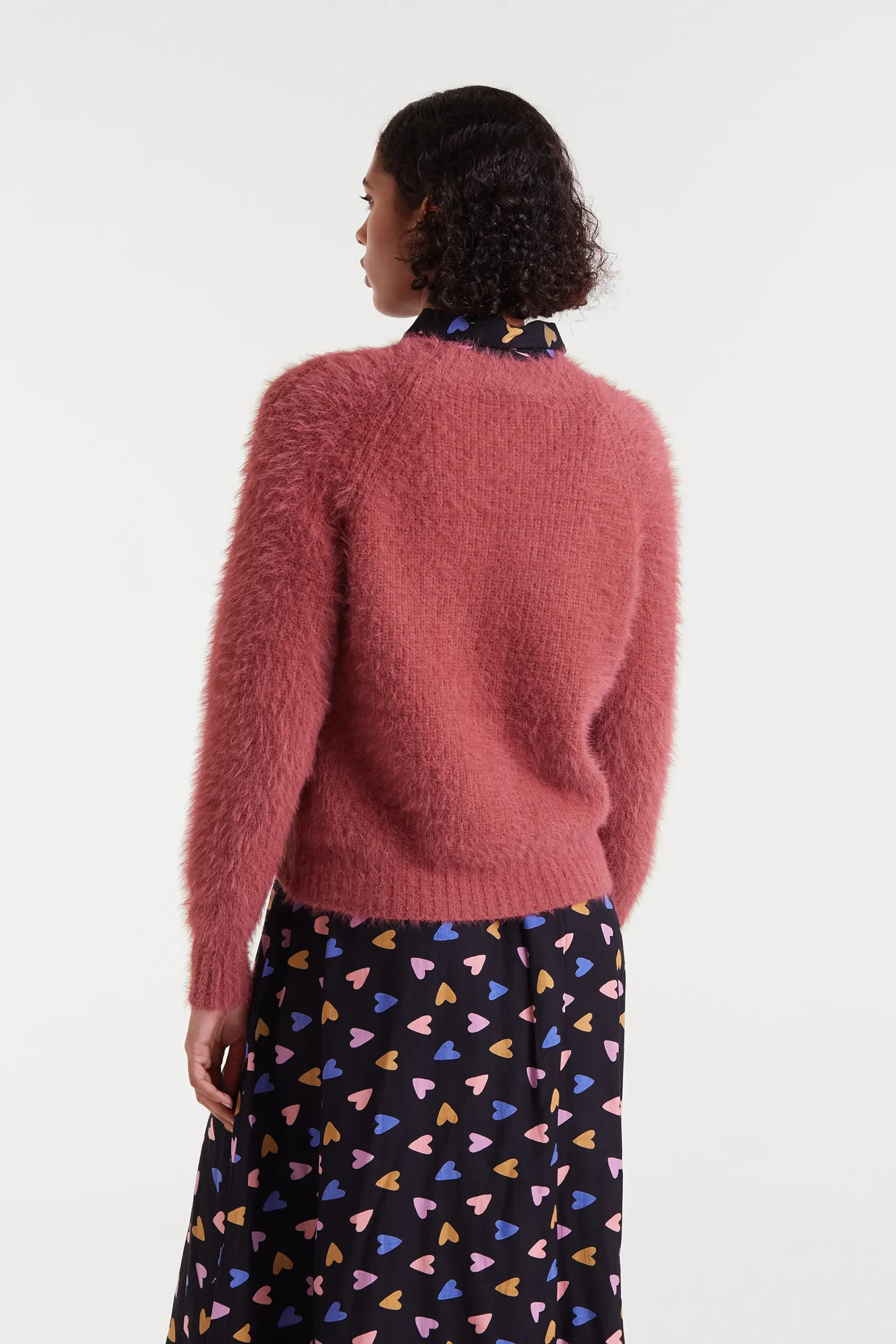 Jersey punto con textura de color rosa. Cuello redondo y manga larga. Detalles en rib. La modelo mide 175 cm y lleva la talla S.