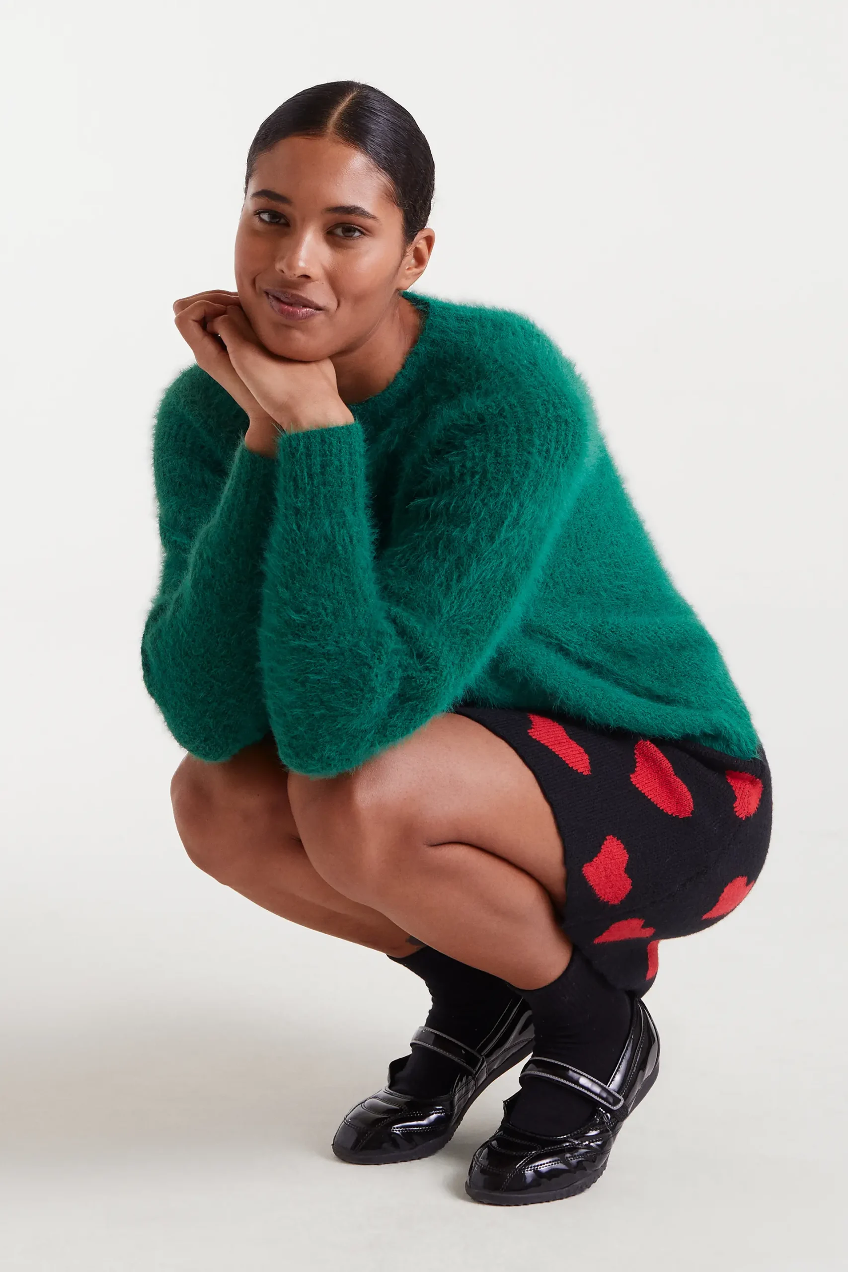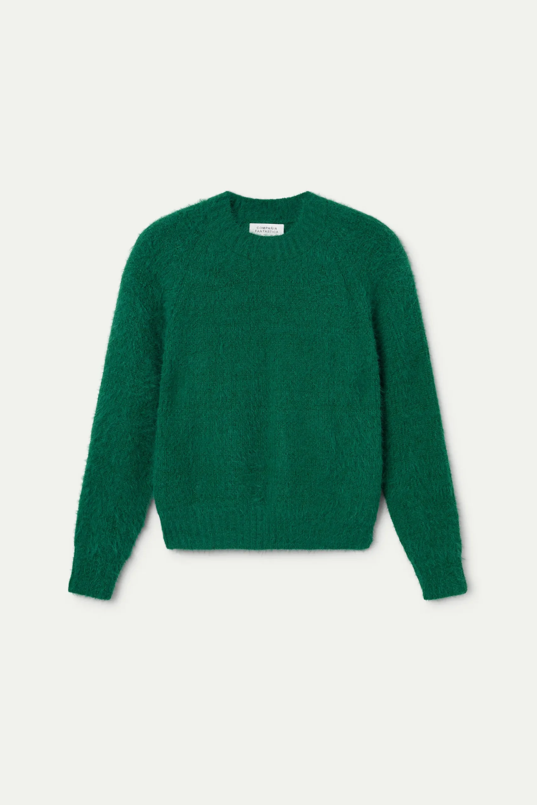 Jersey punto con textura de color verde. Cuello redondo y manga larga. Detalles en rib. La modelo mide 175 cm y lleva la talla S.