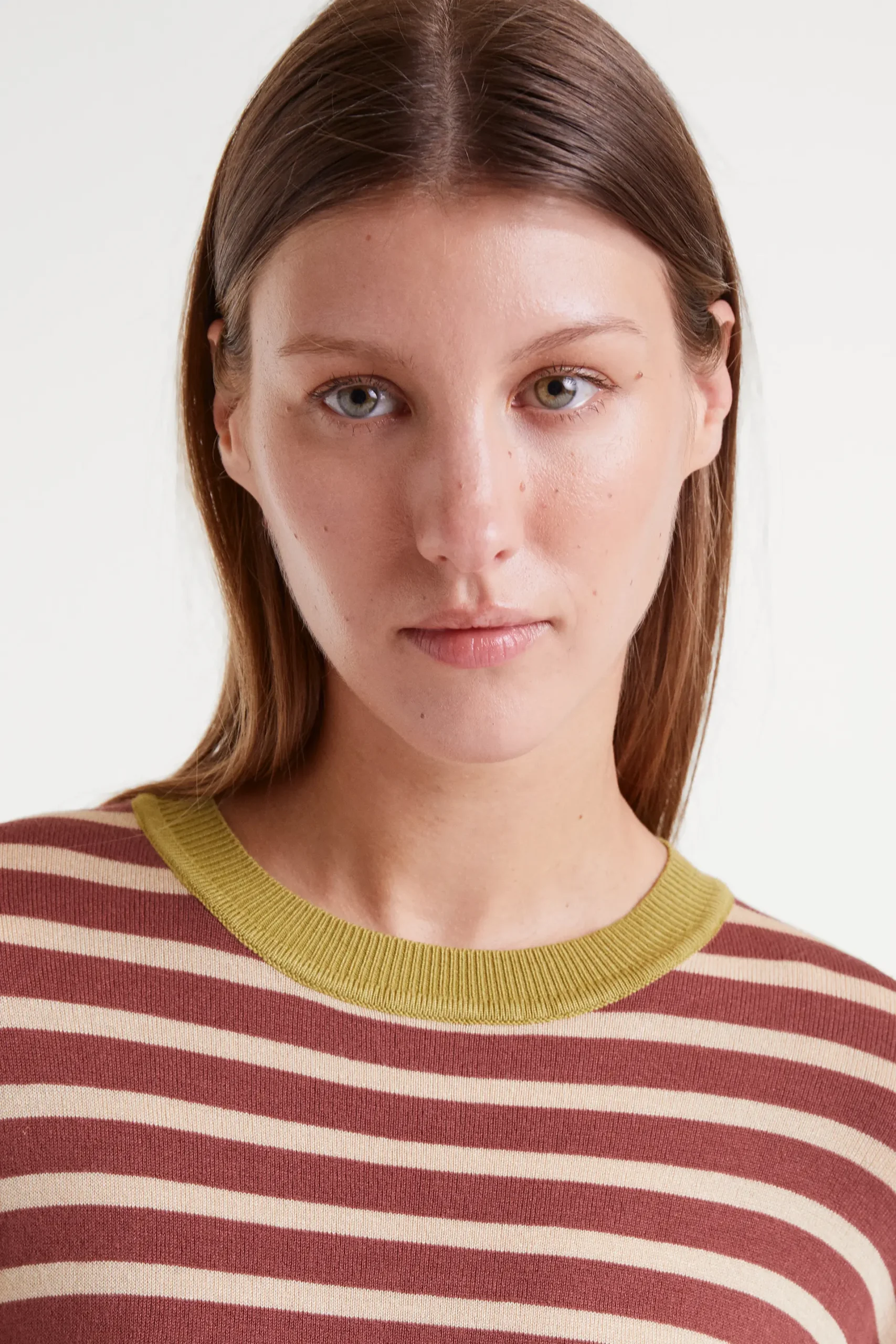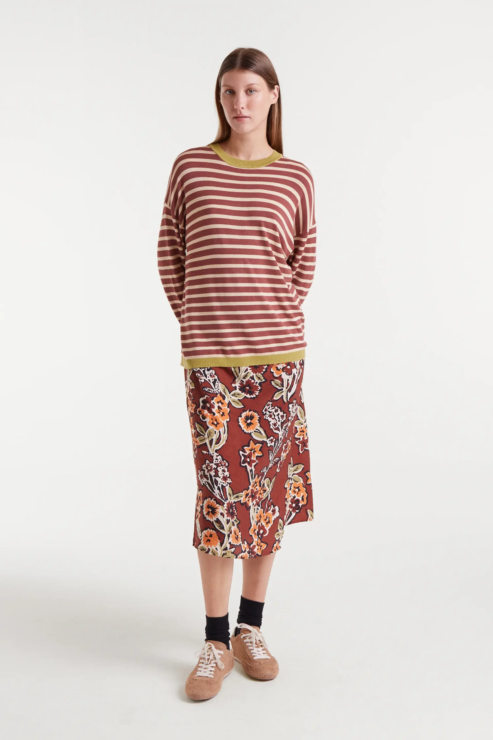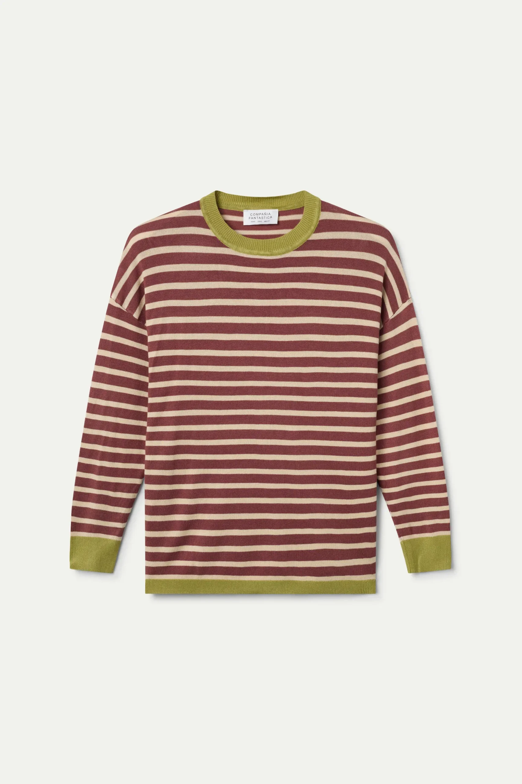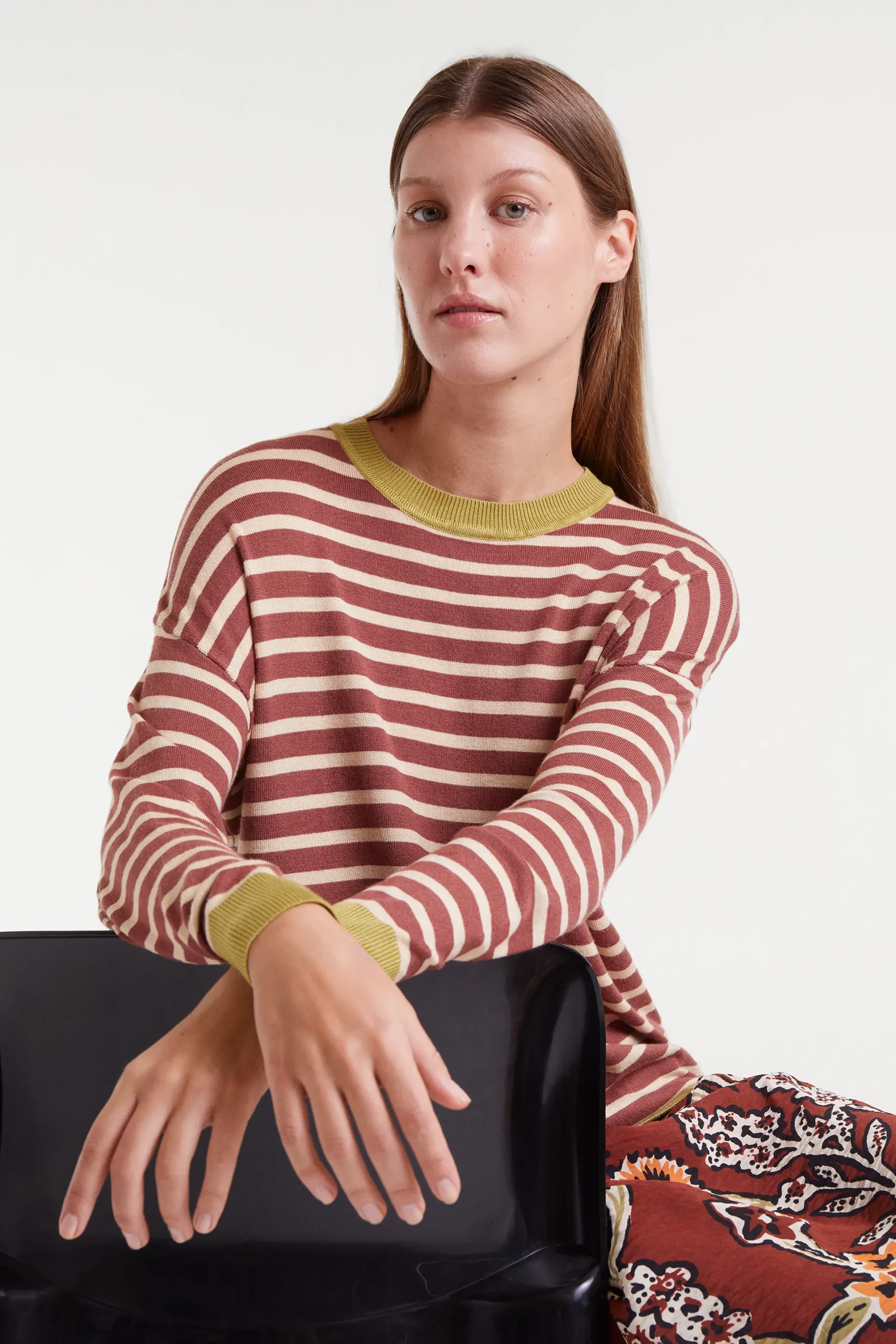 Jersey punto de rayas de color marrón y blanco. Con cuello redondo y manga larga con hombro ligeramente caído. Detalles con acabados en rib. La modelo mide 177 cm y lleva la talla S.