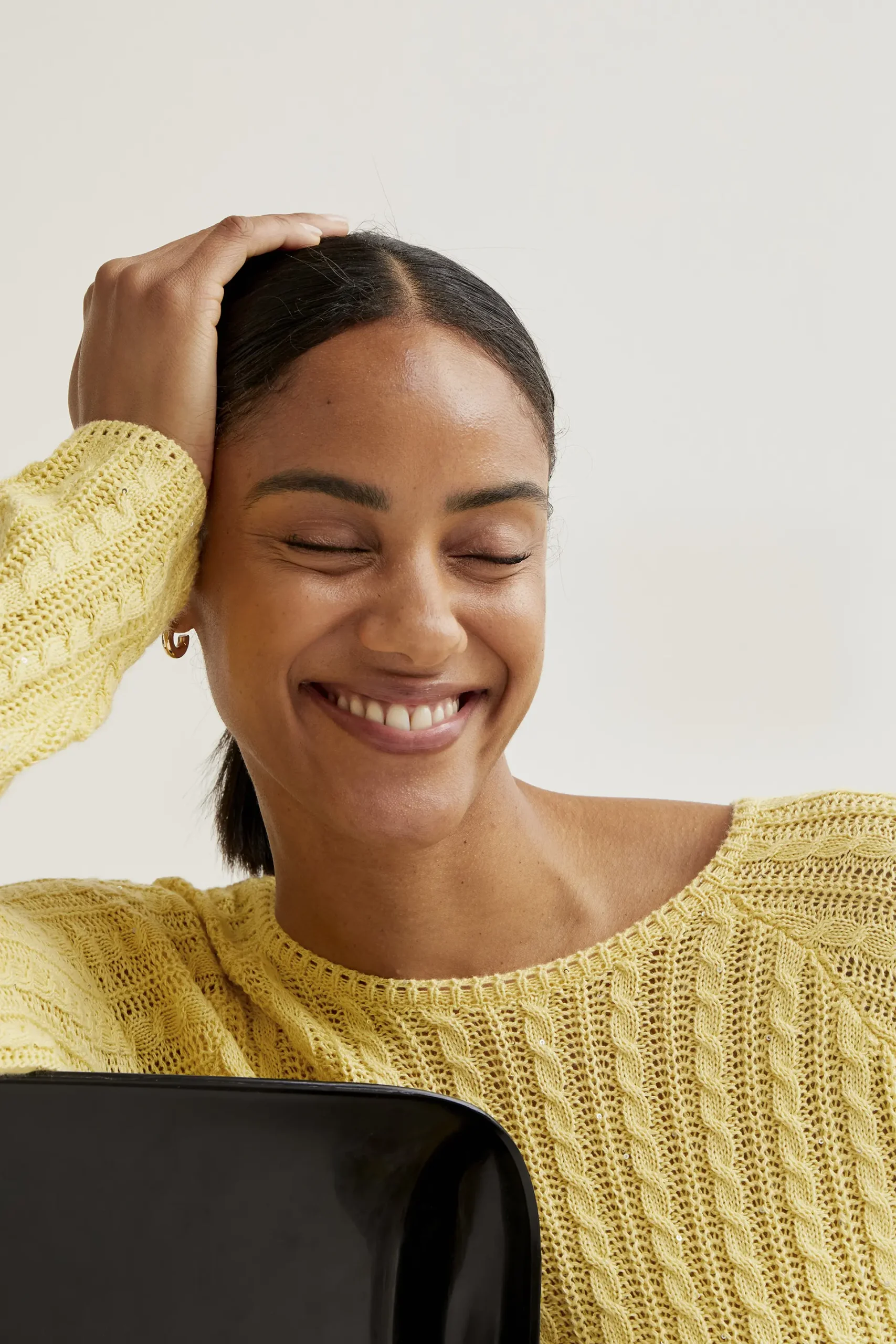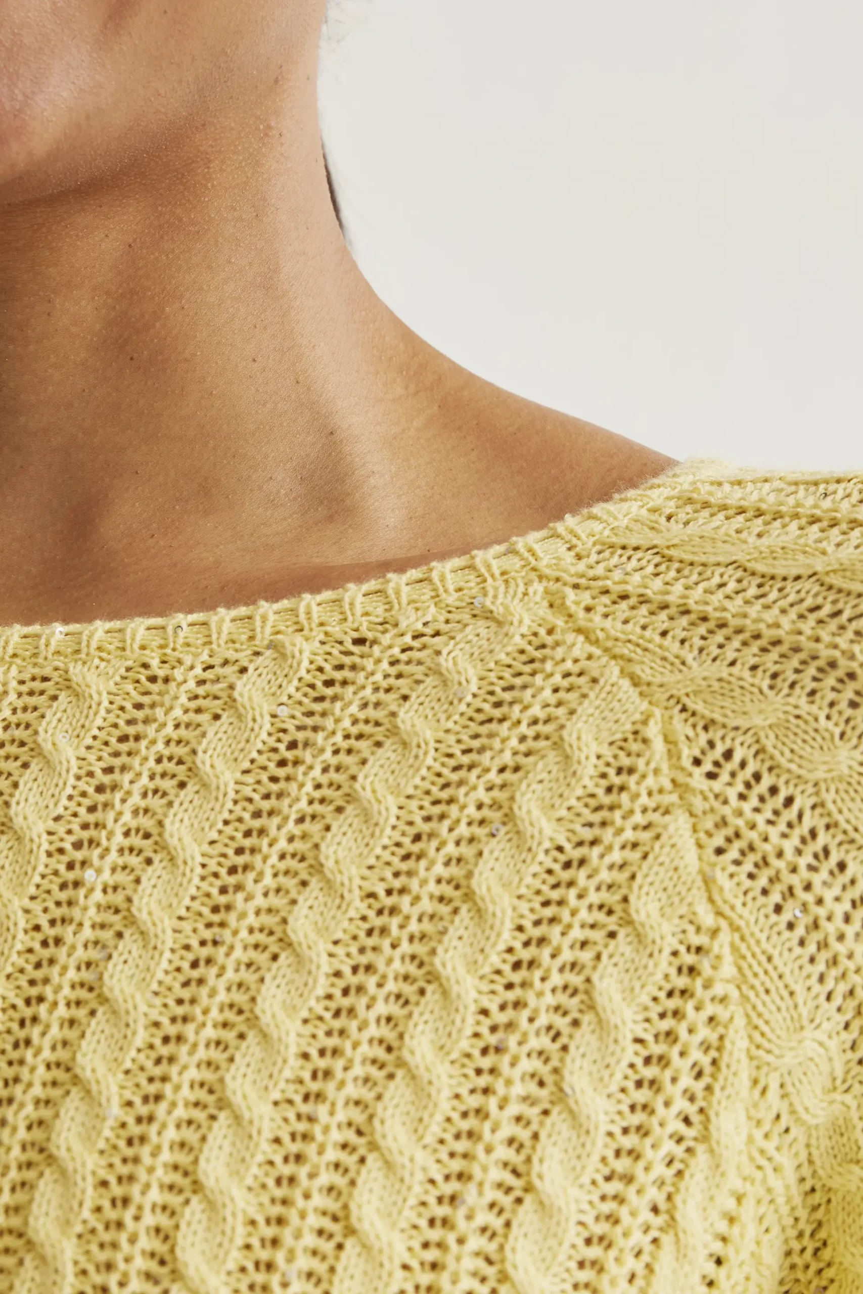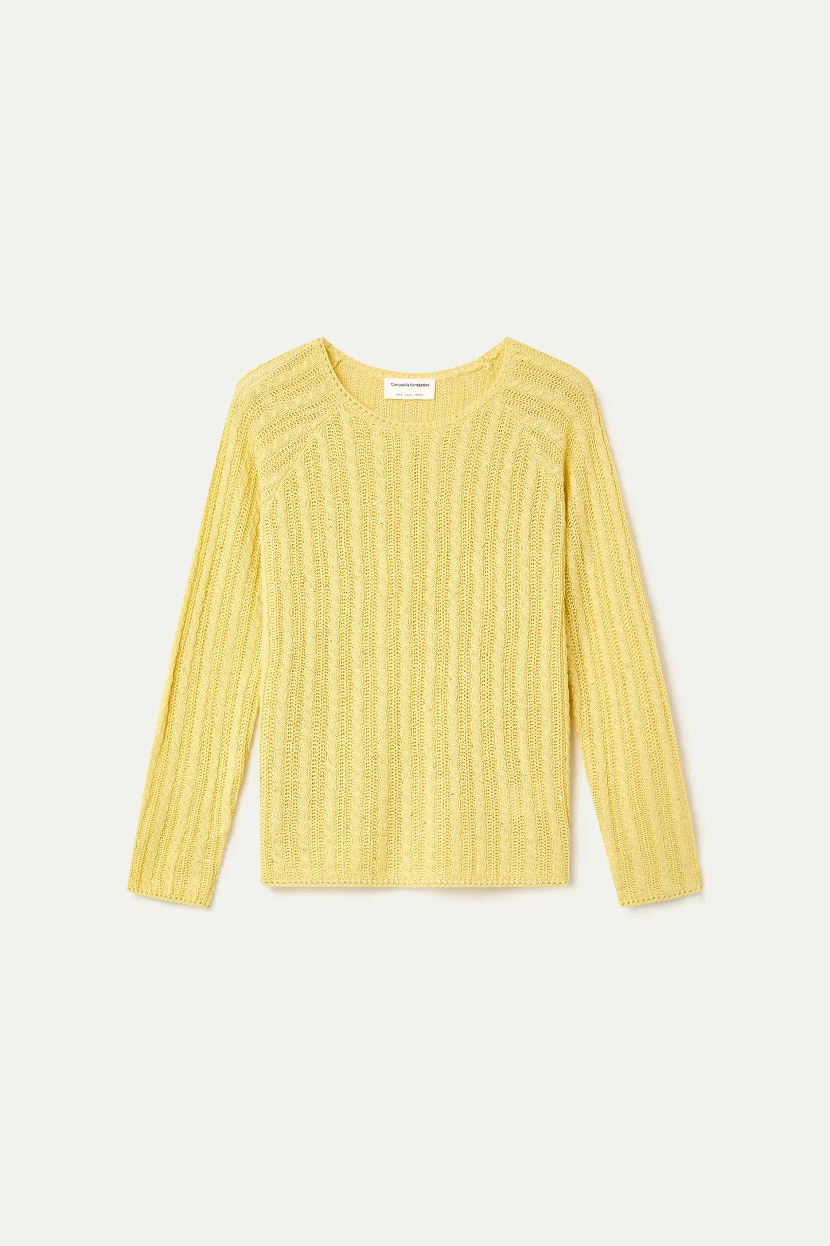 Jersey de tejido punto de color amarillo. Cuello redondo y manga larga. La modelo mide 173 cm y lleva la talla S.