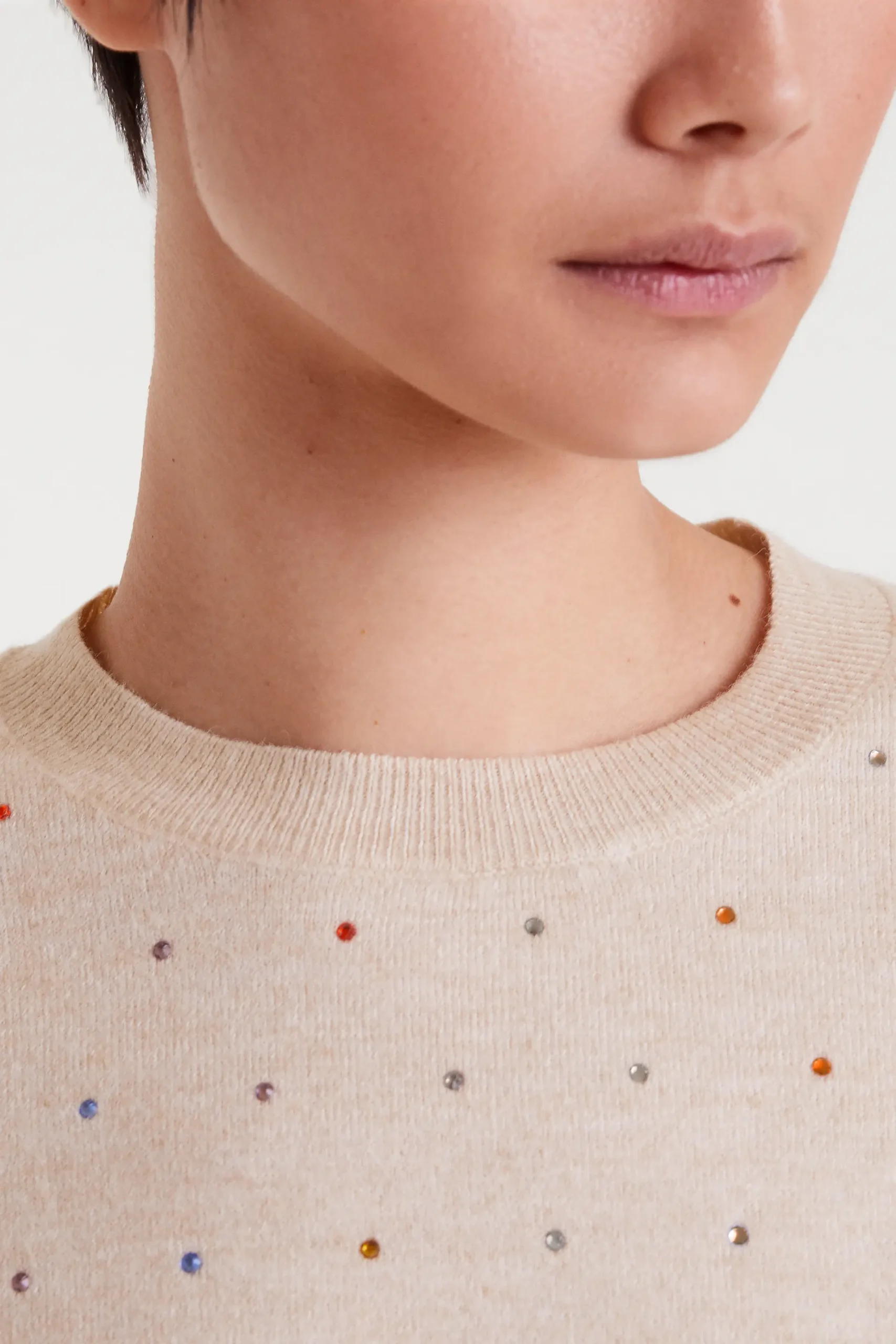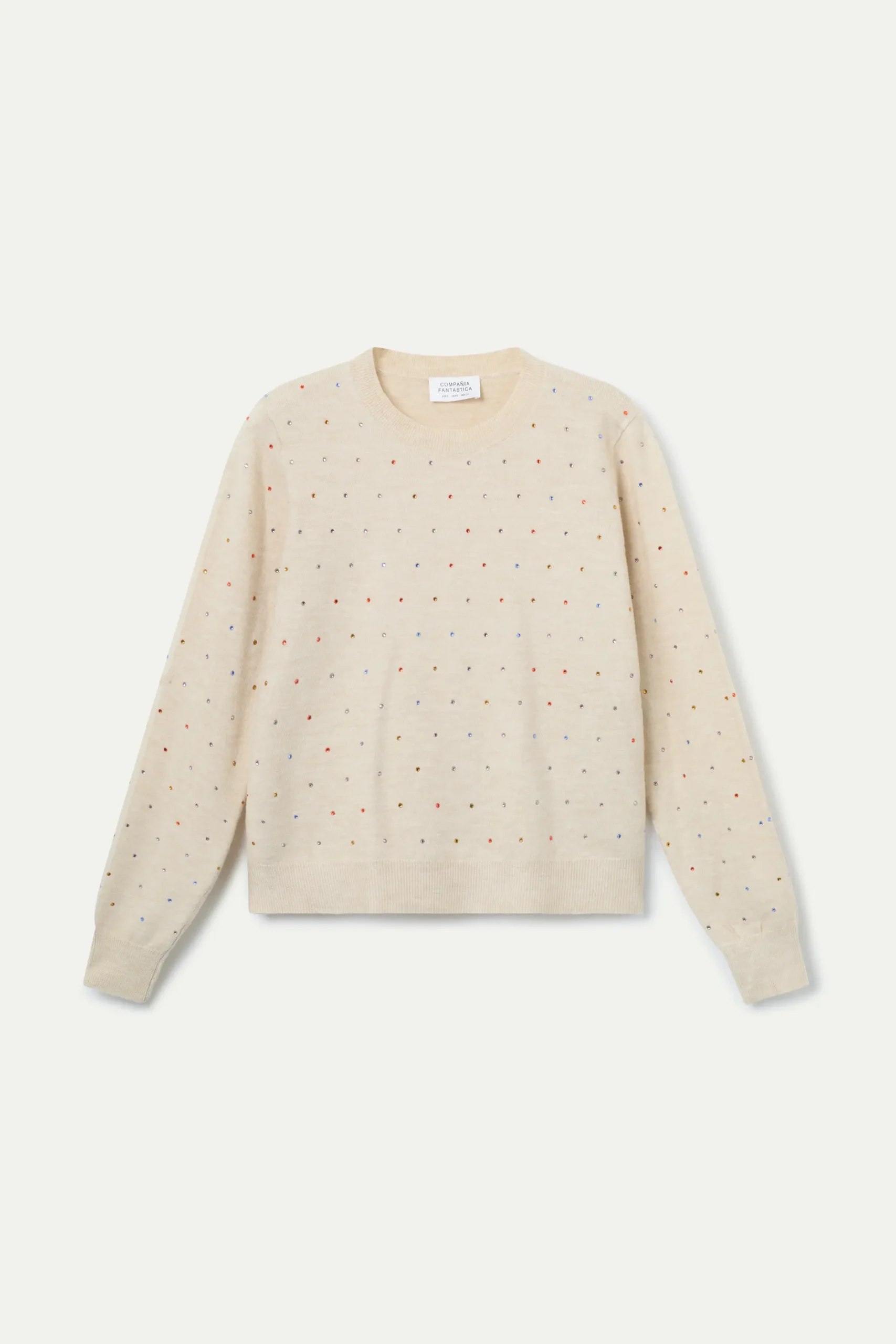 Jersey con tejido punto fino de color beige. Cuello redondo y manga larga. Detalles con aplicaciones brillantes multicolor. Acabados en rib. La modelo mide 177 cm y lleva la talla S.