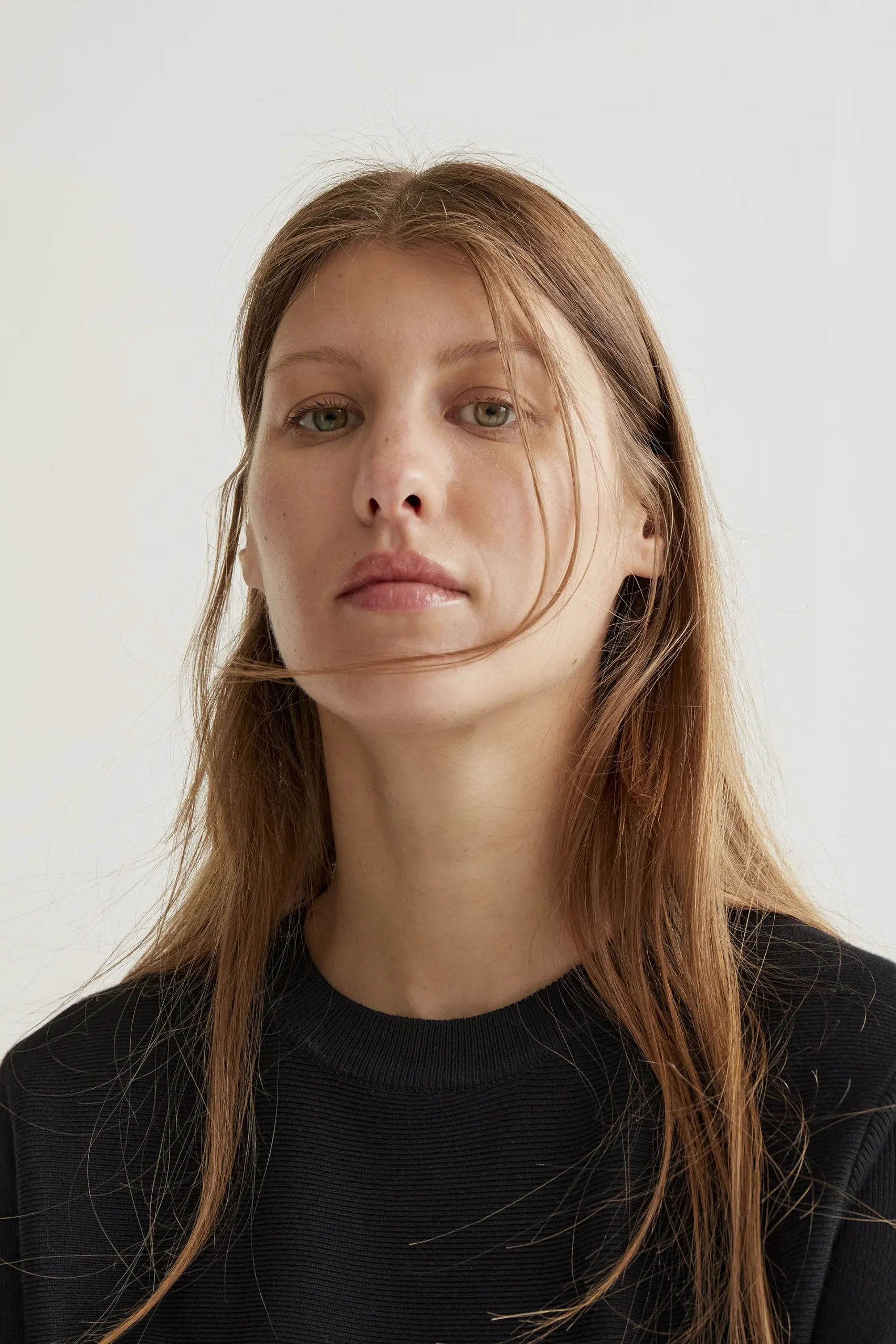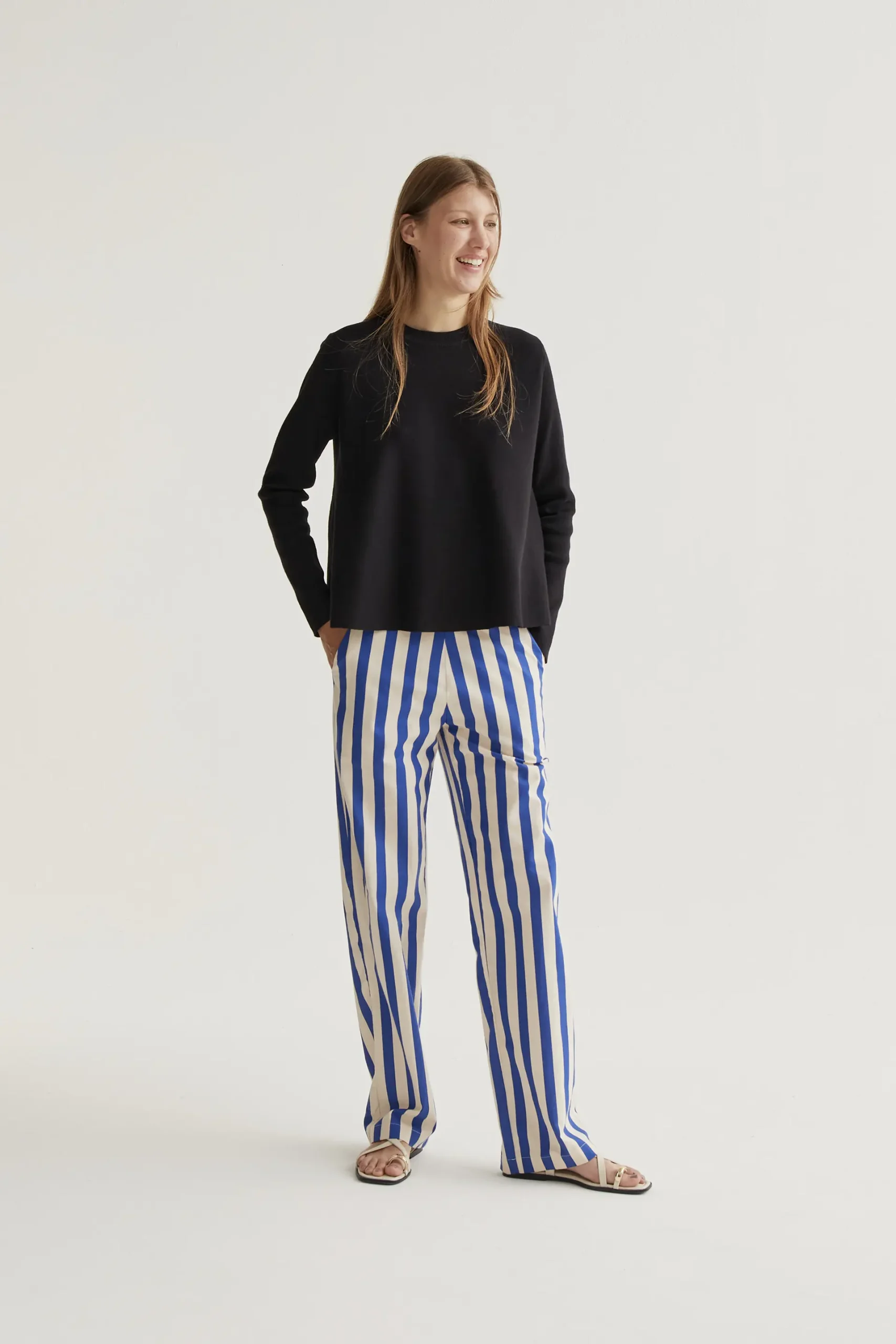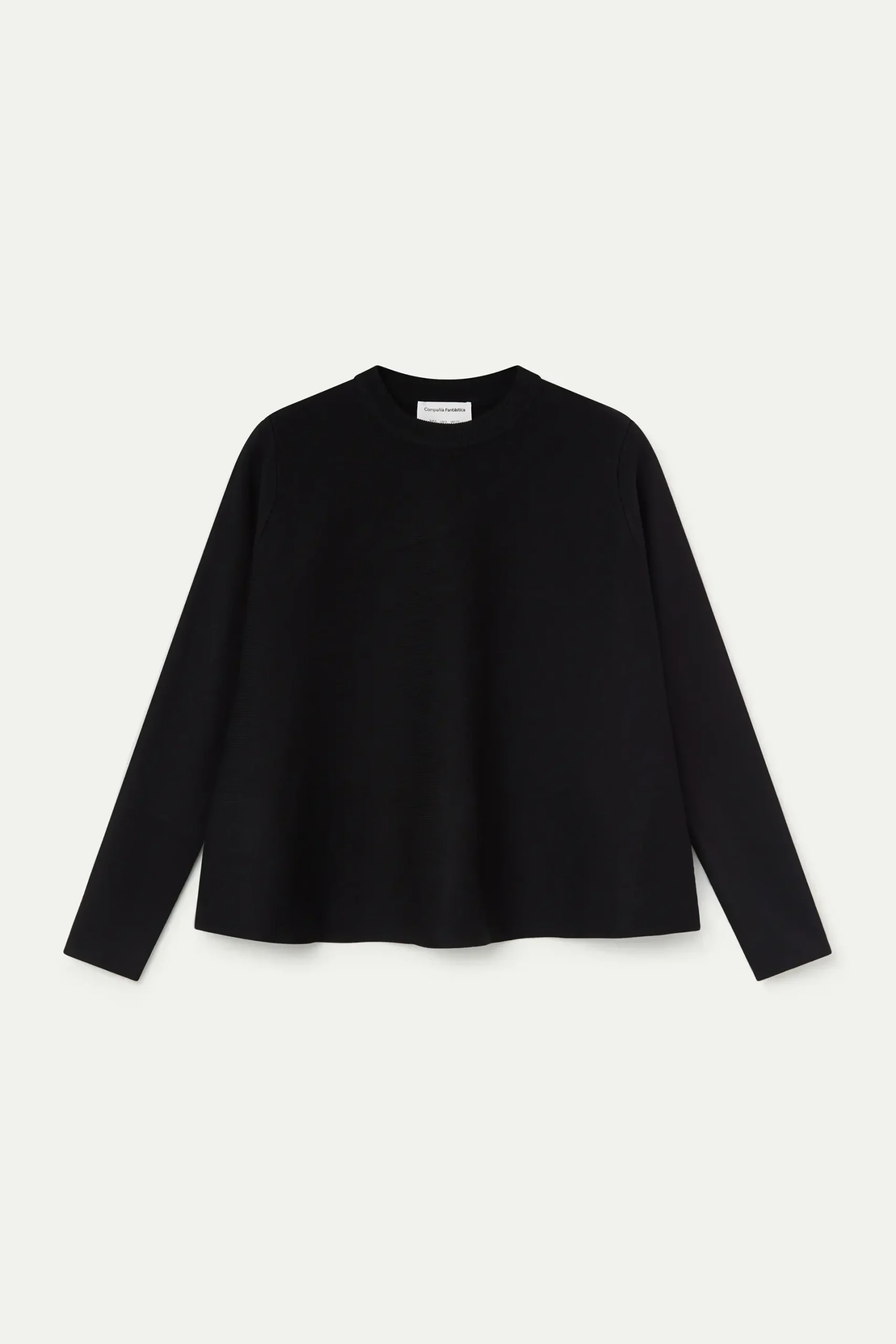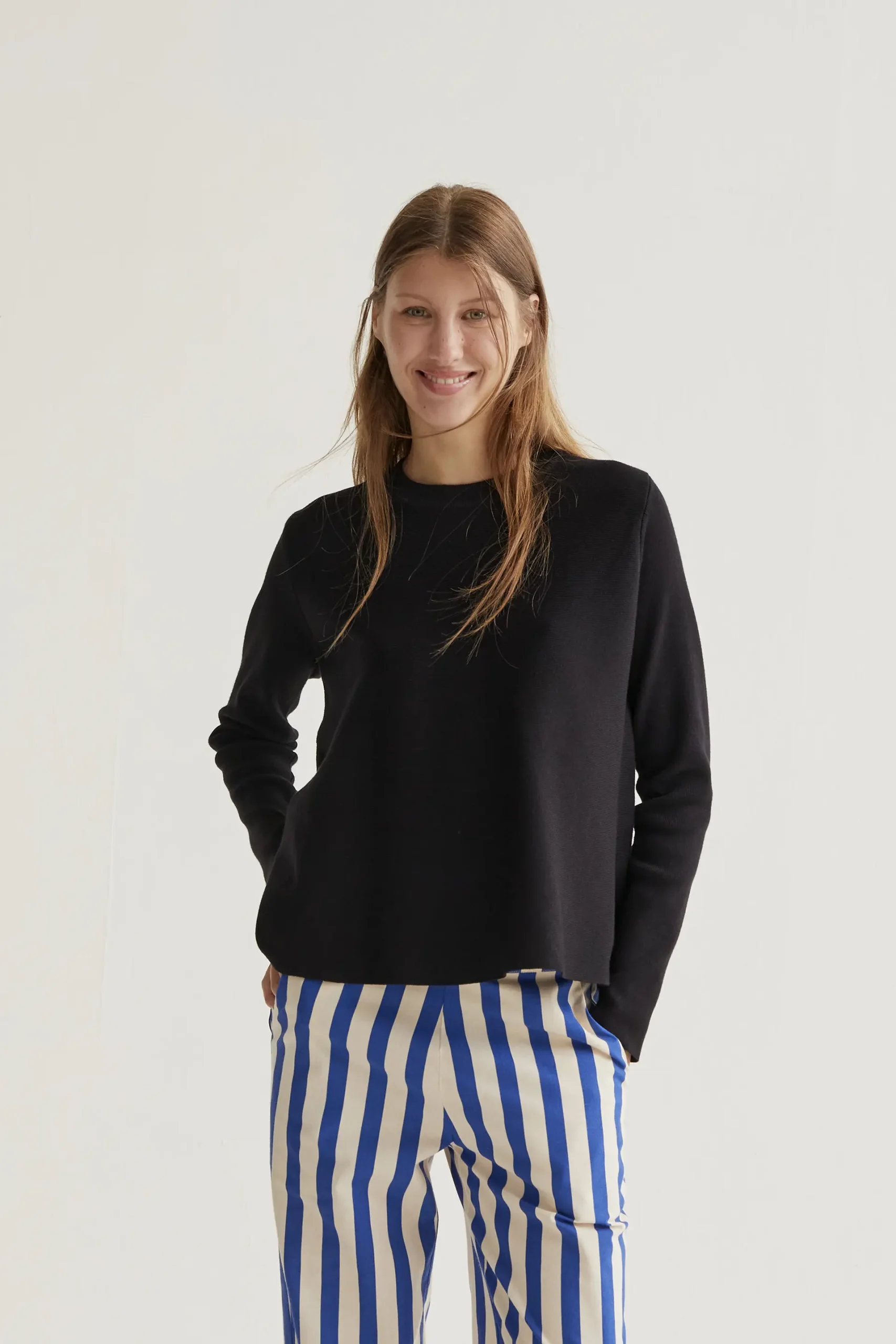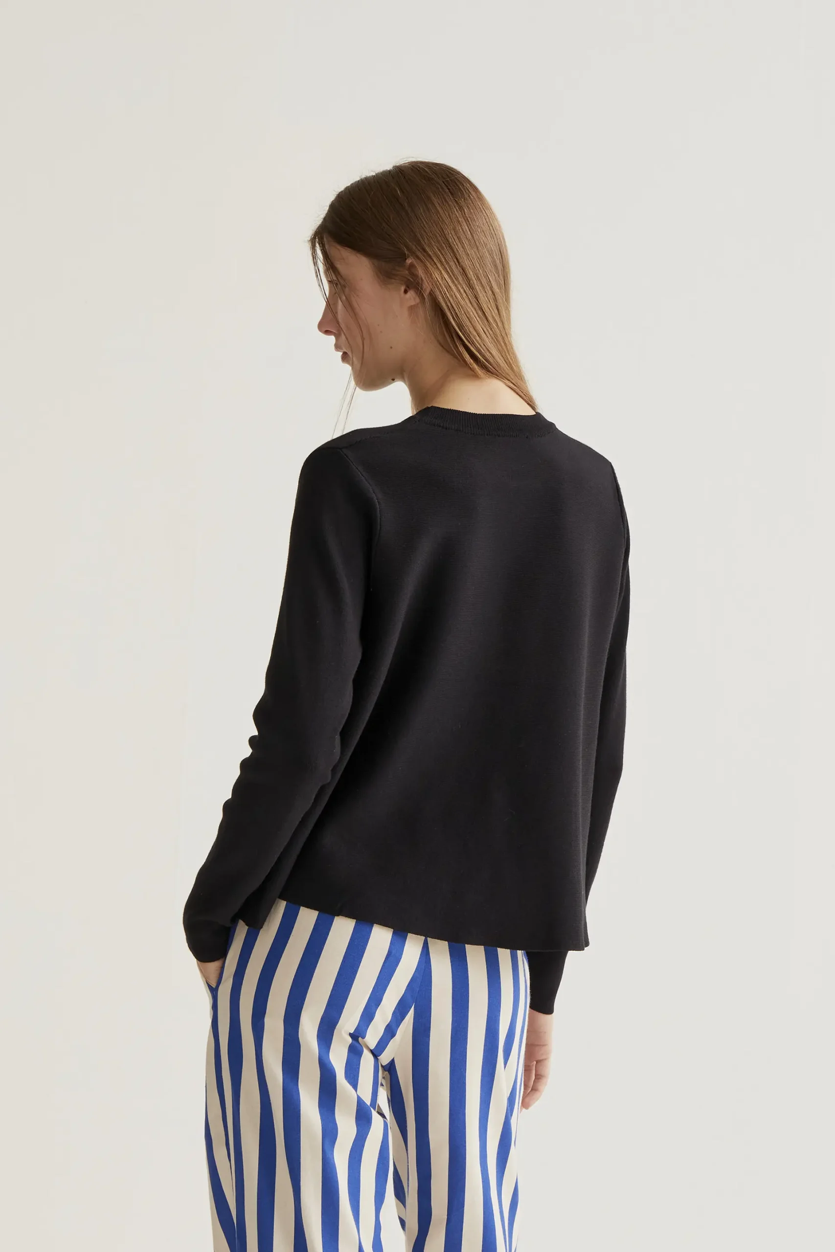 Jersey de tejido punto de color negro. Cuello redondo y manga larga. Detalles acabados en rib. La modelo mide 177 cm y lleva la talla S.