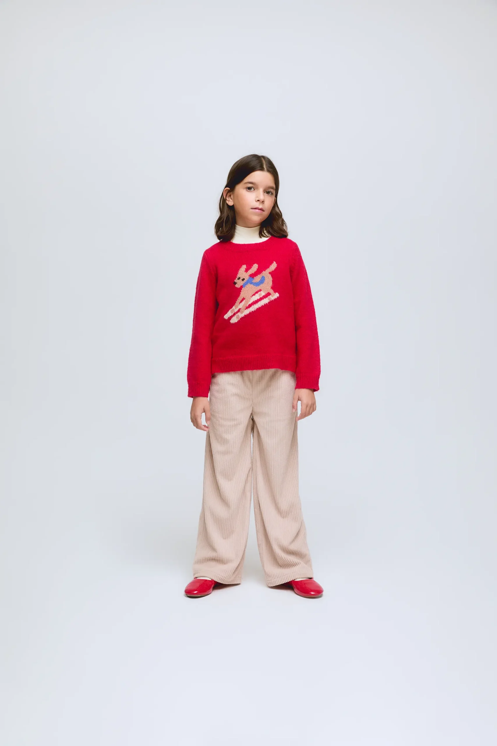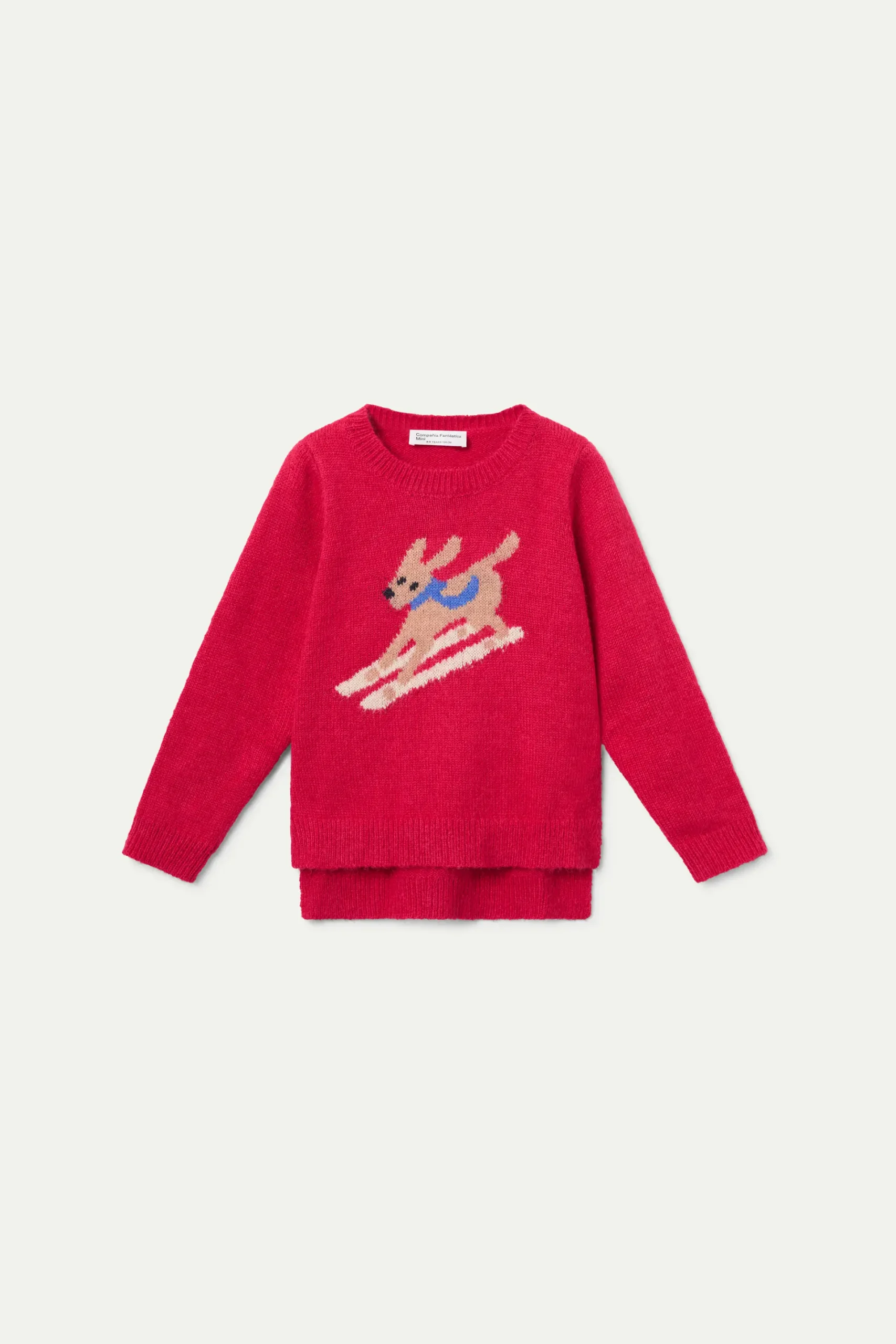 Jersey rojo de punto. Cuenta con un diseño divertido con un perro esquiador en la parte frontal. Corte desigual y cuello redondo, con bajo ligeramente más largo en la parte trasera.