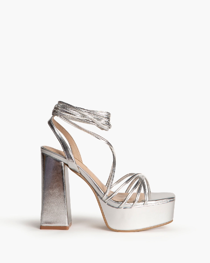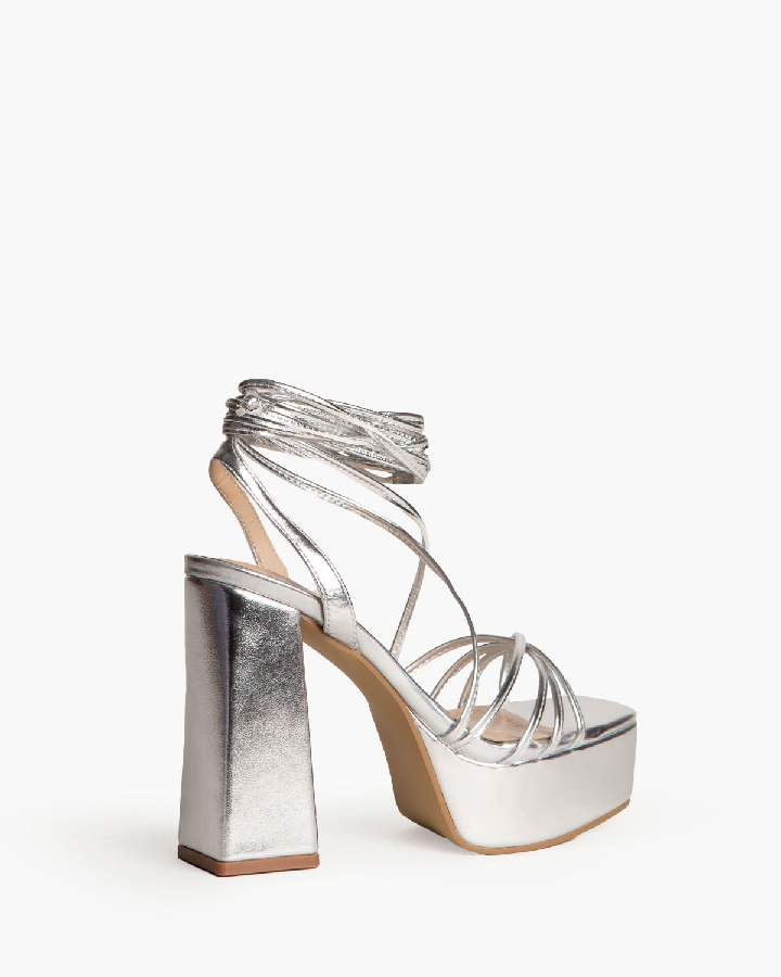 Sandalia de tacón alto con plataforma. Tiras finas en la parte delantera. Acabada en punta cuadrada. Cierre mediante tiras atadas al tobillo.